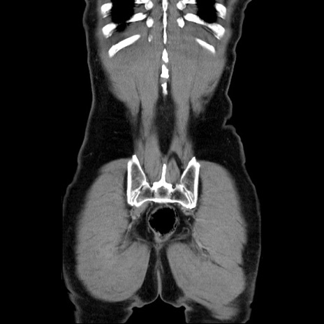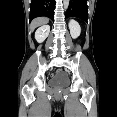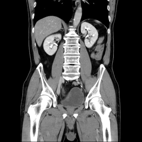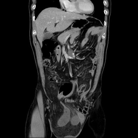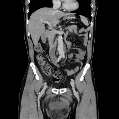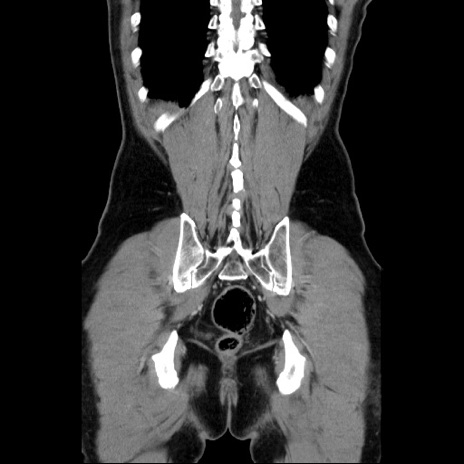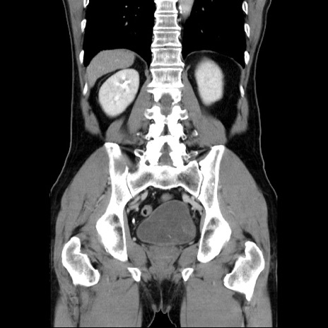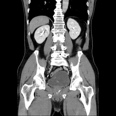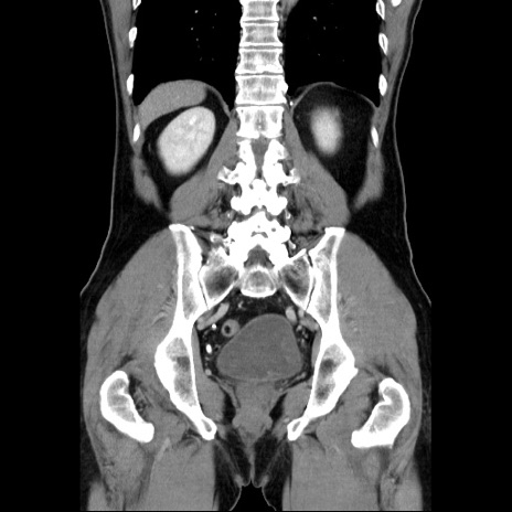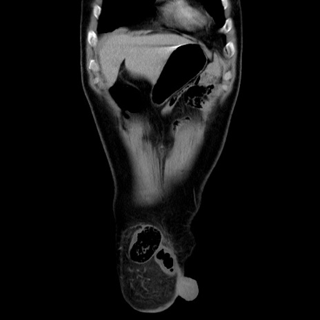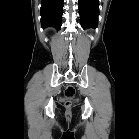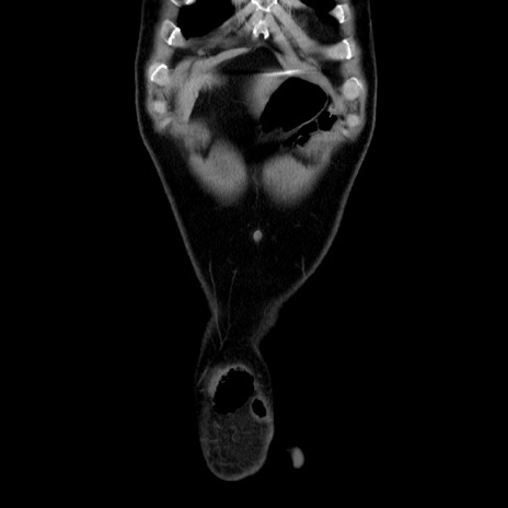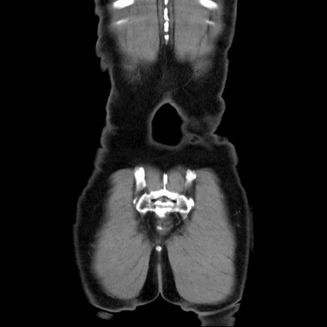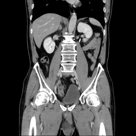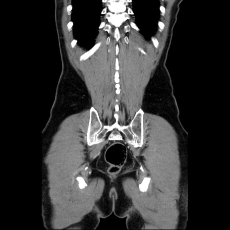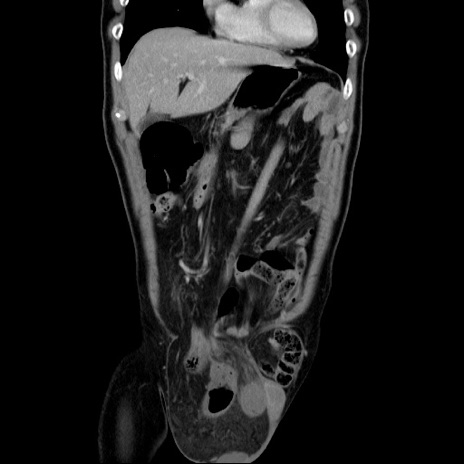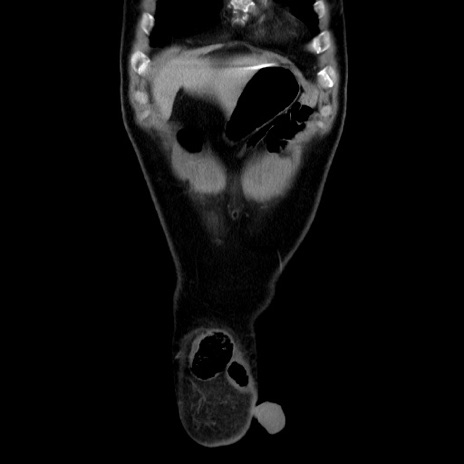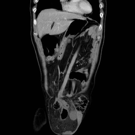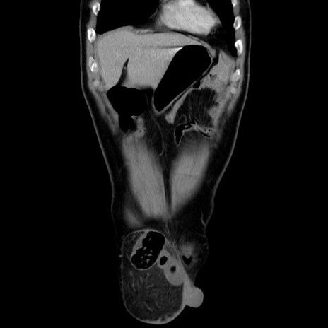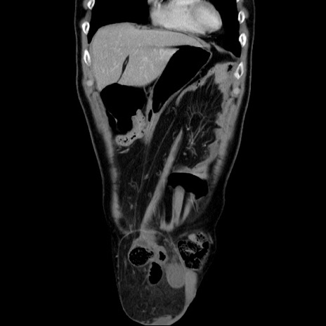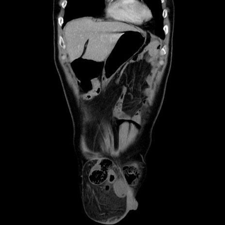 【症例】60歳代 男性 【主訴】右鼠径部膨隆 【現病歴】1年程前より右鼠径部膨隆あり。自己にて還納可能だったため放置していた。3時間前より右鼠径部の脱出を認め、還納困難となり受診。 【既往歴】高血圧 【身体所見】右鼠径部に小児頭大の膨隆あり。弾性硬であり、用手還納は困難。左鼠径部にも膨隆を認める。脱出はなし。 【データ】WBC 15500、CRP 測定なし