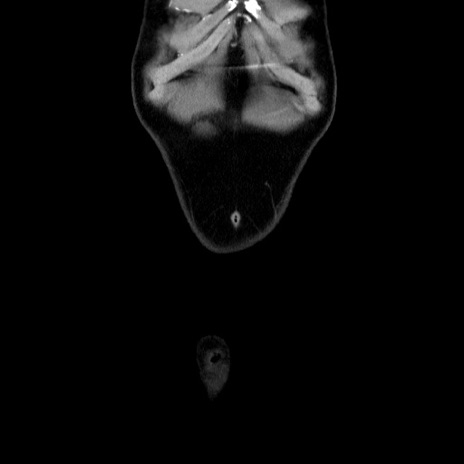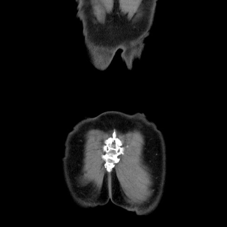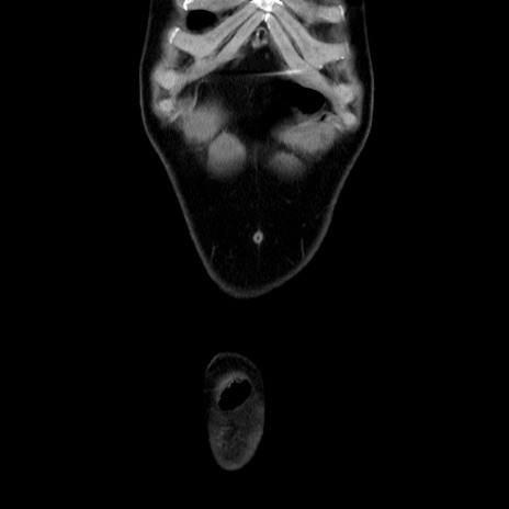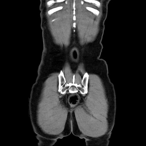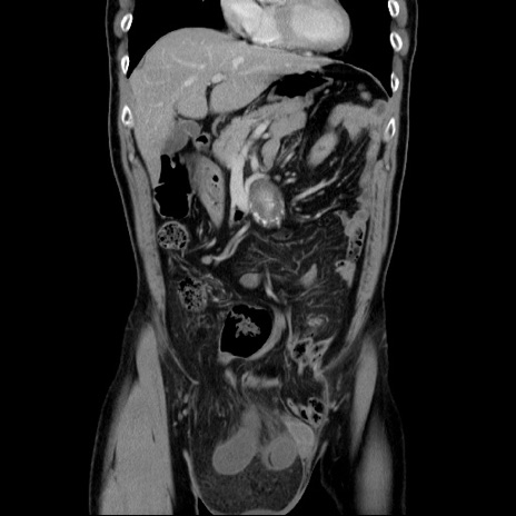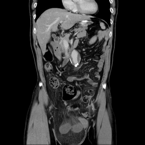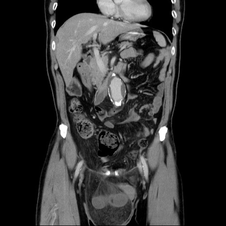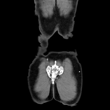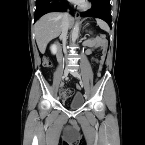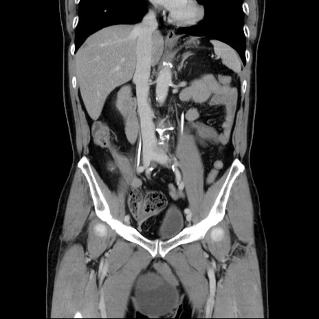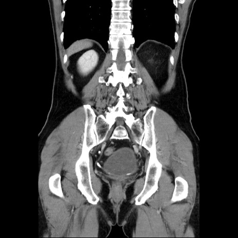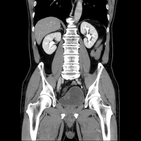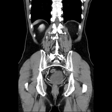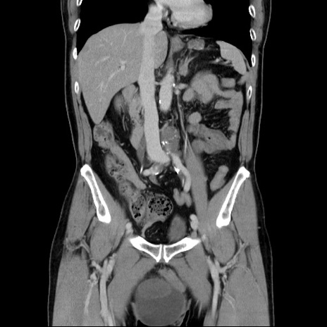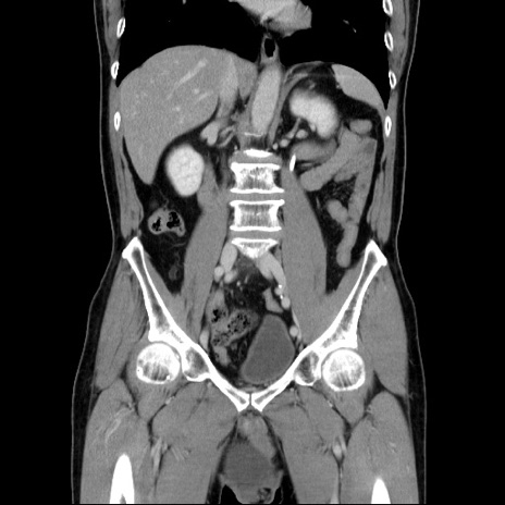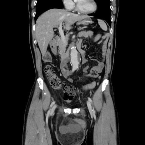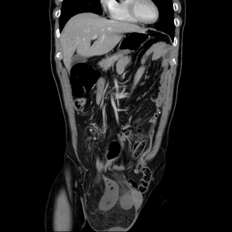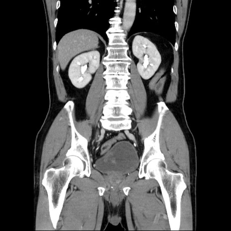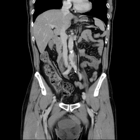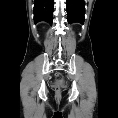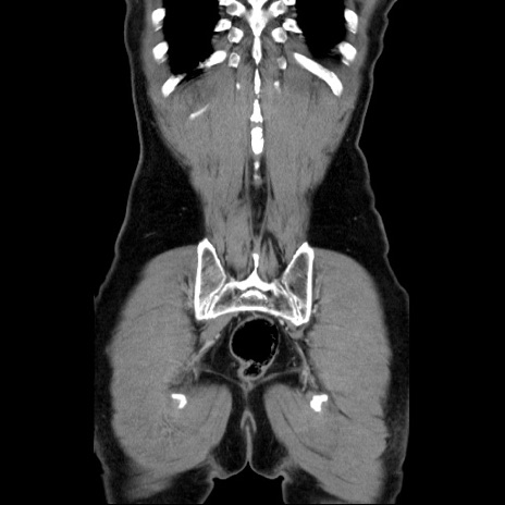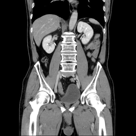 【症例】60歳代 男性 【主訴】右鼠径部膨隆 【現病歴】1年程前より右鼠径部膨隆あり。自己にて還納可能だったため放置していた。3時間前より右鼠径部の脱出を認め、還納困難となり受診。 【既往歴】高血圧 【身体所見】右鼠径部に小児頭大の膨隆あり。弾性硬であり、用手還納は困難。左鼠径部にも膨隆を認める。脱出はなし。 【データ】WBC 15500、CRP 測定なし