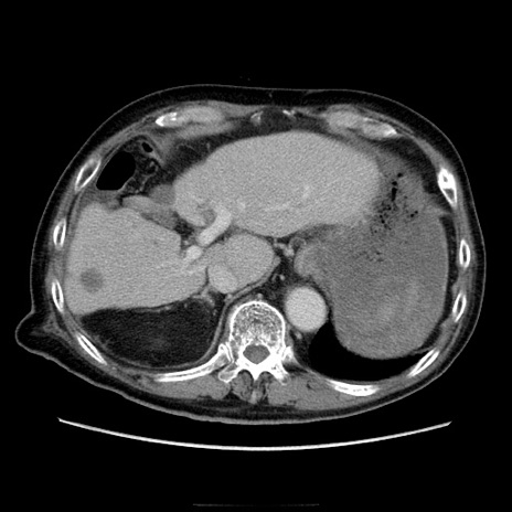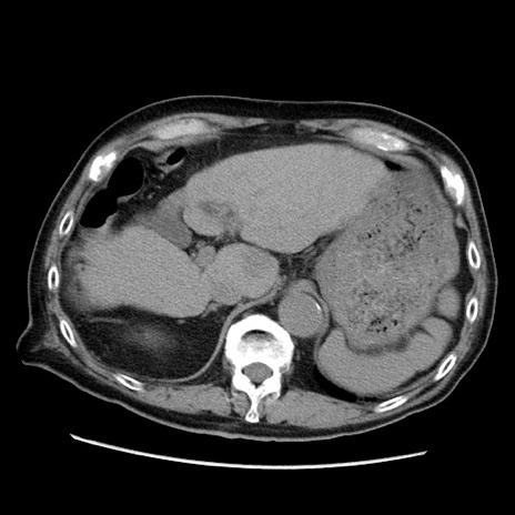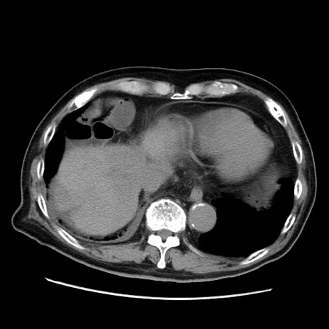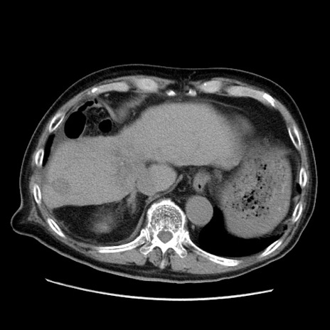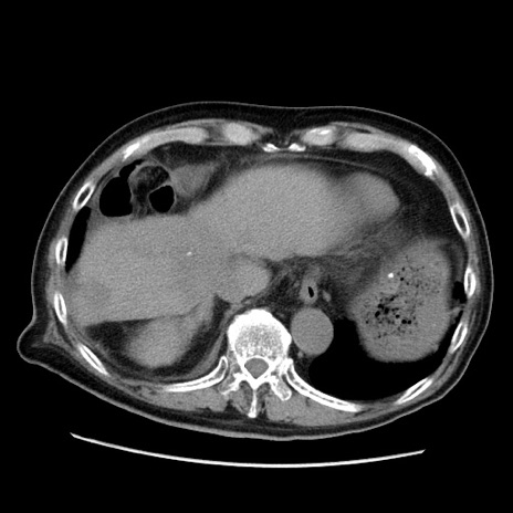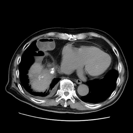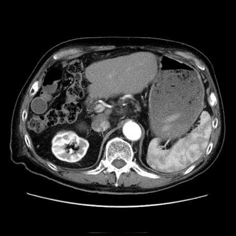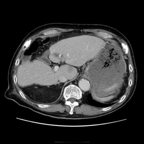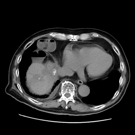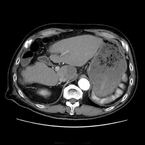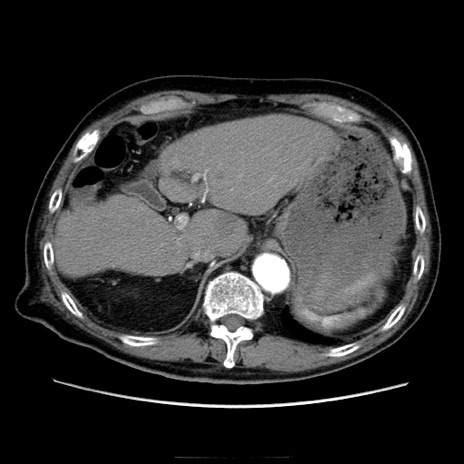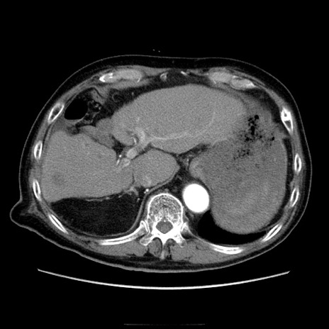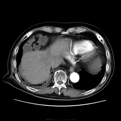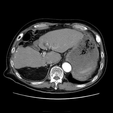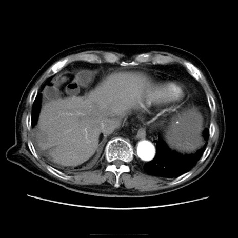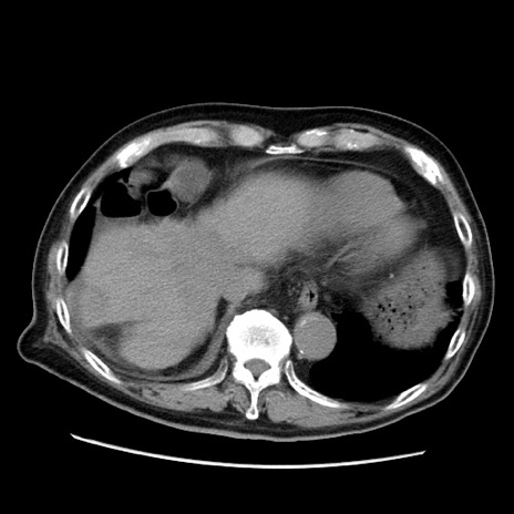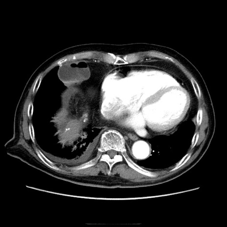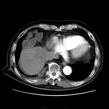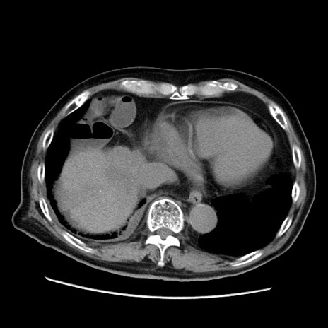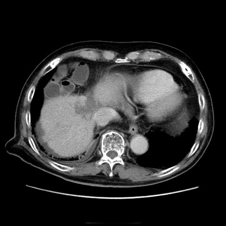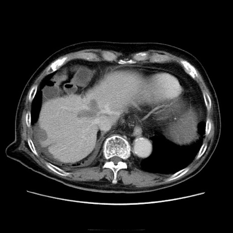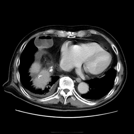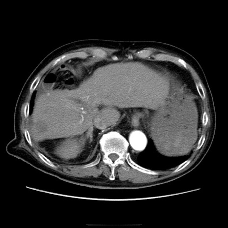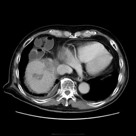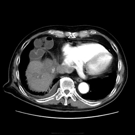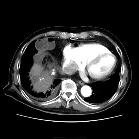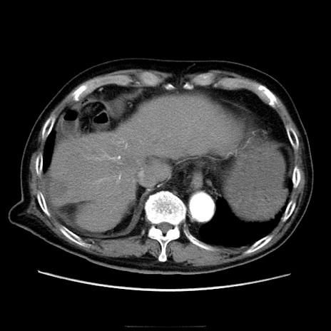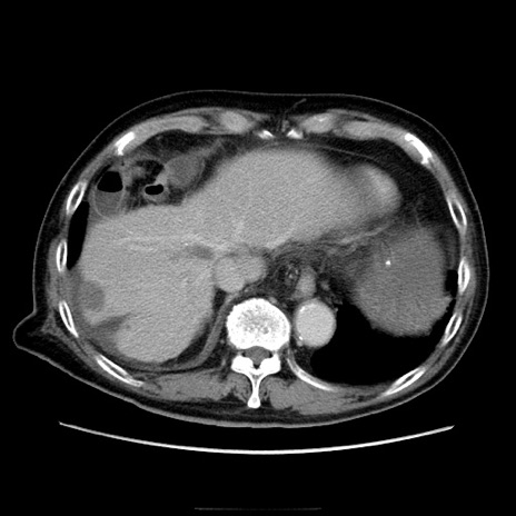 【症例】70歳代男性 【主訴】腹痛 【現病歴】肝硬変・肝細胞癌にてかかりつけの方。約9時間前に食後より腹痛出現。症状が徐々に増悪し、嘔吐出現したため来院。 【既往歴】肝硬変、肝細胞癌(RFA、TACE後) 【身体所見】意識清明、表情苦悶様、BT 36℃、BP 129/78mmHg、P 88bpm、SpO2 97%(RA)、右上腹部から心窩部にかけて圧痛あり、反跳痛なし、筋性防御あり。 【データ】WBC 5800、CRP 0.16