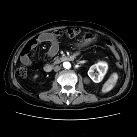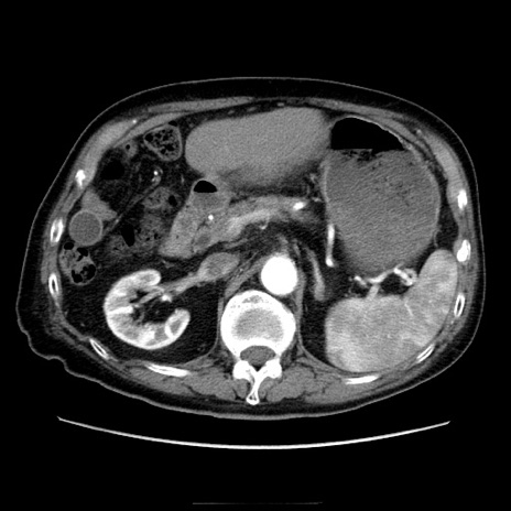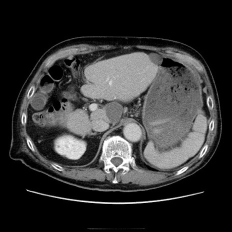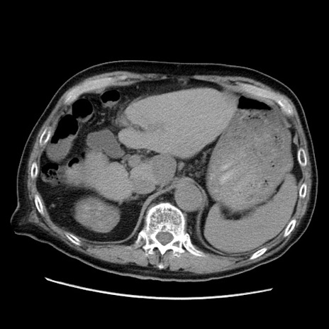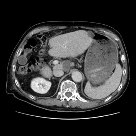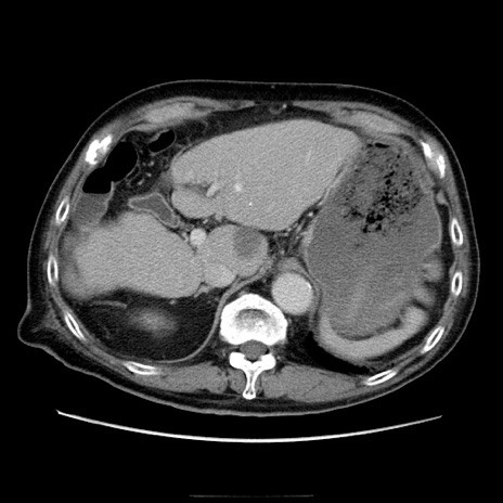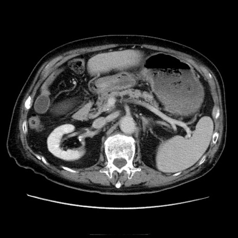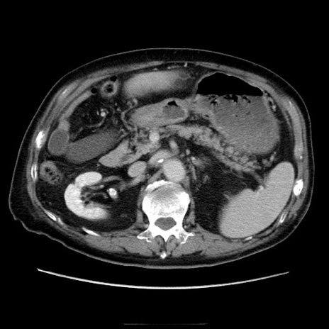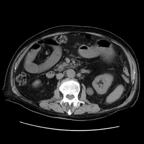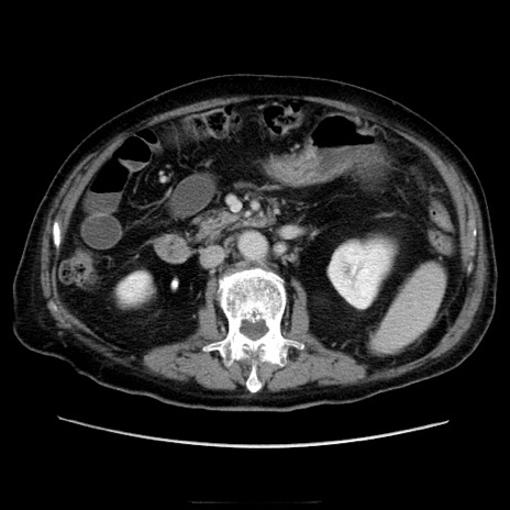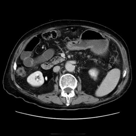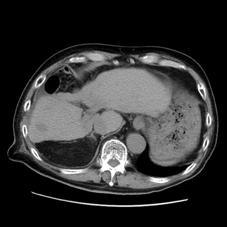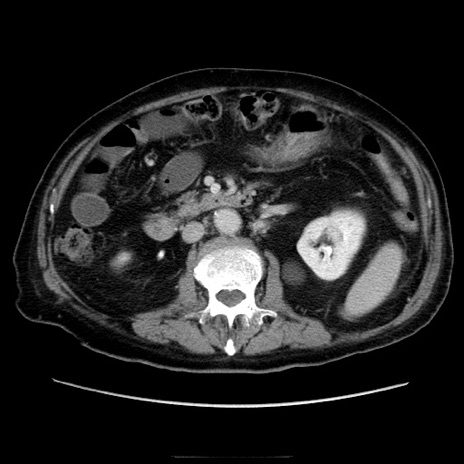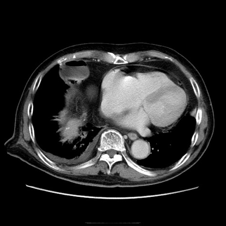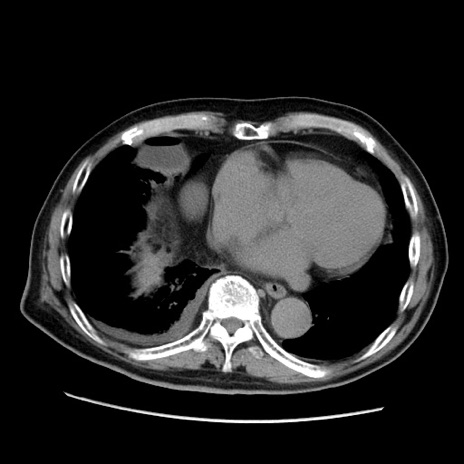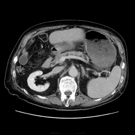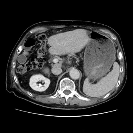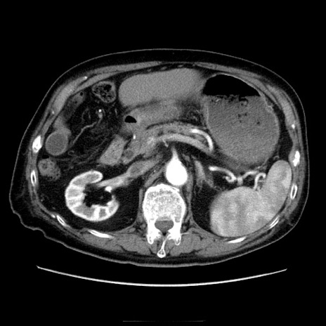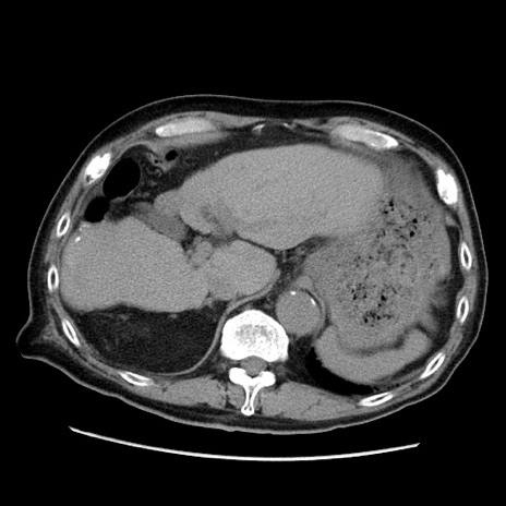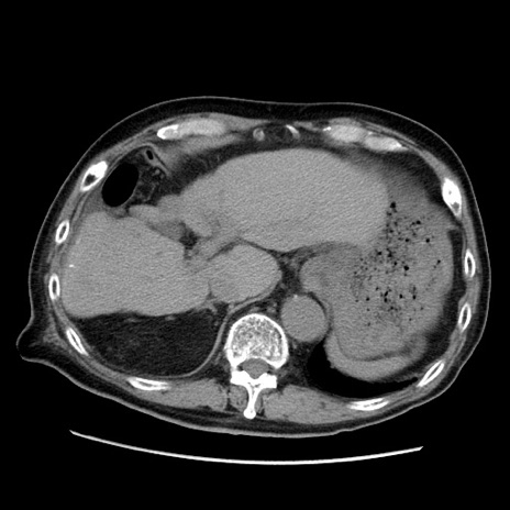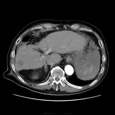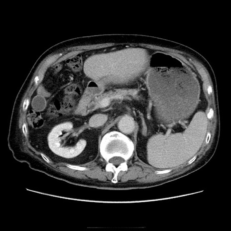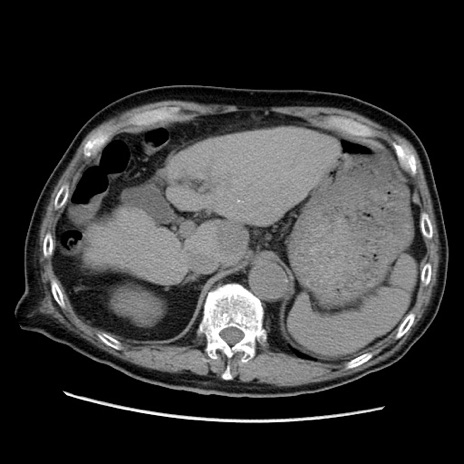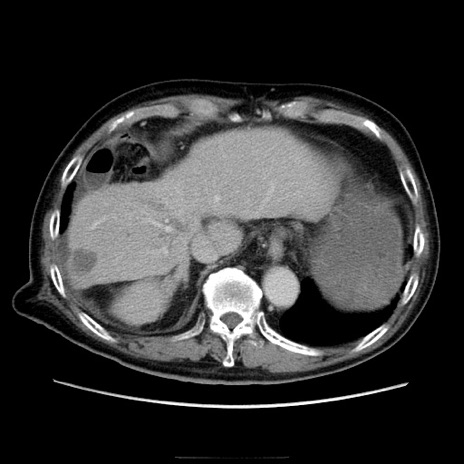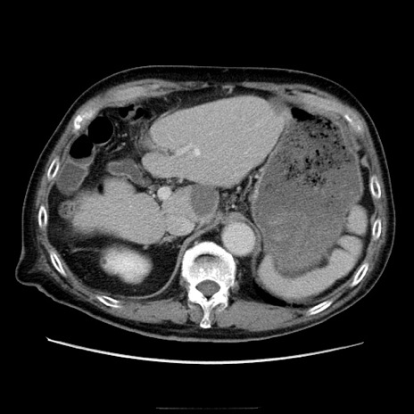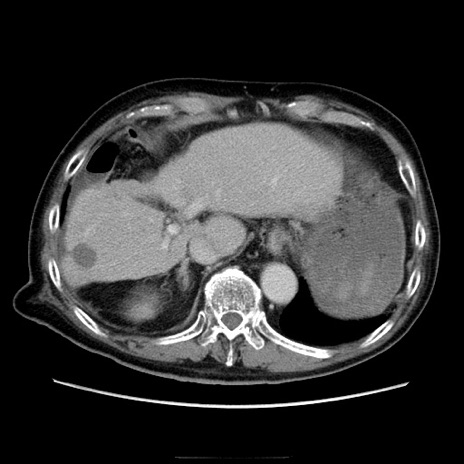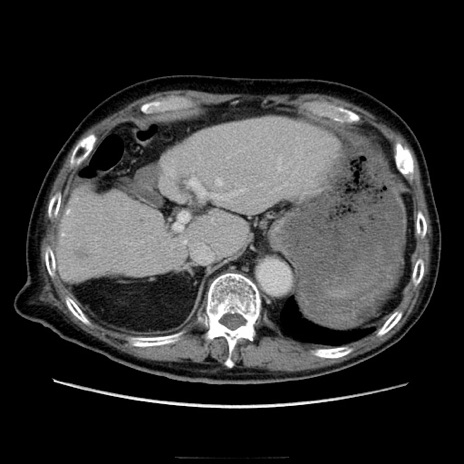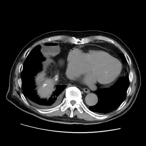 【症例】70歳代男性 【主訴】腹痛 【現病歴】肝硬変・肝細胞癌にてかかりつけの方。約9時間前に食後より腹痛出現。症状が徐々に増悪し、嘔吐出現したため来院。 【既往歴】肝硬変、肝細胞癌(RFA、TACE後) 【身体所見】意識清明、表情苦悶様、BT 36℃、BP 129/78mmHg、P 88bpm、SpO2 97%(RA)、右上腹部から心窩部にかけて圧痛あり、反跳痛なし、筋性防御あり。 【データ】WBC 5800、CRP 0.16