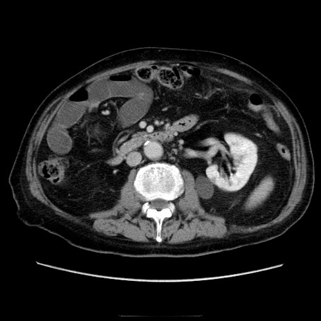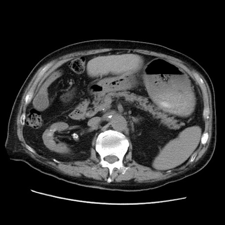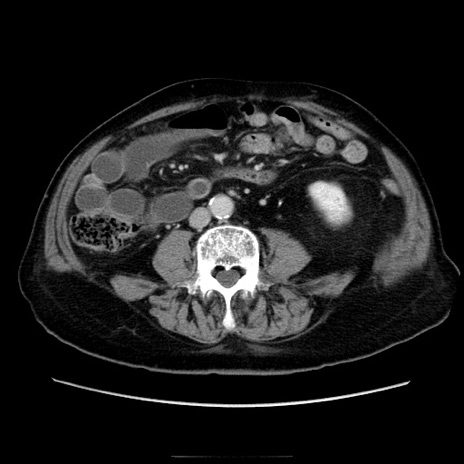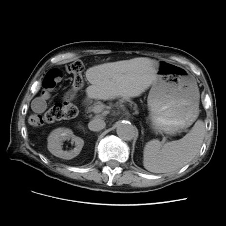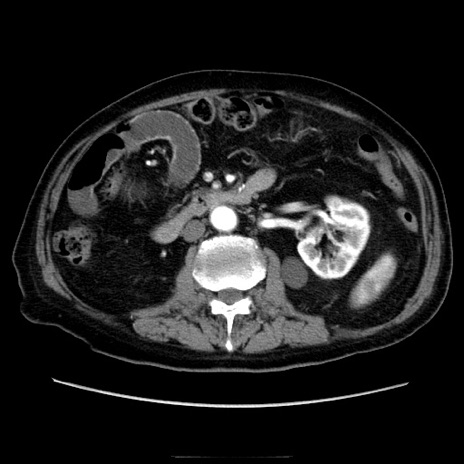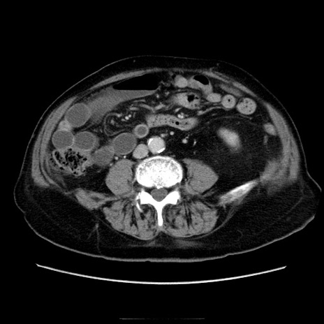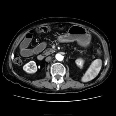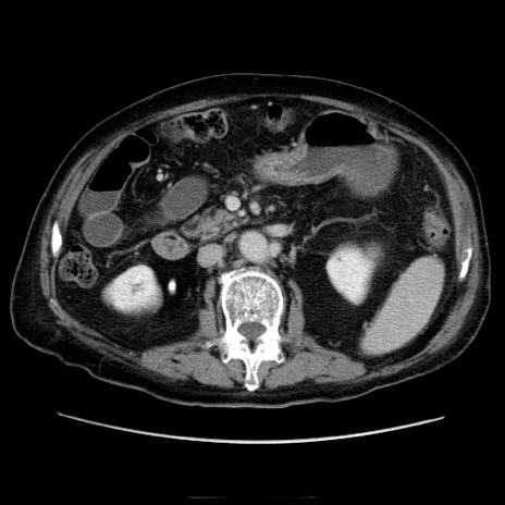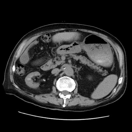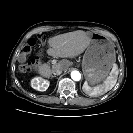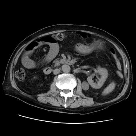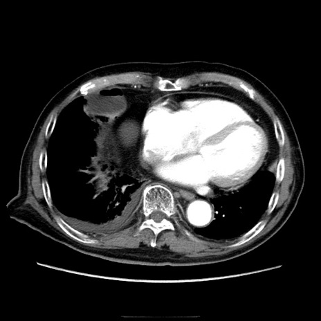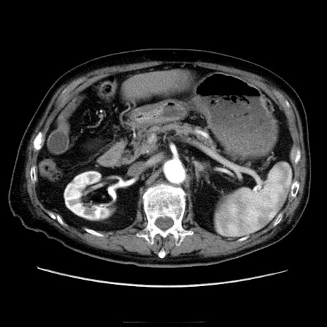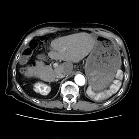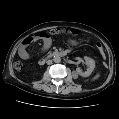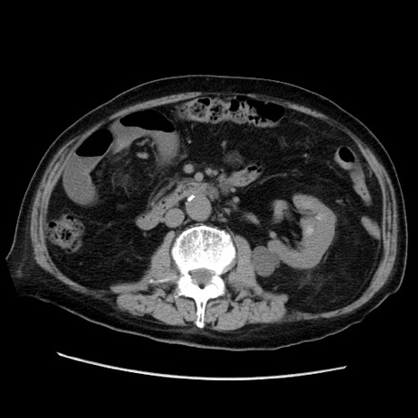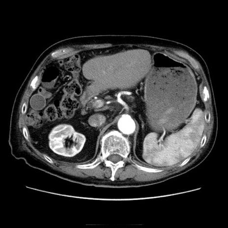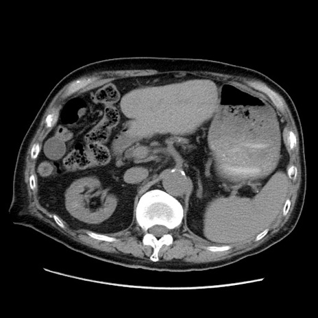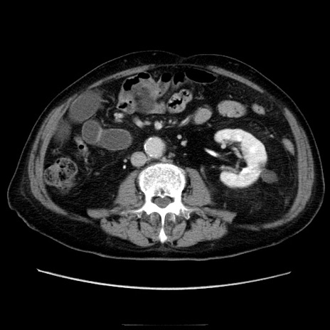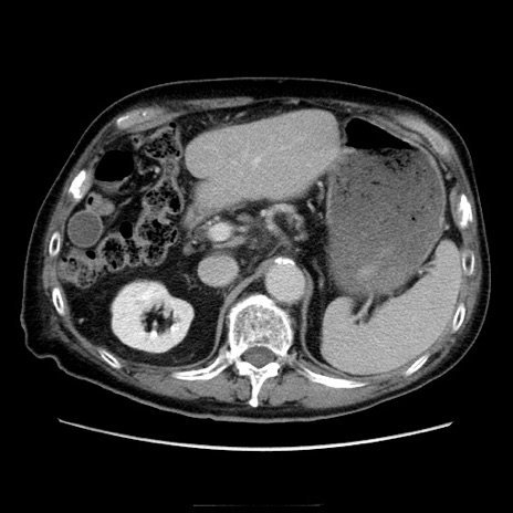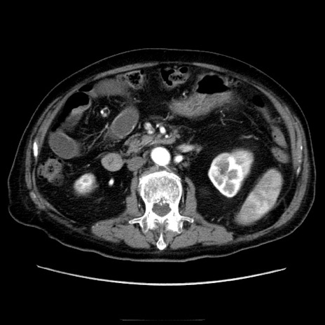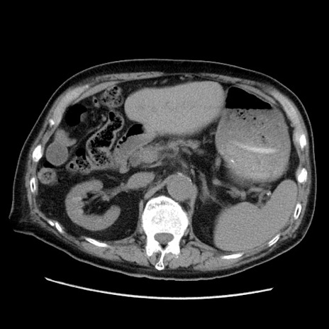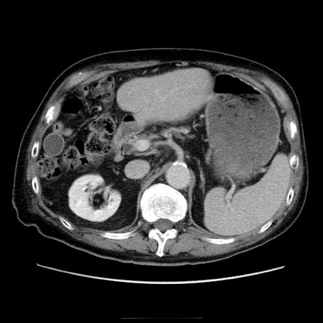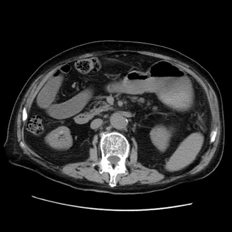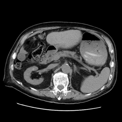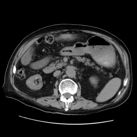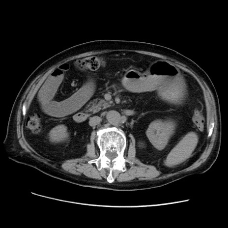 【症例】70歳代男性 【主訴】腹痛 【現病歴】肝硬変・肝細胞癌にてかかりつけの方。約9時間前に食後より腹痛出現。症状が徐々に増悪し、嘔吐出現したため来院。 【既往歴】肝硬変、肝細胞癌(RFA、TACE後) 【身体所見】意識清明、表情苦悶様、BT 36℃、BP 129/78mmHg、P 88bpm、SpO2 97%(RA)、右上腹部から心窩部にかけて圧痛あり、反跳痛なし、筋性防御あり。 【データ】WBC 5800、CRP 0.16