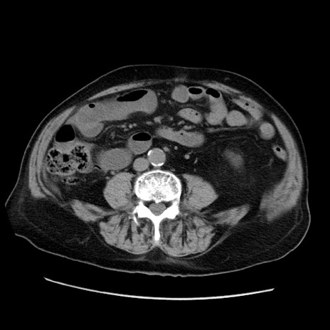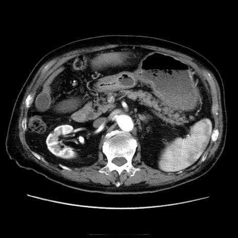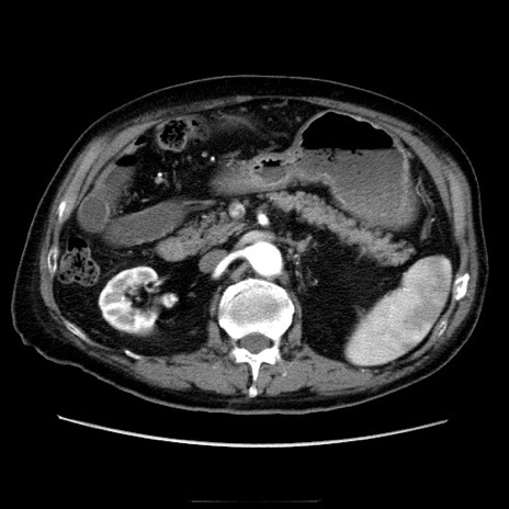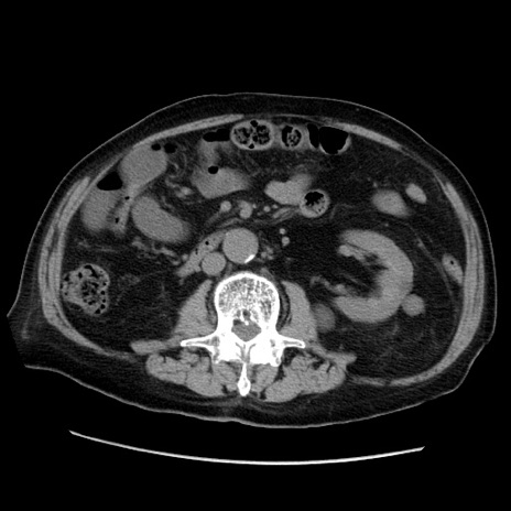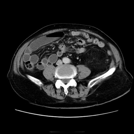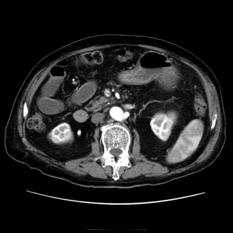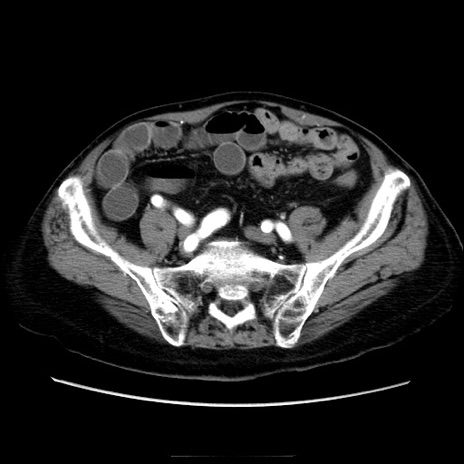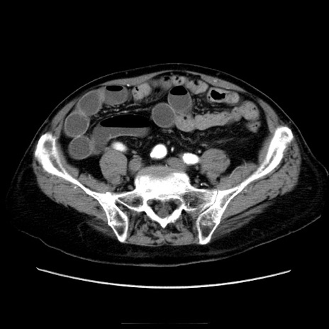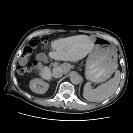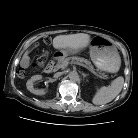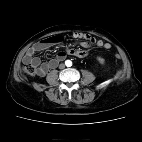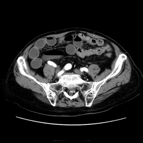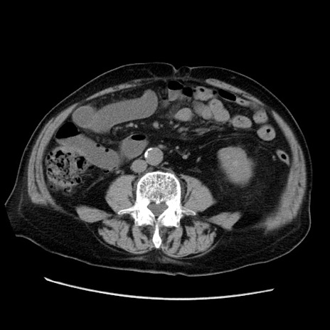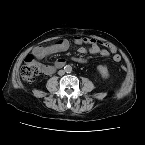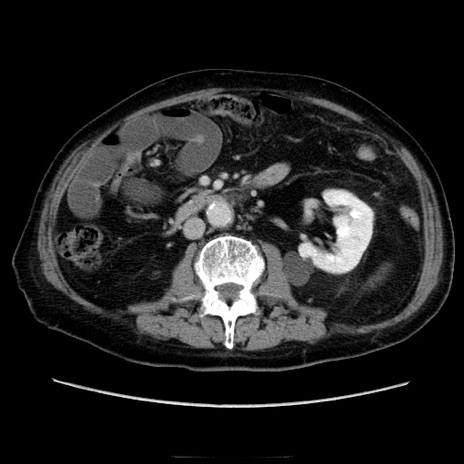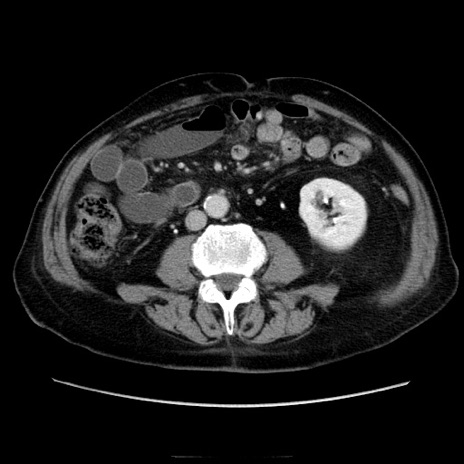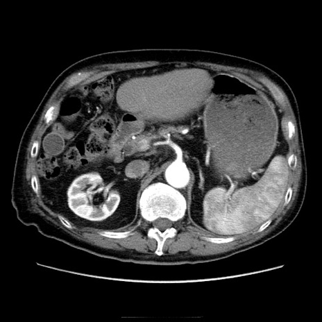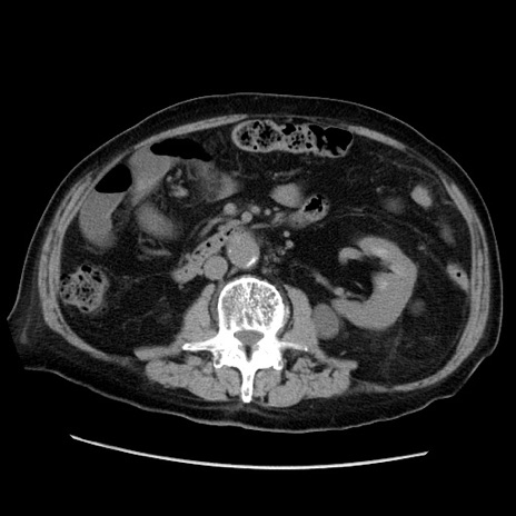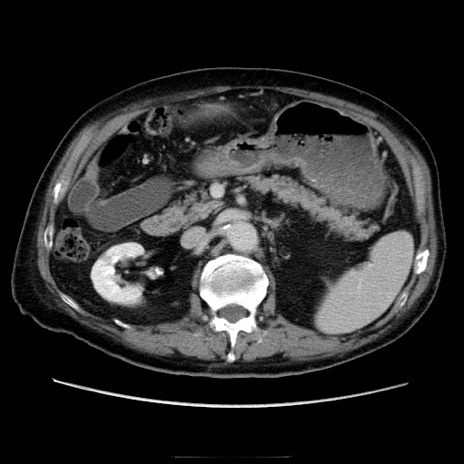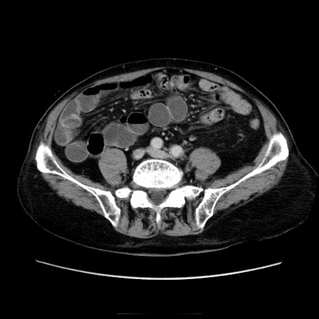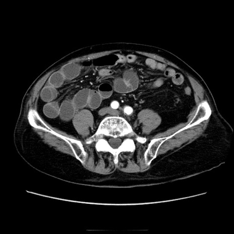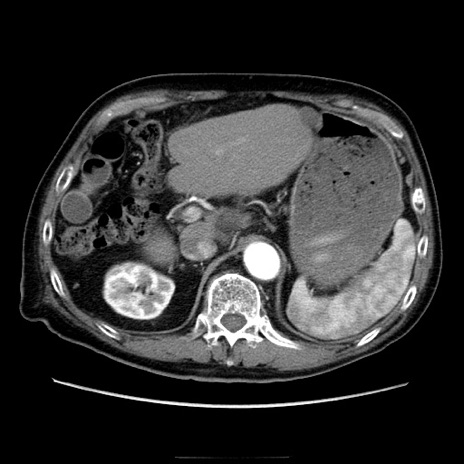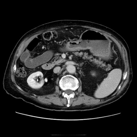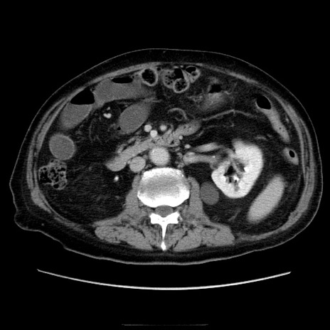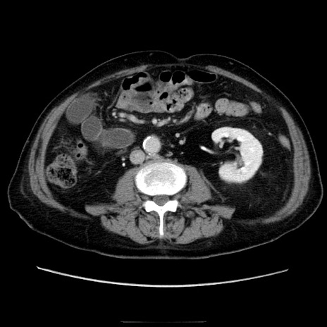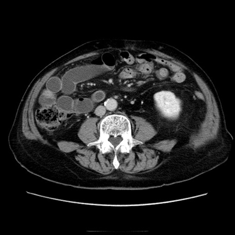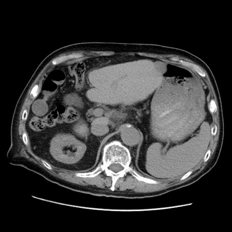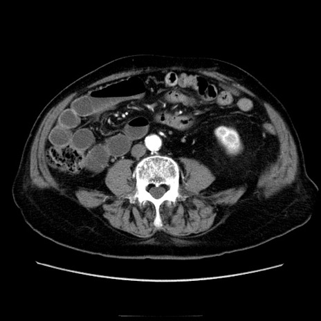 【症例】70歳代男性 【主訴】腹痛 【現病歴】肝硬変・肝細胞癌にてかかりつけの方。約9時間前に食後より腹痛出現。症状が徐々に増悪し、嘔吐出現したため来院。 【既往歴】肝硬変、肝細胞癌(RFA、TACE後) 【身体所見】意識清明、表情苦悶様、BT 36℃、BP 129/78mmHg、P 88bpm、SpO2 97%(RA)、右上腹部から心窩部にかけて圧痛あり、反跳痛なし、筋性防御あり。 【データ】WBC 5800、CRP 0.16