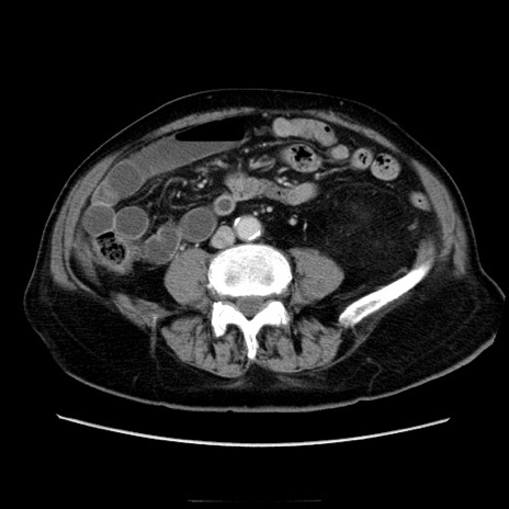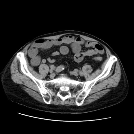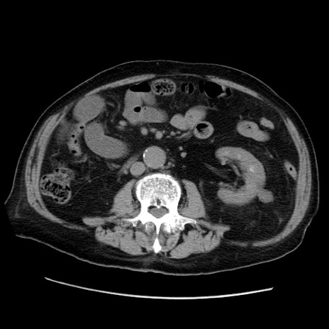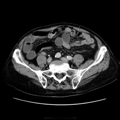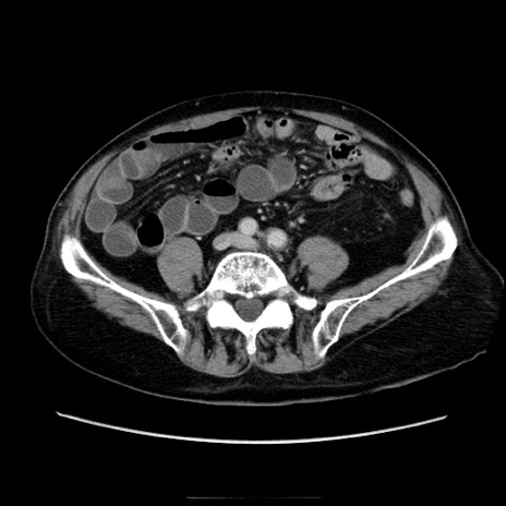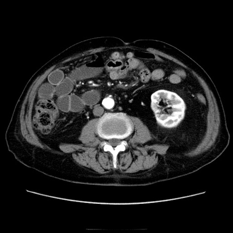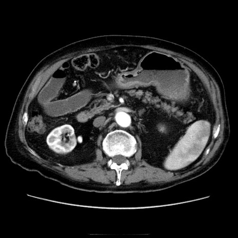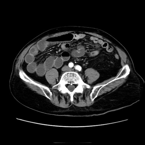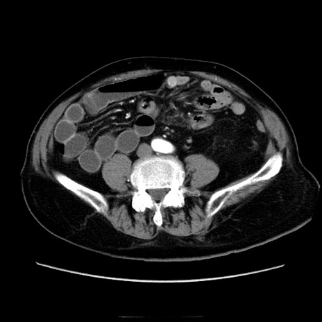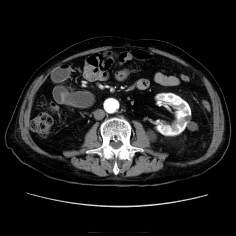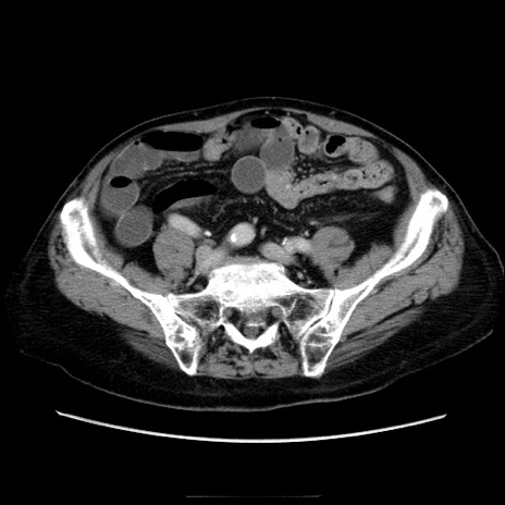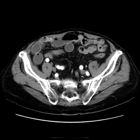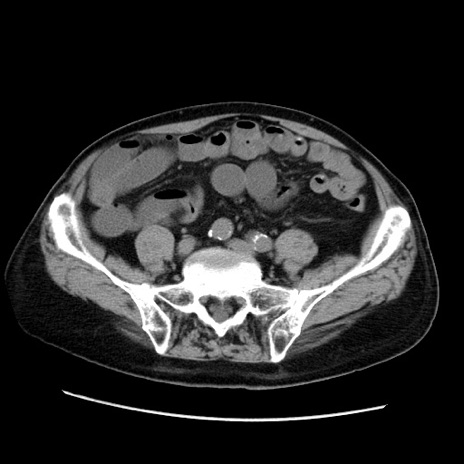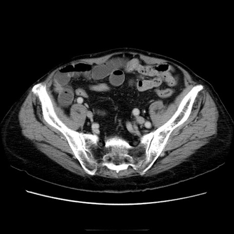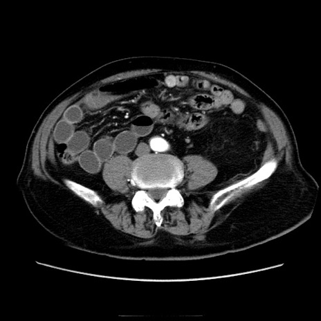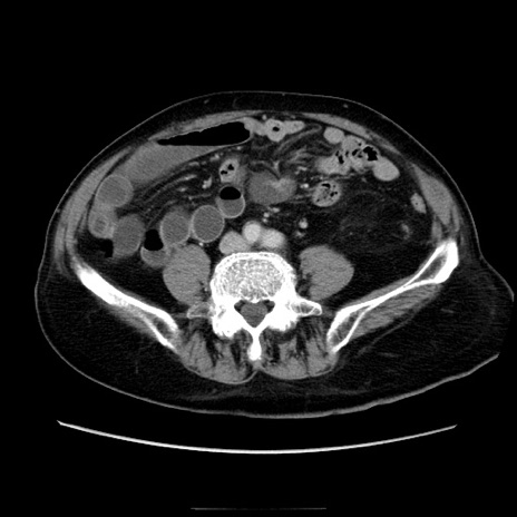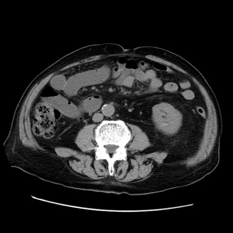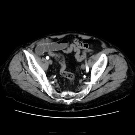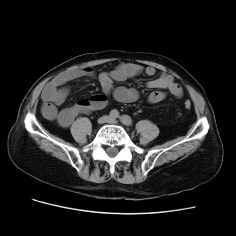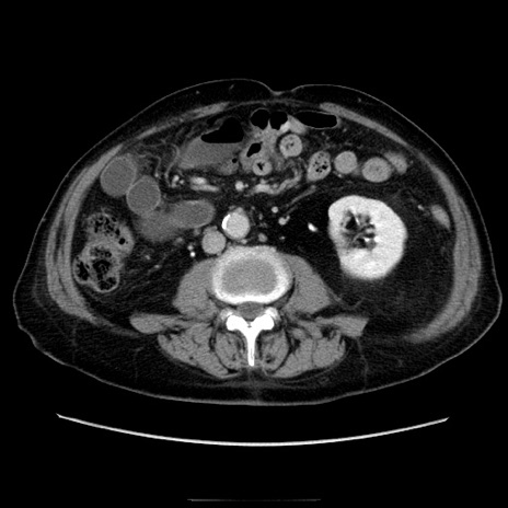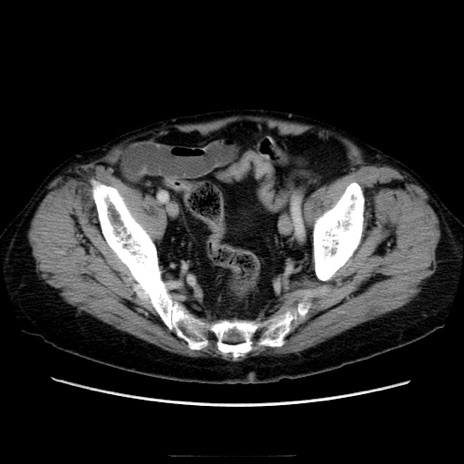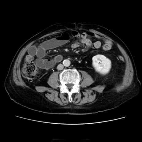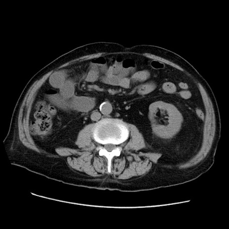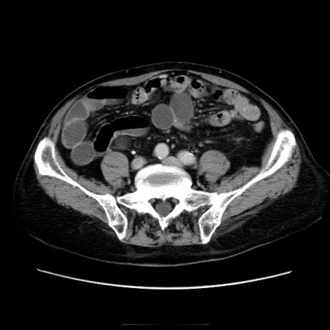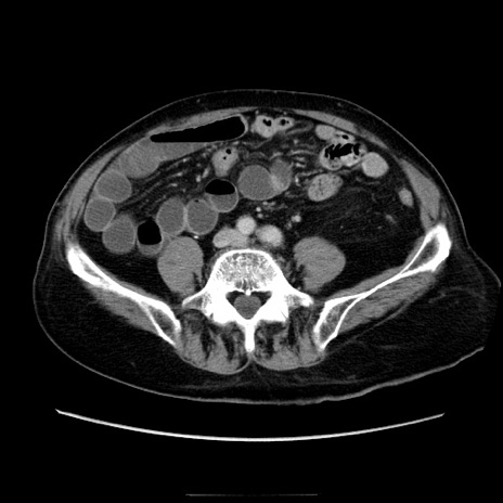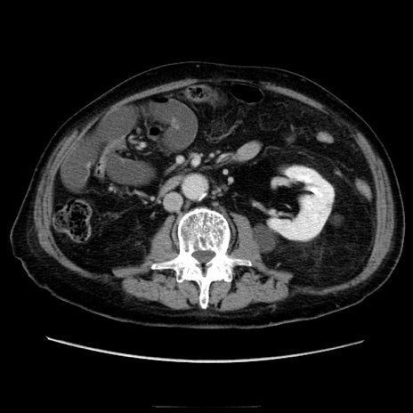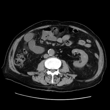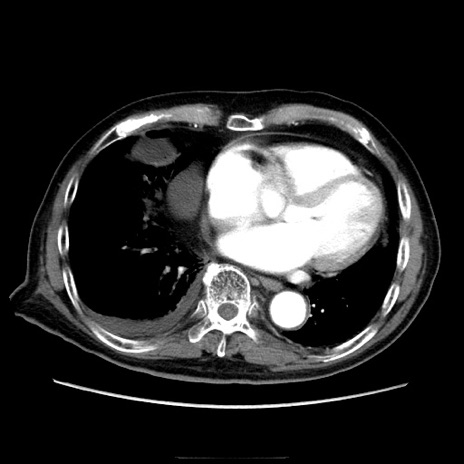 【症例】70歳代男性 【主訴】腹痛 【現病歴】肝硬変・肝細胞癌にてかかりつけの方。約9時間前に食後より腹痛出現。症状が徐々に増悪し、嘔吐出現したため来院。 【既往歴】肝硬変、肝細胞癌(RFA、TACE後) 【身体所見】意識清明、表情苦悶様、BT 36℃、BP 129/78mmHg、P 88bpm、SpO2 97%(RA)、右上腹部から心窩部にかけて圧痛あり、反跳痛なし、筋性防御あり。 【データ】WBC 5800、CRP 0.16