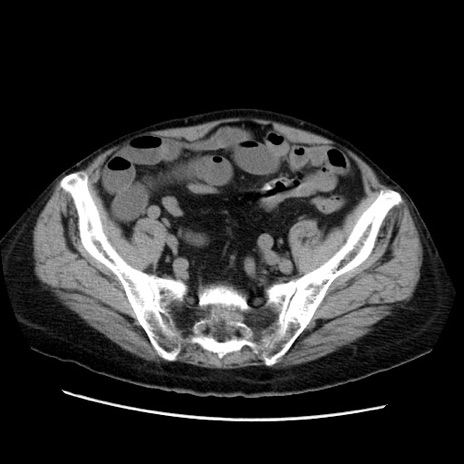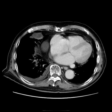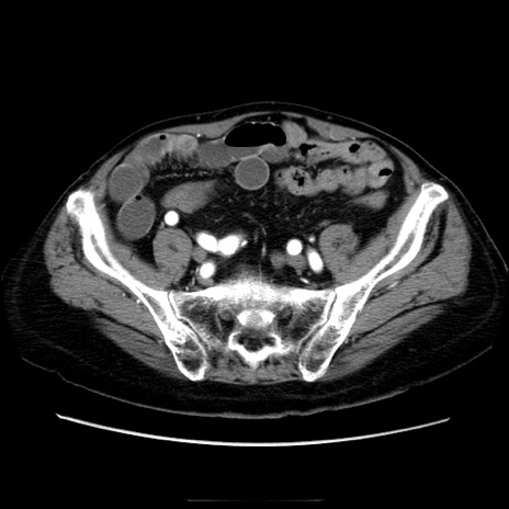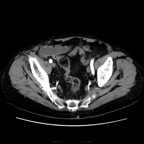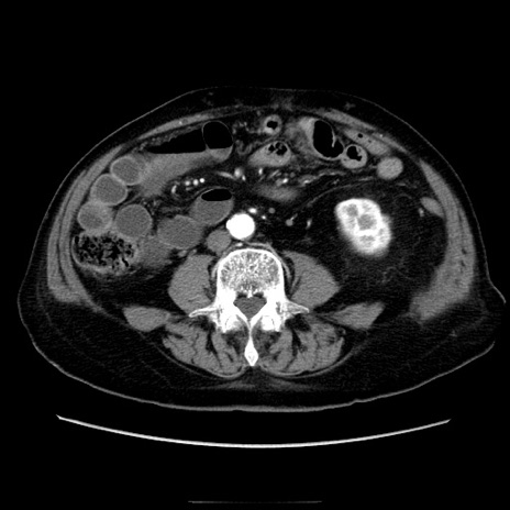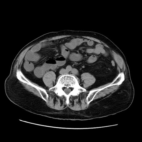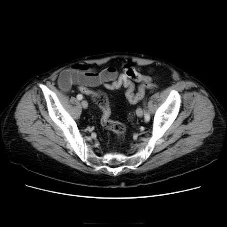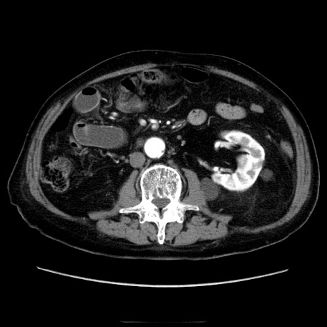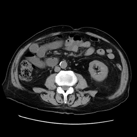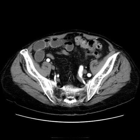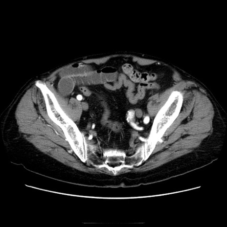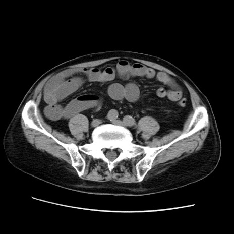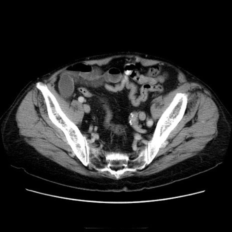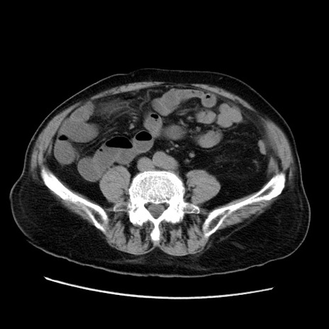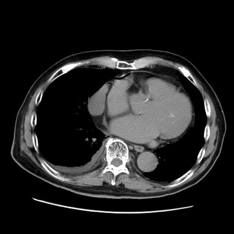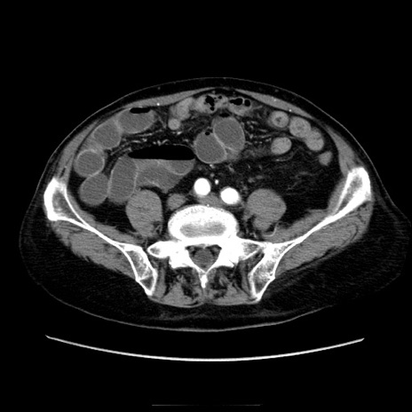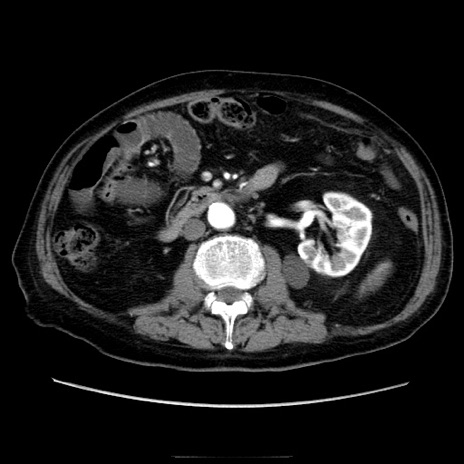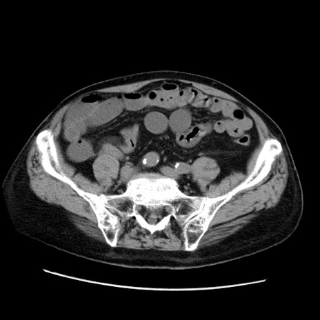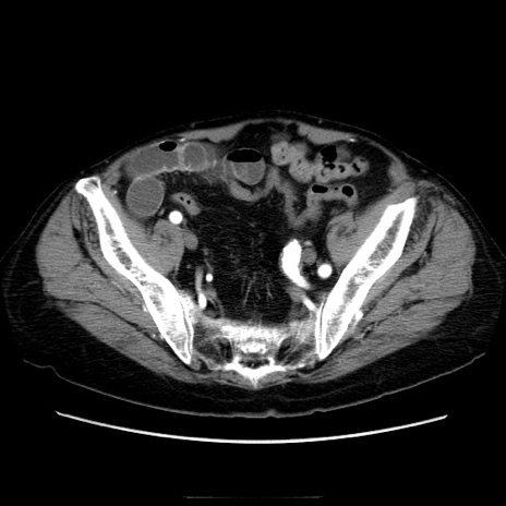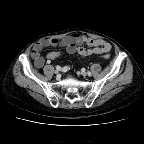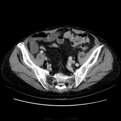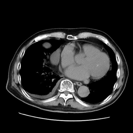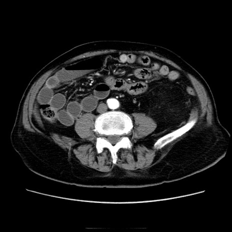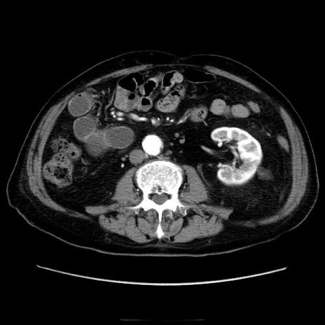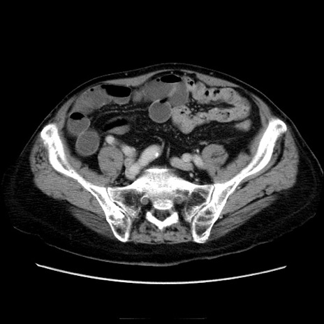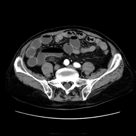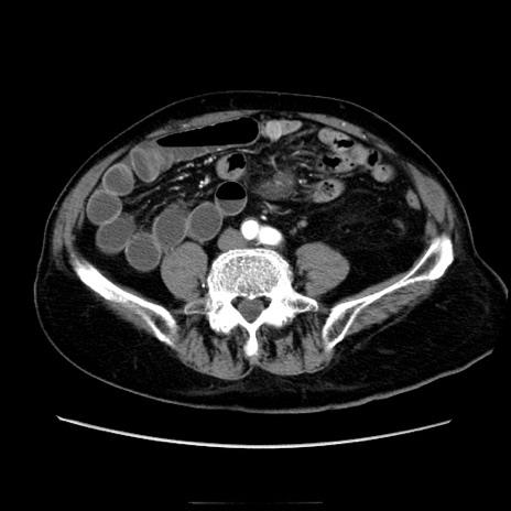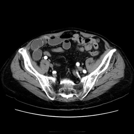 【症例】70歳代男性 【主訴】腹痛 【現病歴】肝硬変・肝細胞癌にてかかりつけの方。約9時間前に食後より腹痛出現。症状が徐々に増悪し、嘔吐出現したため来院。 【既往歴】肝硬変、肝細胞癌(RFA、TACE後) 【身体所見】意識清明、表情苦悶様、BT 36℃、BP 129/78mmHg、P 88bpm、SpO2 97%(RA)、右上腹部から心窩部にかけて圧痛あり、反跳痛なし、筋性防御あり。 【データ】WBC 5800、CRP 0.16