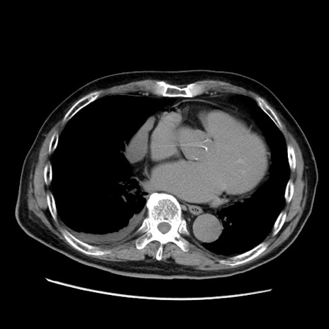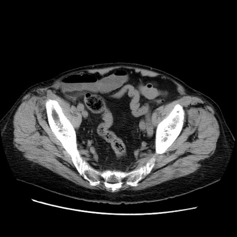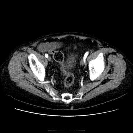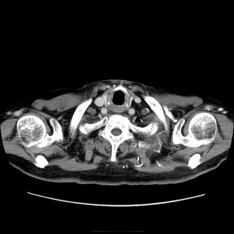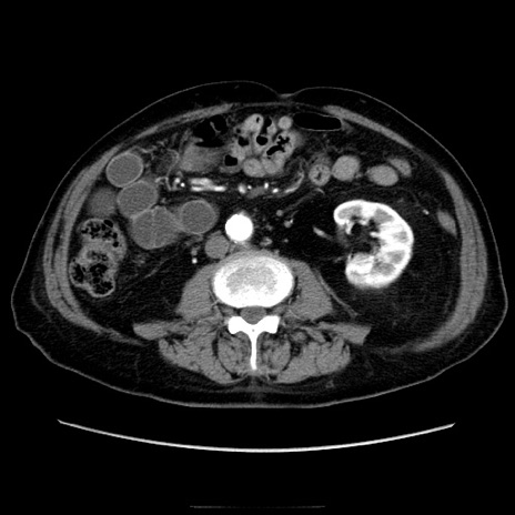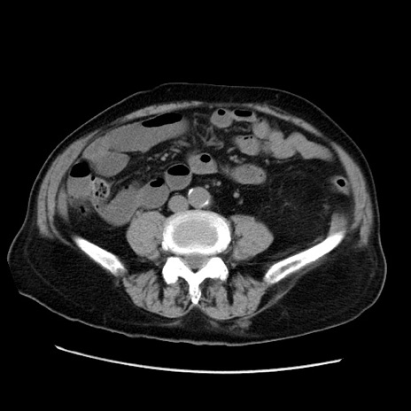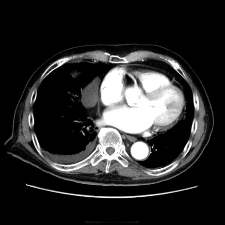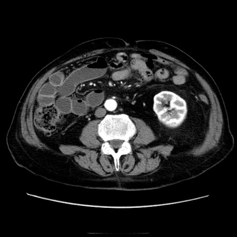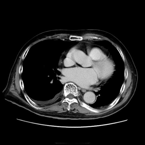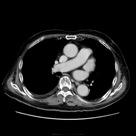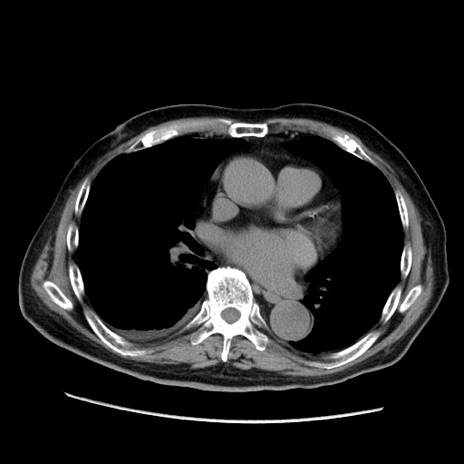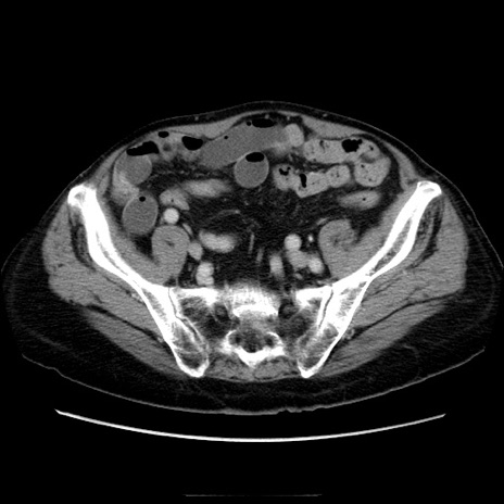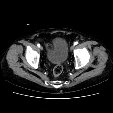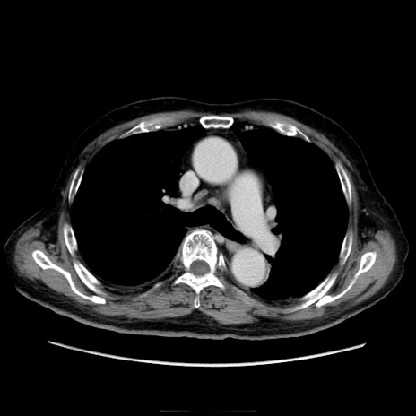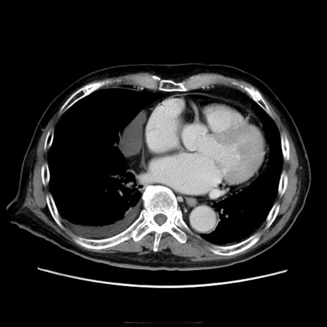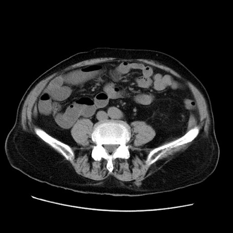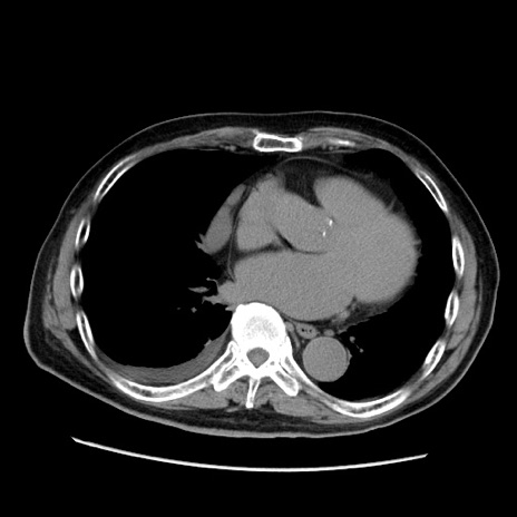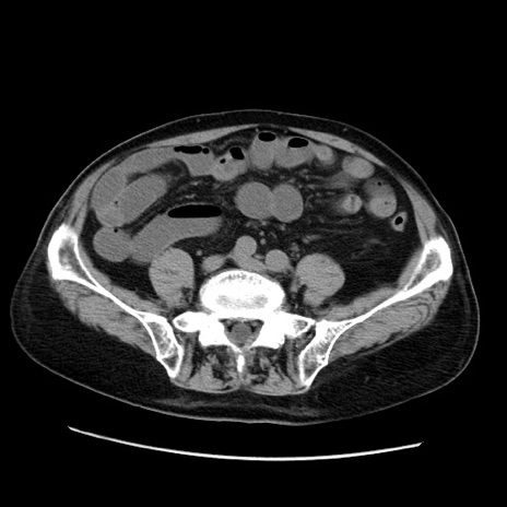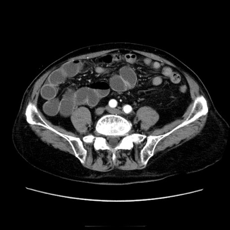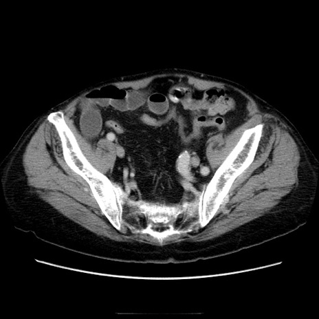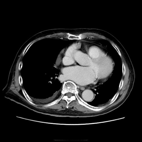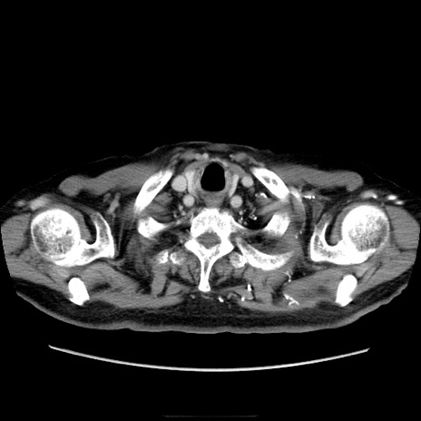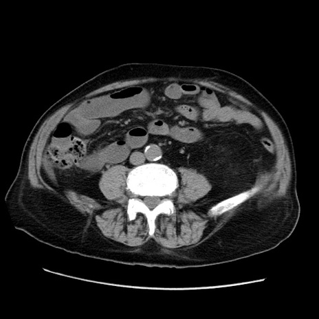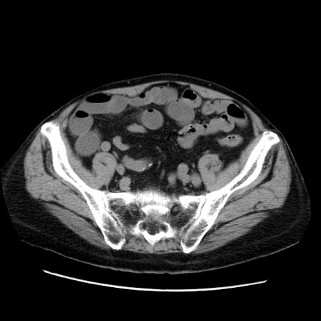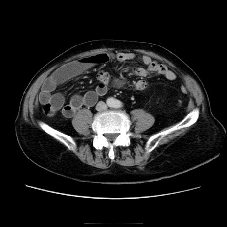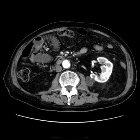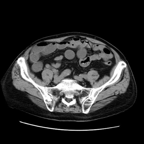 【症例】70歳代男性 【主訴】腹痛 【現病歴】肝硬変・肝細胞癌にてかかりつけの方。約9時間前に食後より腹痛出現。症状が徐々に増悪し、嘔吐出現したため来院。 【既往歴】肝硬変、肝細胞癌(RFA、TACE後) 【身体所見】意識清明、表情苦悶様、BT 36℃、BP 129/78mmHg、P 88bpm、SpO2 97%(RA)、右上腹部から心窩部にかけて圧痛あり、反跳痛なし、筋性防御あり。 【データ】WBC 5800、CRP 0.16