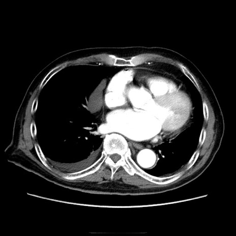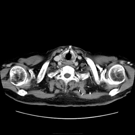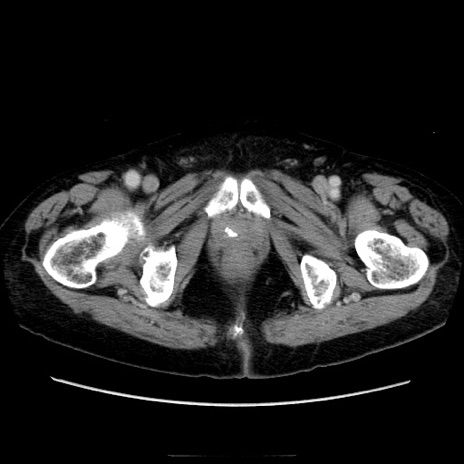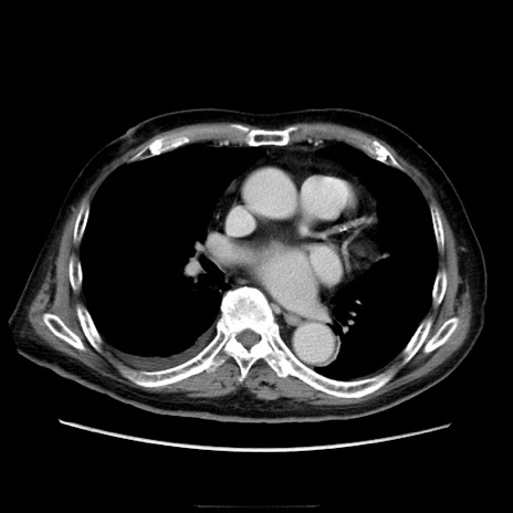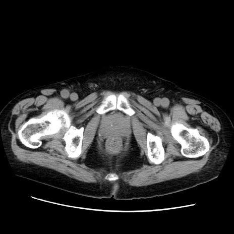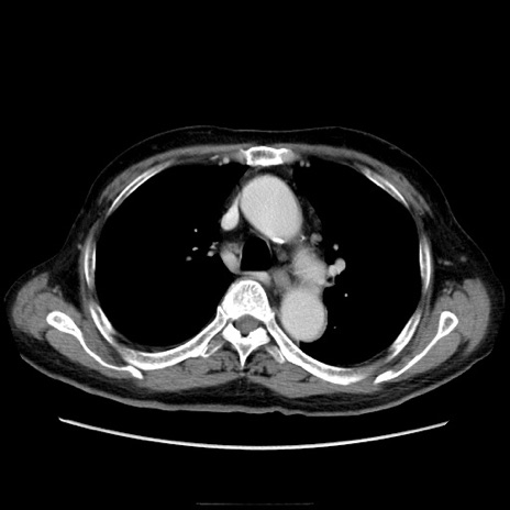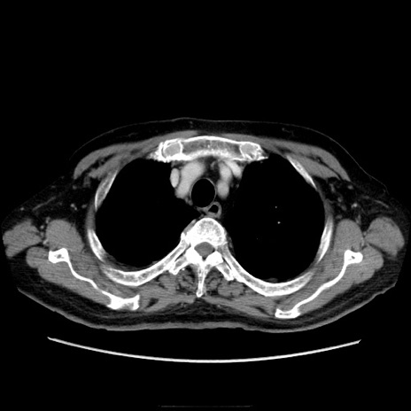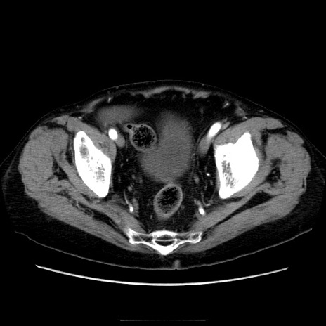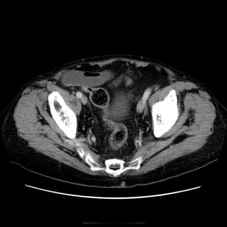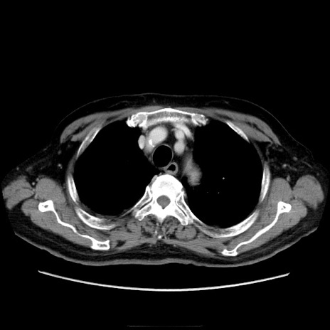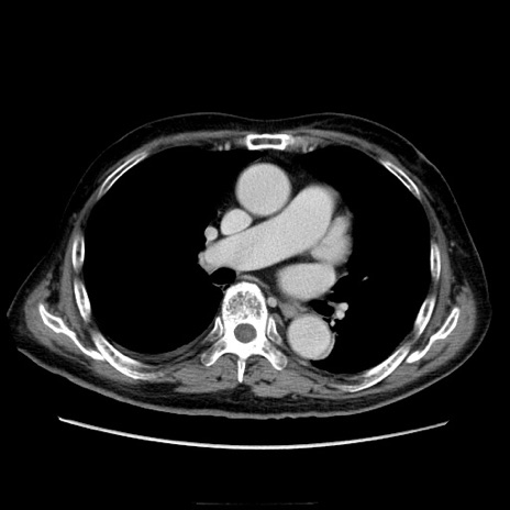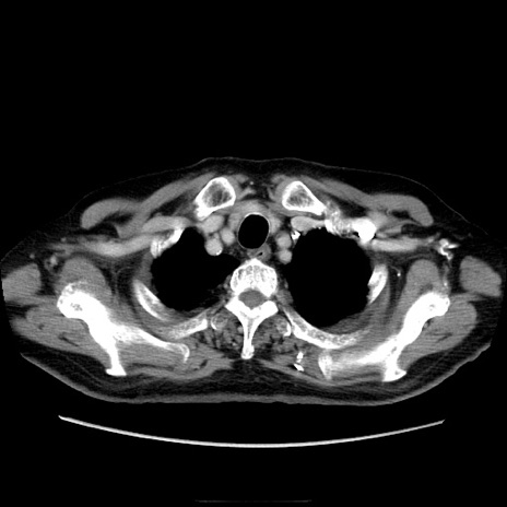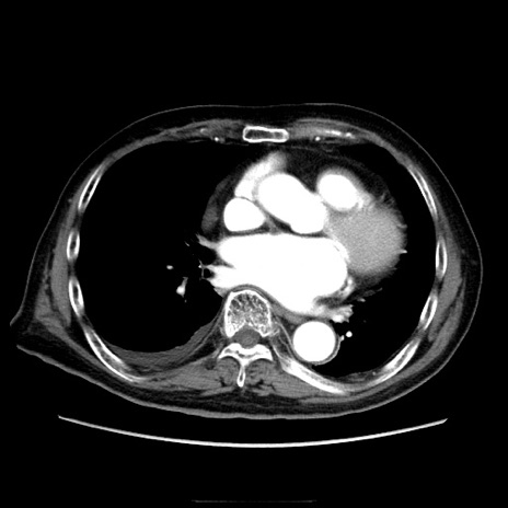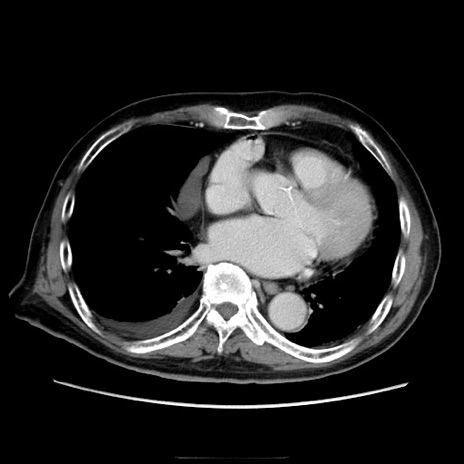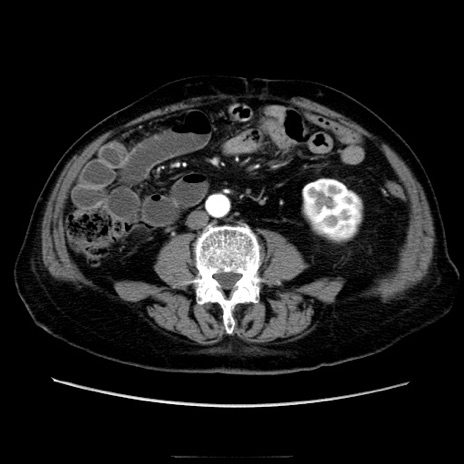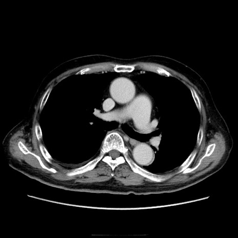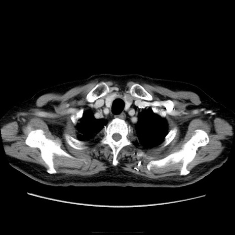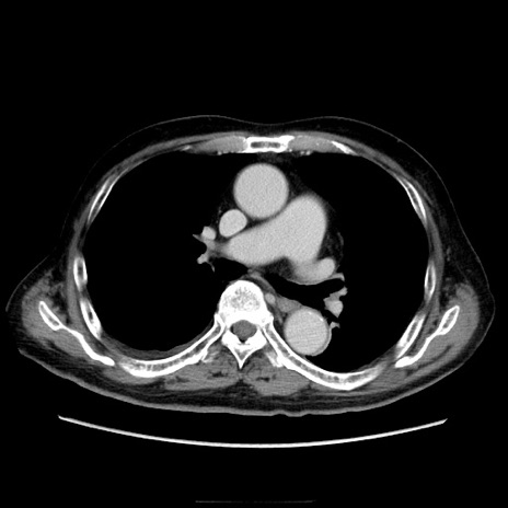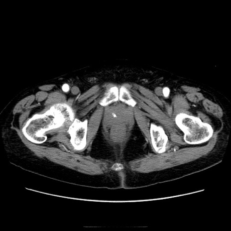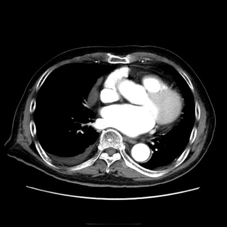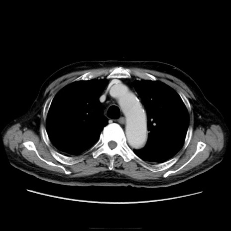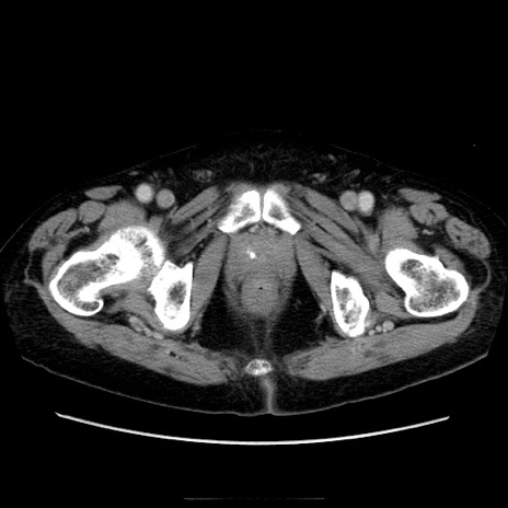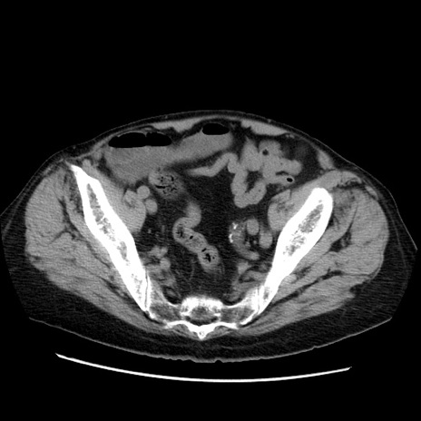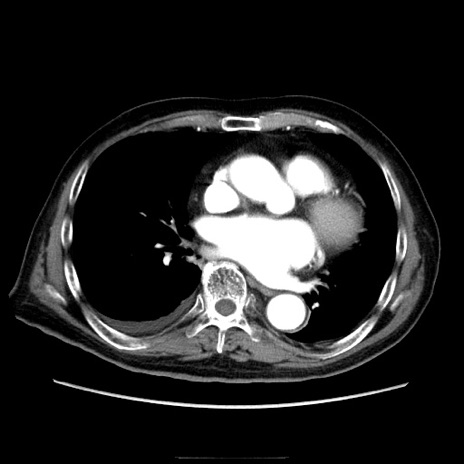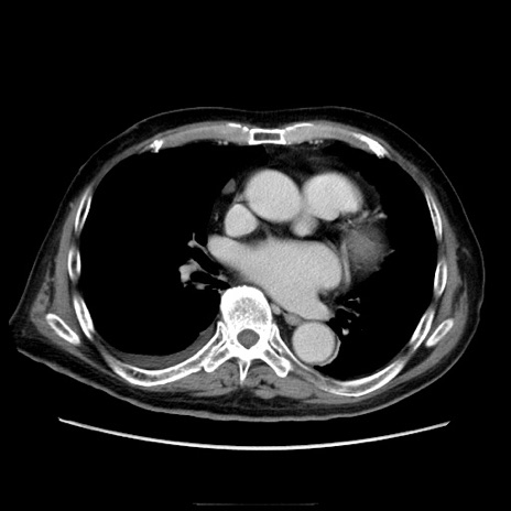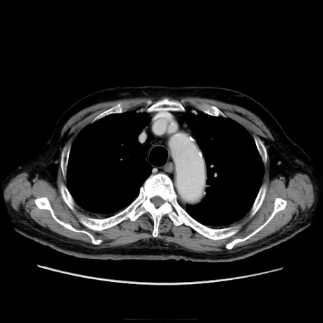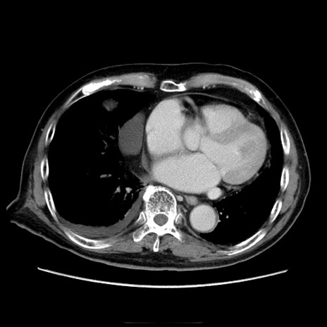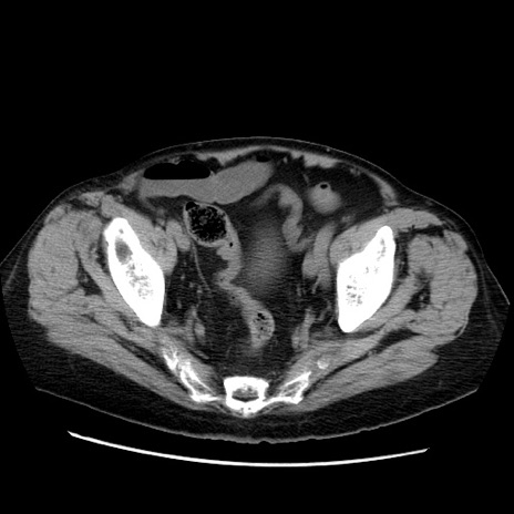 【症例】70歳代男性 【主訴】腹痛 【現病歴】肝硬変・肝細胞癌にてかかりつけの方。約9時間前に食後より腹痛出現。症状が徐々に増悪し、嘔吐出現したため来院。 【既往歴】肝硬変、肝細胞癌(RFA、TACE後) 【身体所見】意識清明、表情苦悶様、BT 36℃、BP 129/78mmHg、P 88bpm、SpO2 97%(RA)、右上腹部から心窩部にかけて圧痛あり、反跳痛なし、筋性防御あり。 【データ】WBC 5800、CRP 0.16