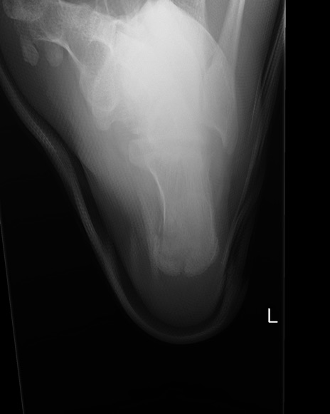 【症例】50歳代男性 【主訴】左踵部の痛み、腫脹 【現病歴】4日前に1.5m程度の高さのトラックの荷台から荷物と一緒に転落し、左足部を打撲。近医受診し、当院へ紹介受診となる。 【身体所見】左踵部の腫脹、圧痛あり。
