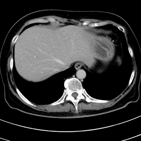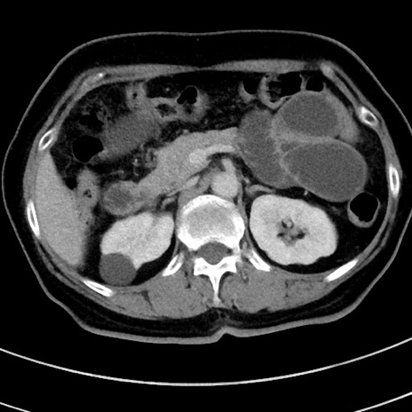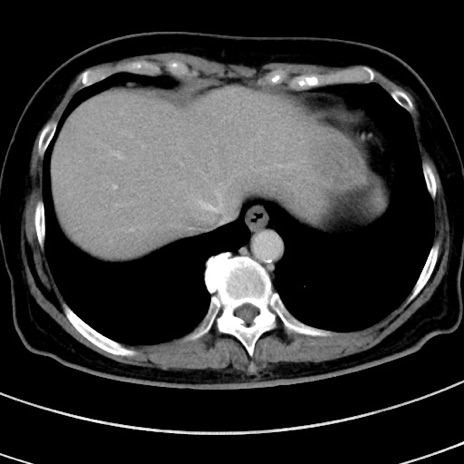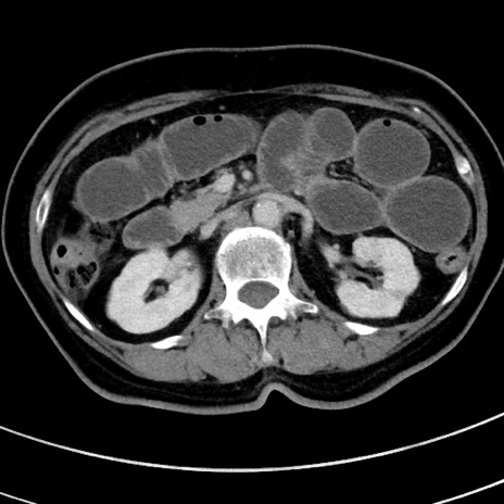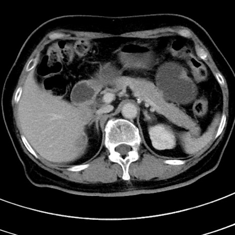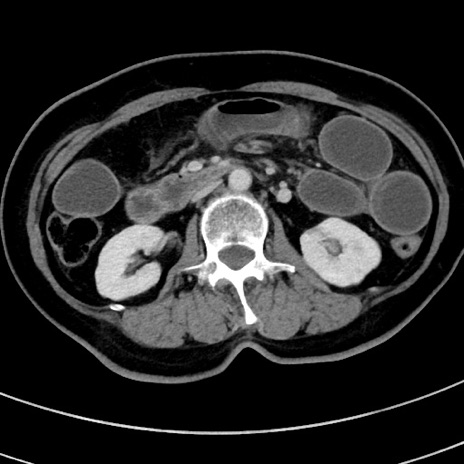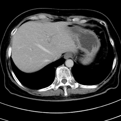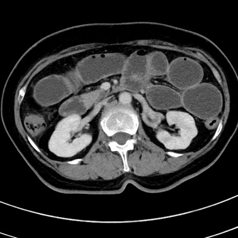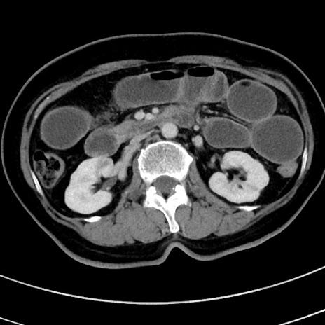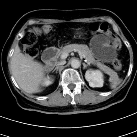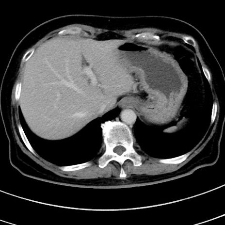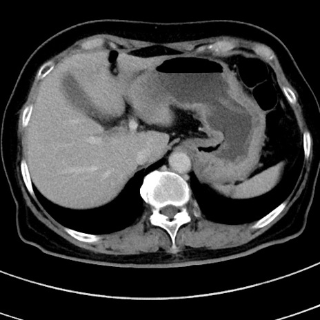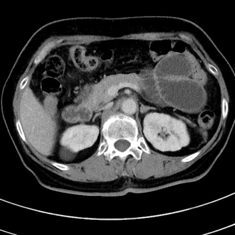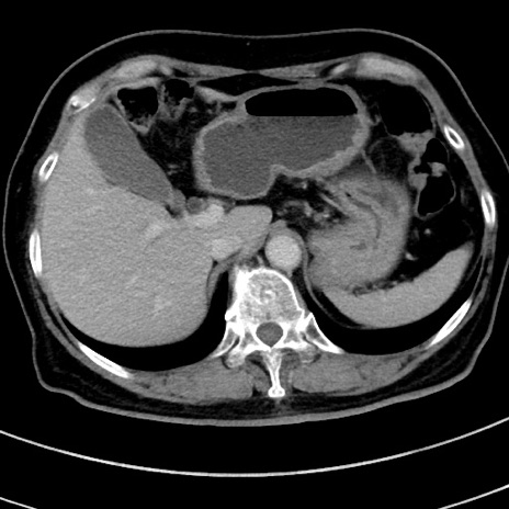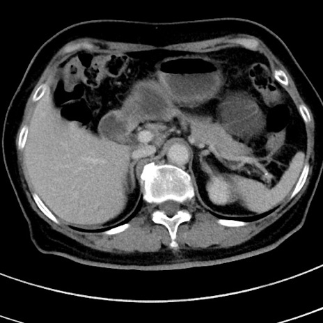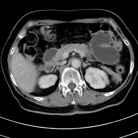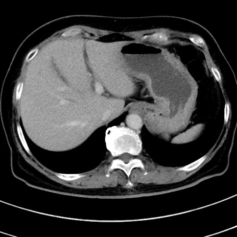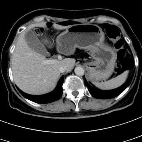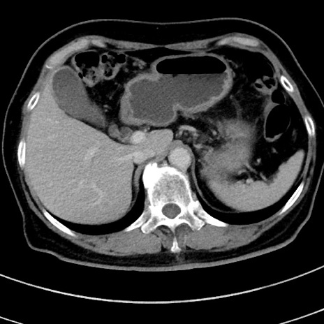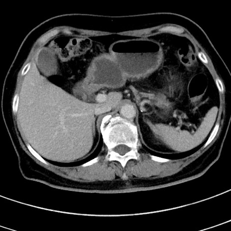【症例】 60歳代女性 【主訴】むかつき、みぞおちの痛み 【現病歴】3日前よりむかつきがあり、食事がとれない。 【既往歴】糖尿病 【身体所見】発熱なし、心窩部圧痛軽度あるも、腹膜刺激症状なし。 【データ】WBC 7400、CRP 1.92