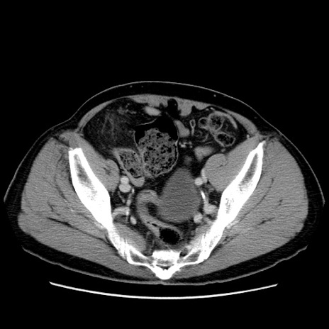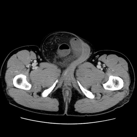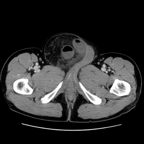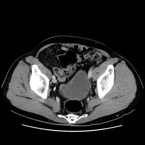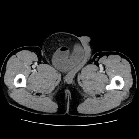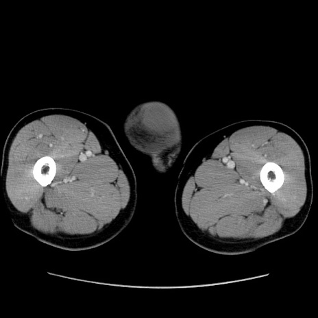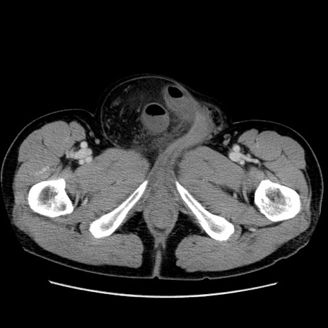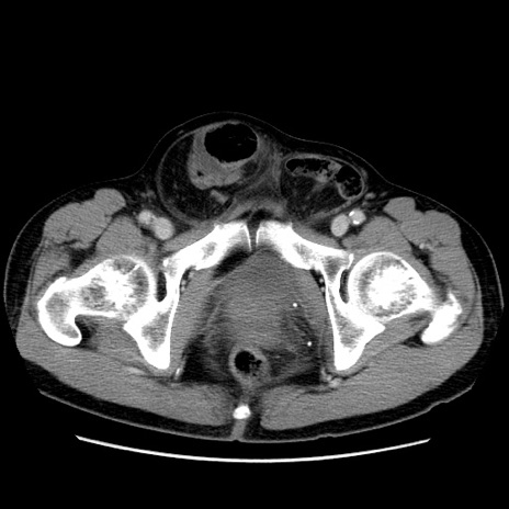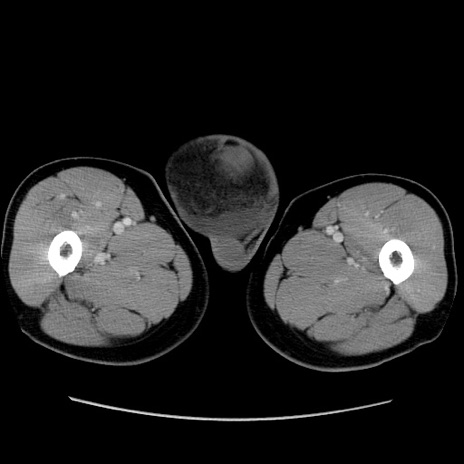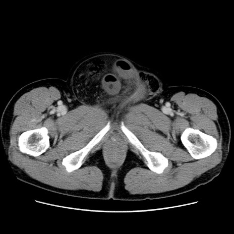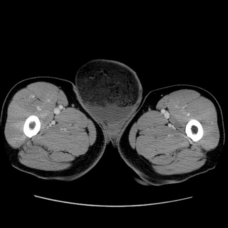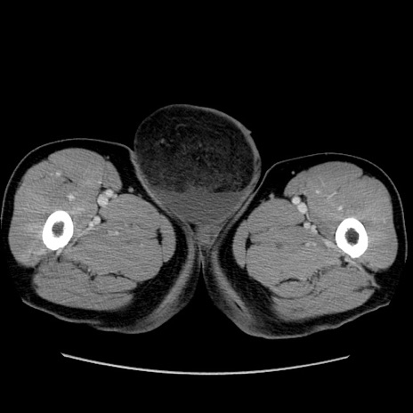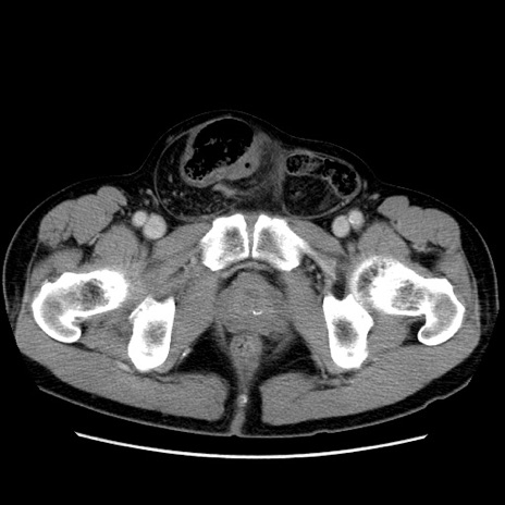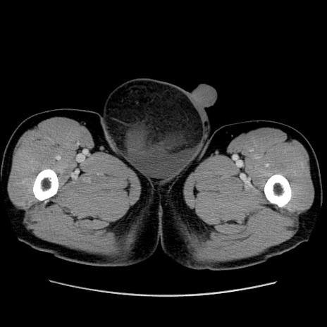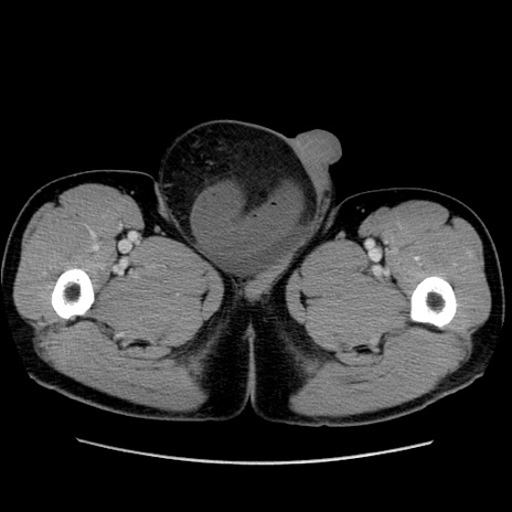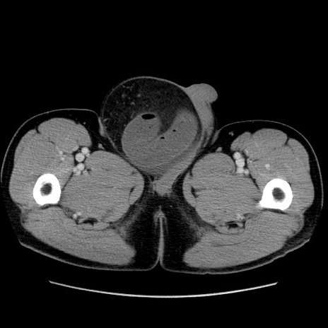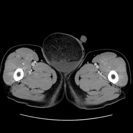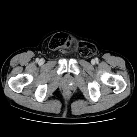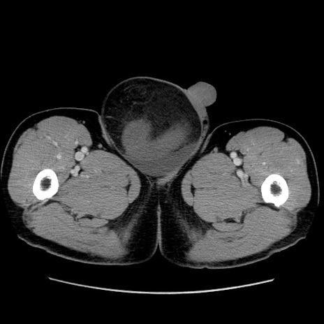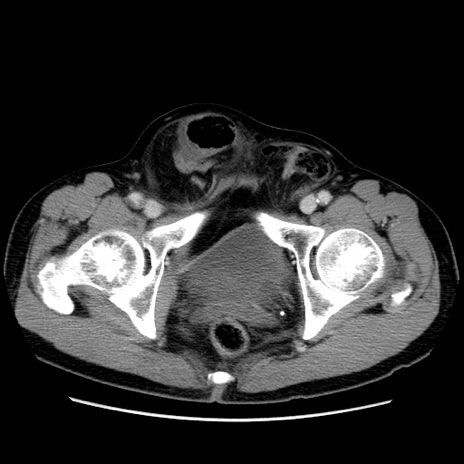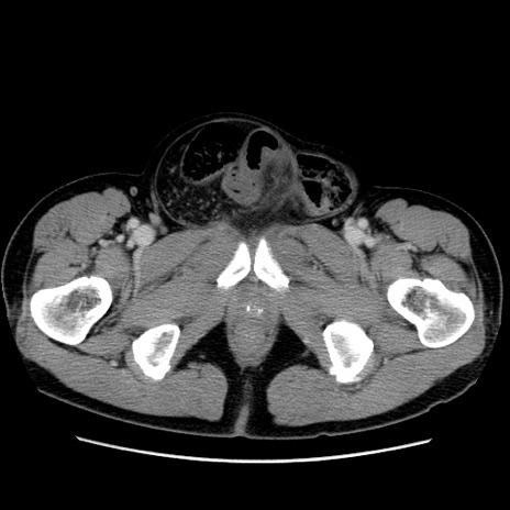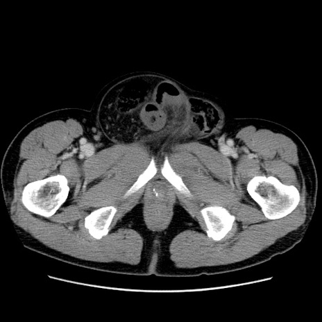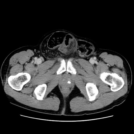 【症例】60歳代 男性 【主訴】右鼠径部膨隆 【現病歴】1年程前より右鼠径部膨隆あり。自己にて還納可能だったため放置していた。3時間前より右鼠径部の脱出を認め、還納困難となり受診。 【既往歴】高血圧 【身体所見】右鼠径部に小児頭大の膨隆あり。弾性硬であり、用手還納は困難。左鼠径部にも膨隆を認める。脱出はなし。 【データ】WBC 15500、CRP 測定なし