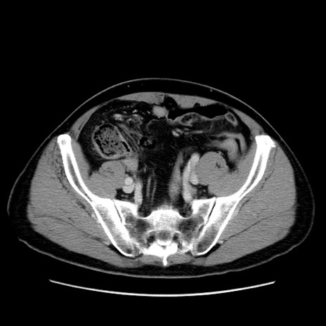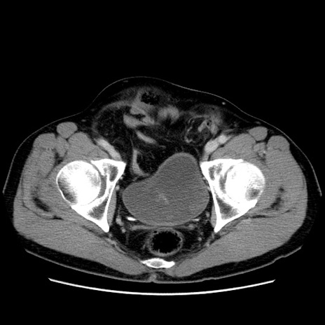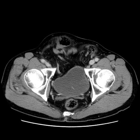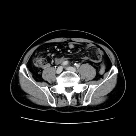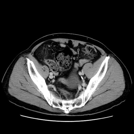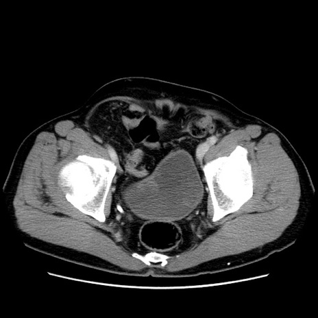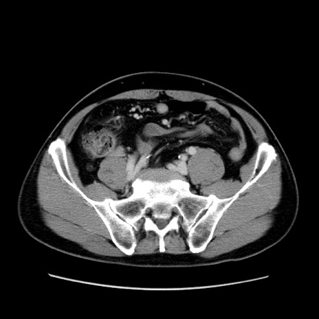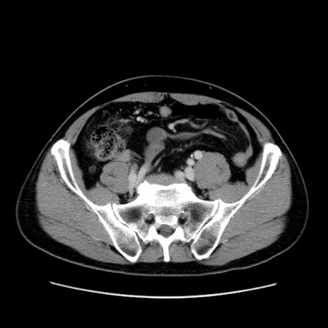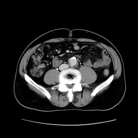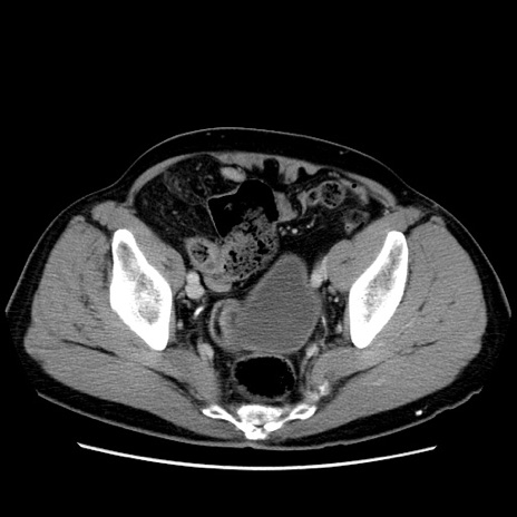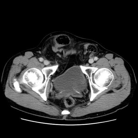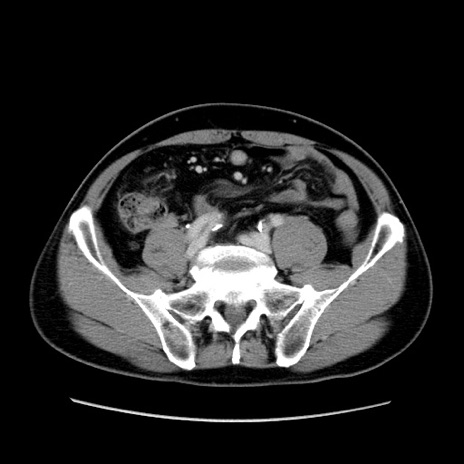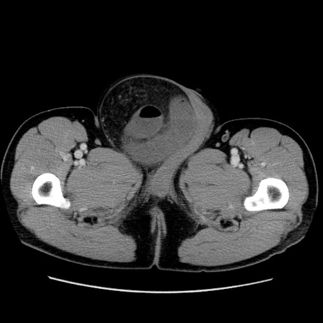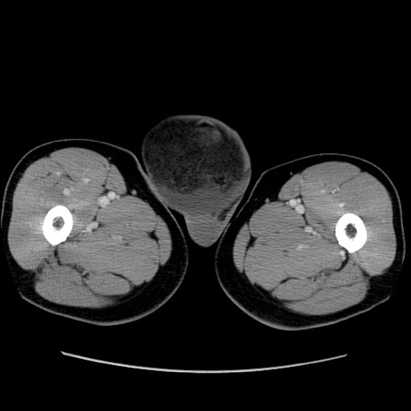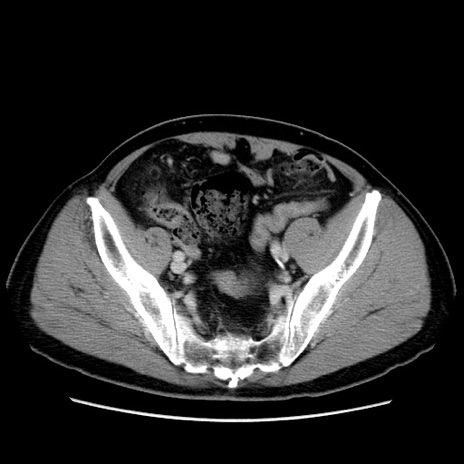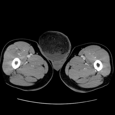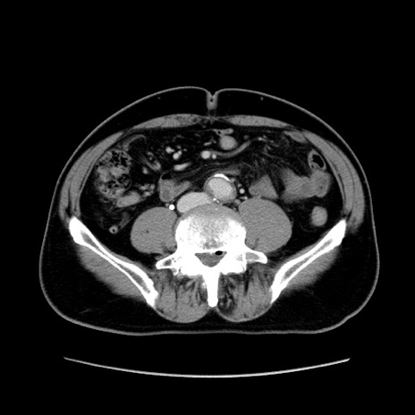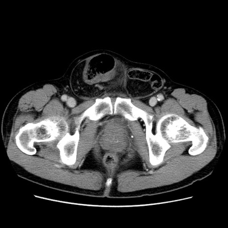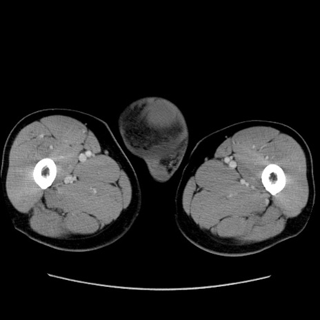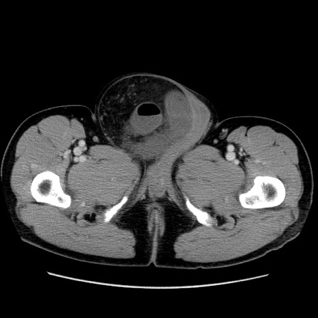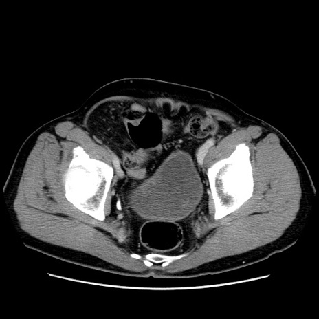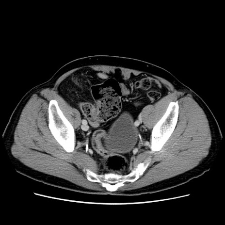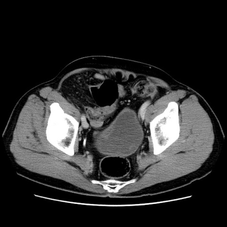 【症例】60歳代 男性 【主訴】右鼠径部膨隆 【現病歴】1年程前より右鼠径部膨隆あり。自己にて還納可能だったため放置していた。3時間前より右鼠径部の脱出を認め、還納困難となり受診。 【既往歴】高血圧 【身体所見】右鼠径部に小児頭大の膨隆あり。弾性硬であり、用手還納は困難。左鼠径部にも膨隆を認める。脱出はなし。 【データ】WBC 15500、CRP 測定なし