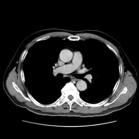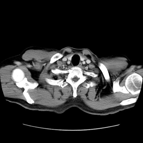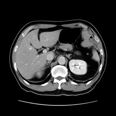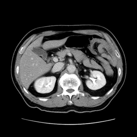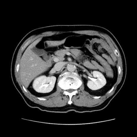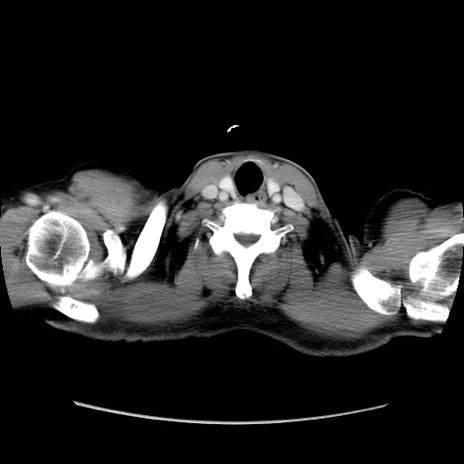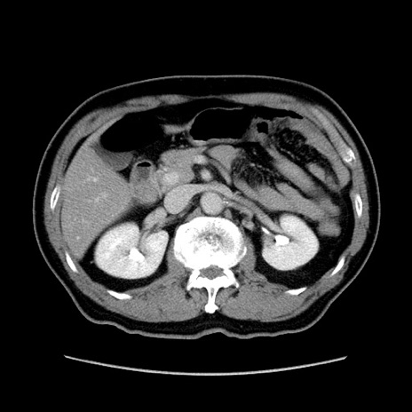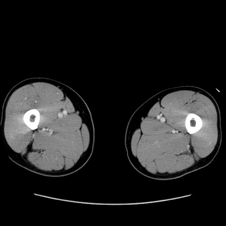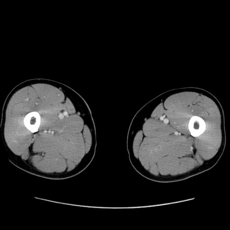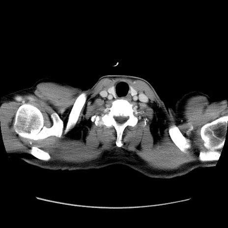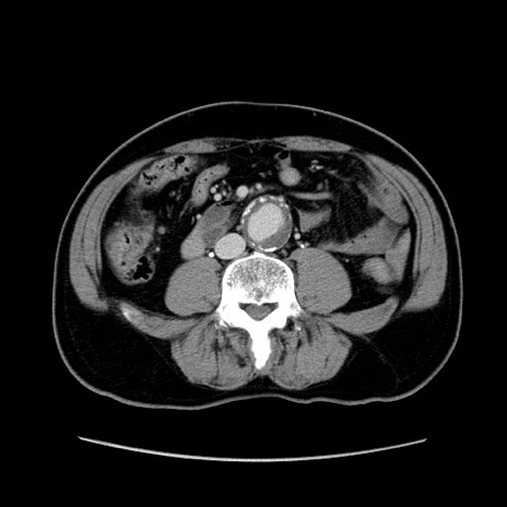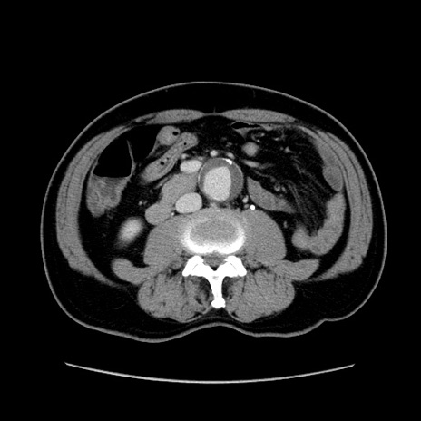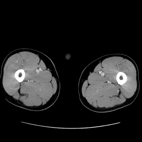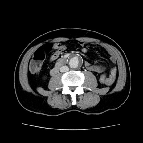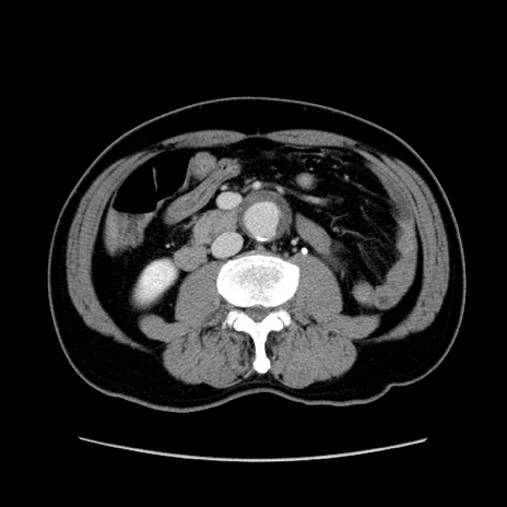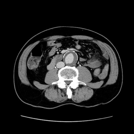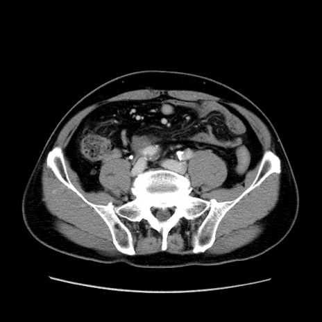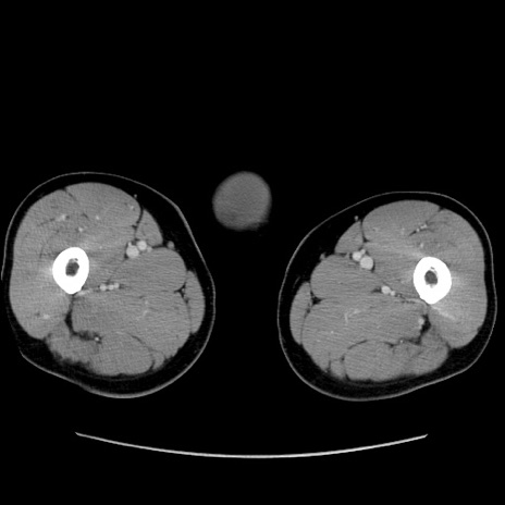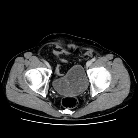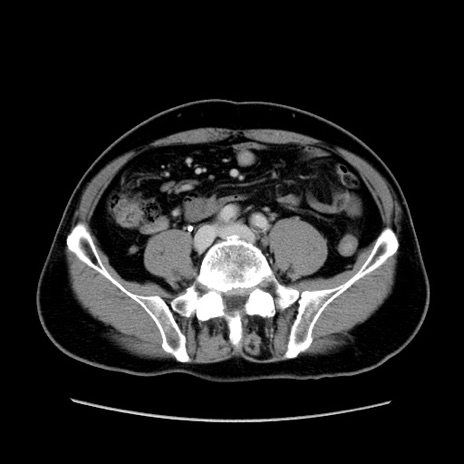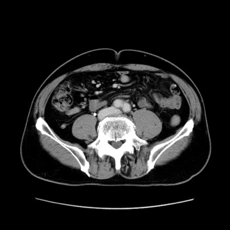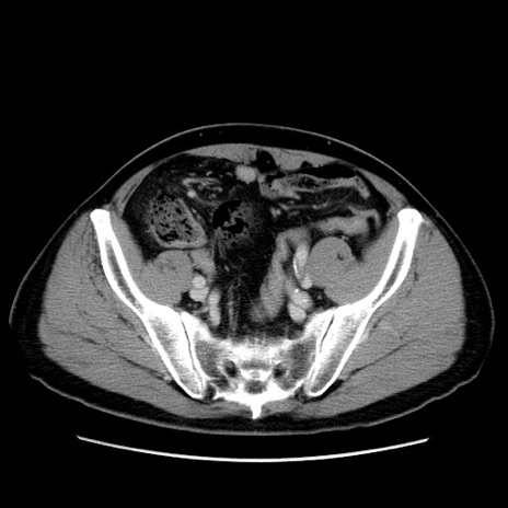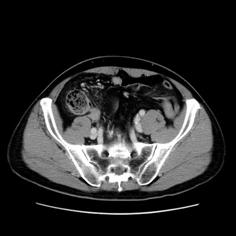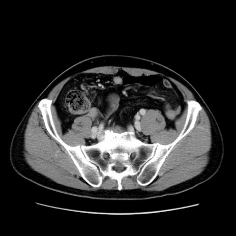 【症例】60歳代 男性 【主訴】右鼠径部膨隆 【現病歴】1年程前より右鼠径部膨隆あり。自己にて還納可能だったため放置していた。3時間前より右鼠径部の脱出を認め、還納困難となり受診。 【既往歴】高血圧 【身体所見】右鼠径部に小児頭大の膨隆あり。弾性硬であり、用手還納は困難。左鼠径部にも膨隆を認める。脱出はなし。 【データ】WBC 15500、CRP 測定なし