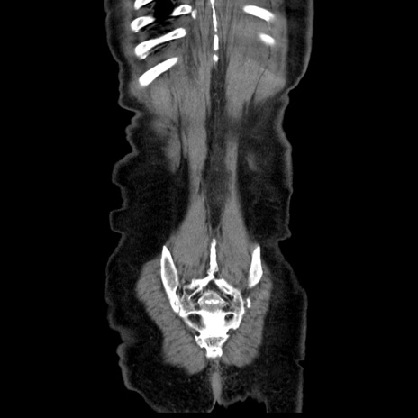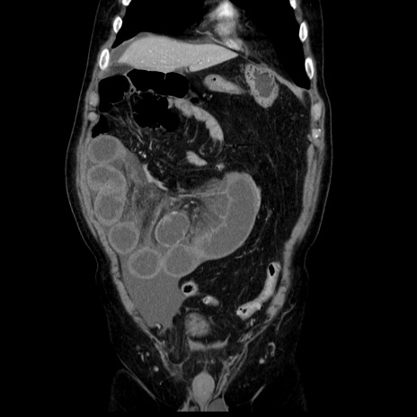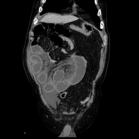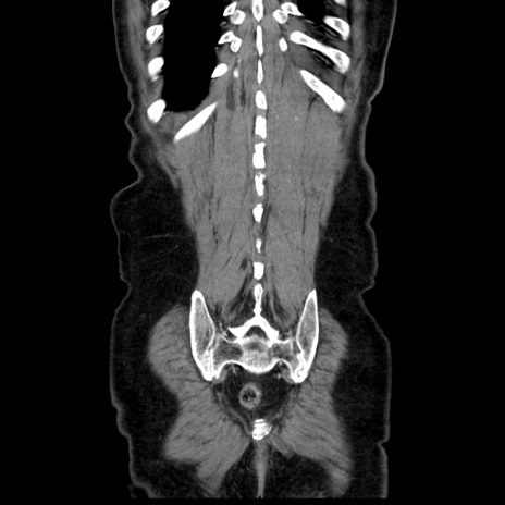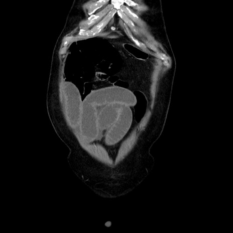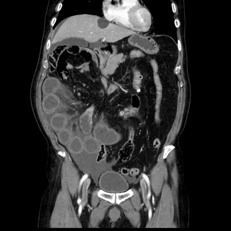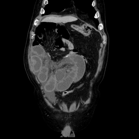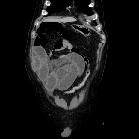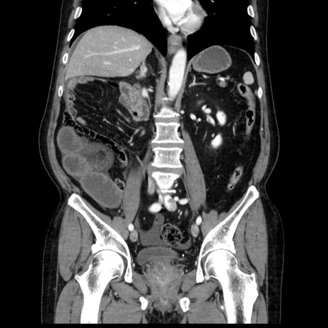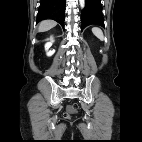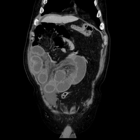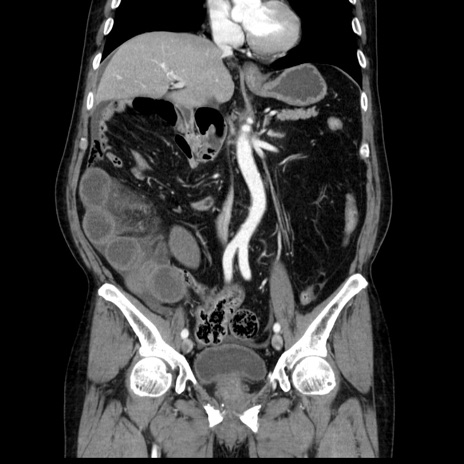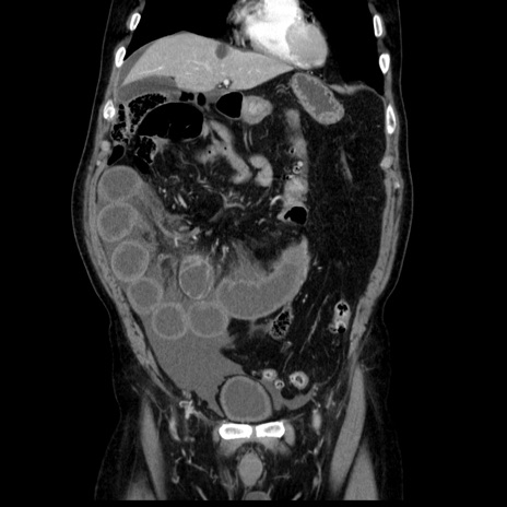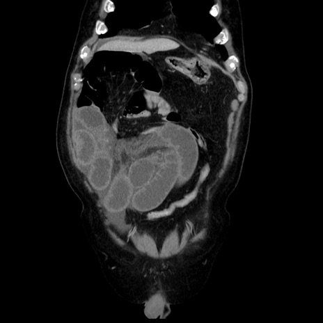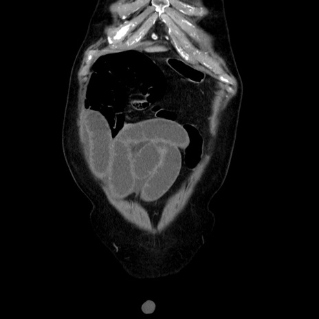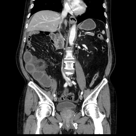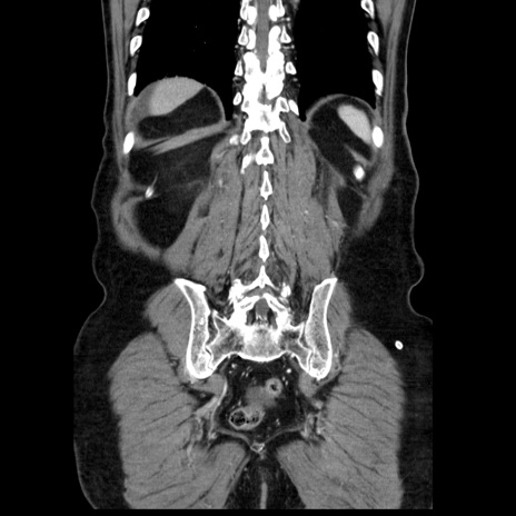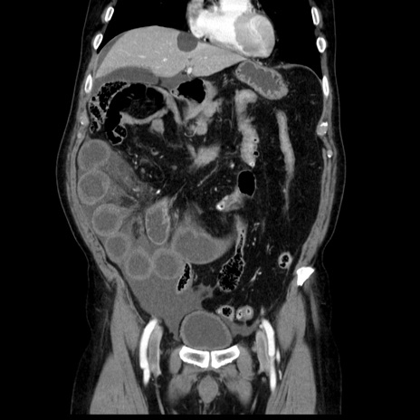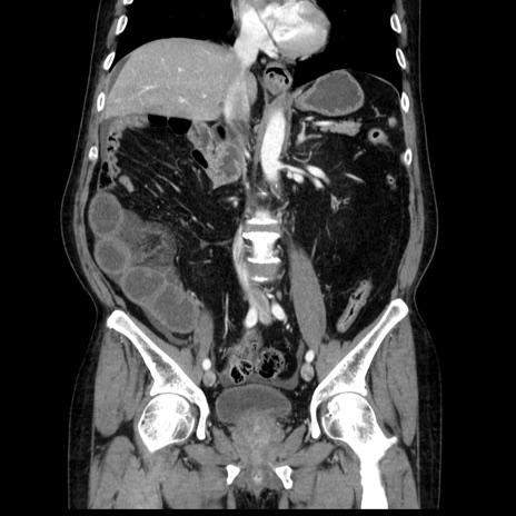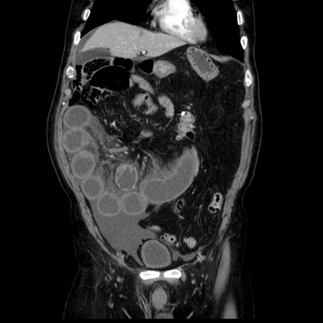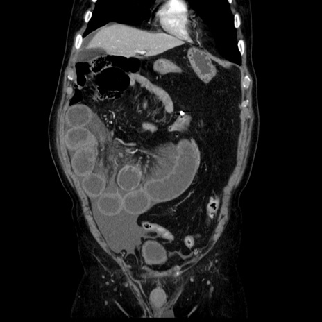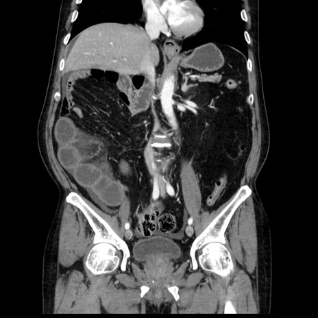 【症例】80歳代男性 【主訴】臍周囲痛 【現病歴】約6時間前から臍下部痛が出現。次第に腹部膨隆・背部痛も生じてきたため来院。背部痛の場所は変化しない。 【既往歴】腎盂腎炎 【身体所見】意識清明、BT 36.3℃、BP 131/87mmHg、P 87bpm、SpO2 100%(RA)、臍周囲自発痛・圧痛あり、反跳痛なし、自発痛部位に一致して板状硬あり、腹部膨隆、腸雑音減弱、CVA tenderness両側陰性。 【データ】WBC 19600、CRP 0.33