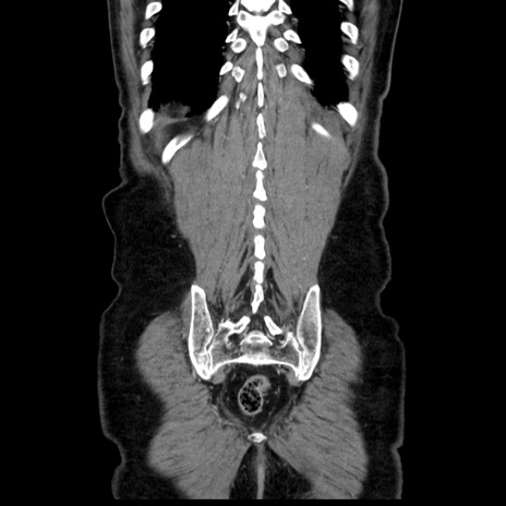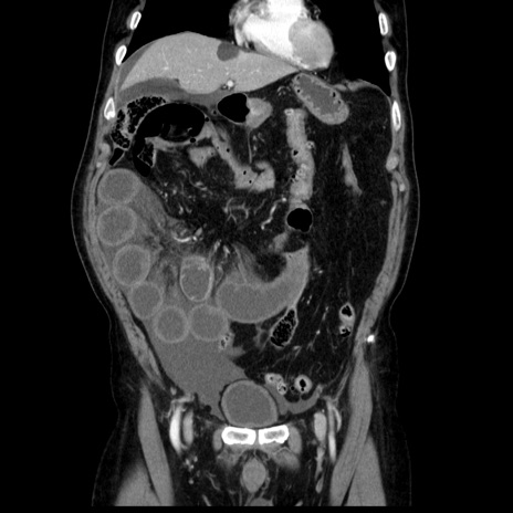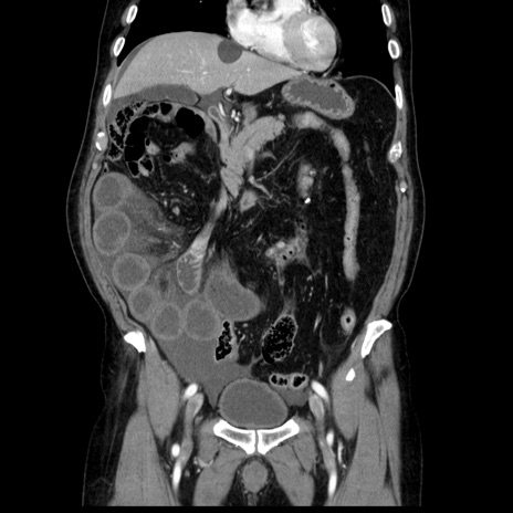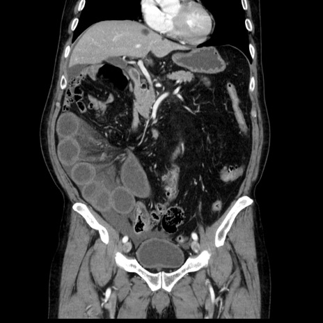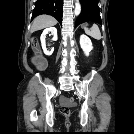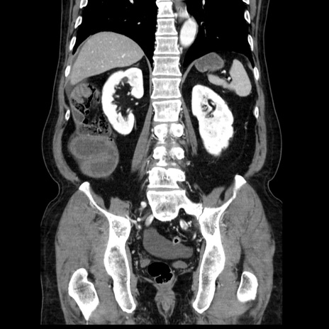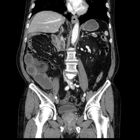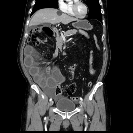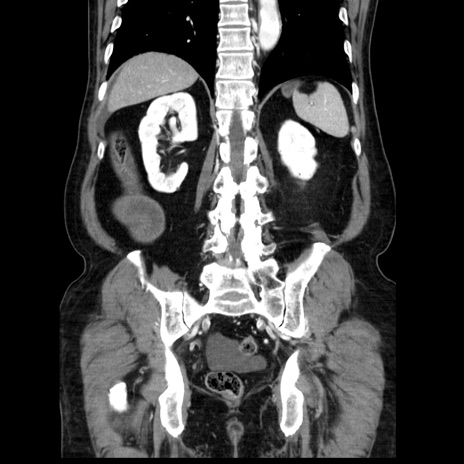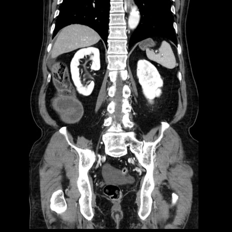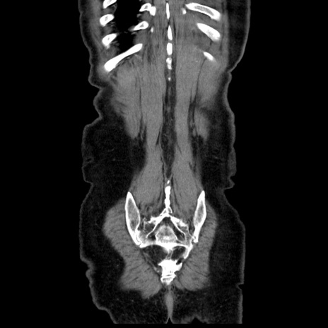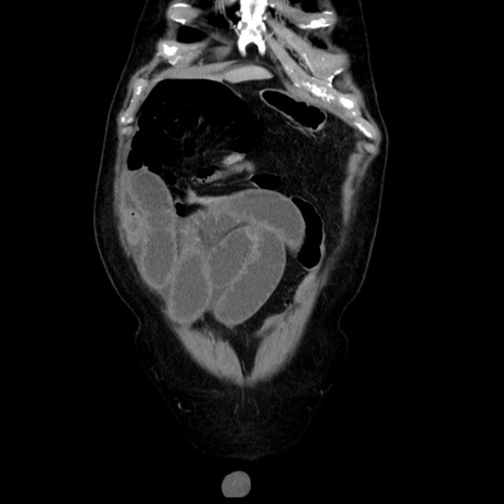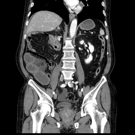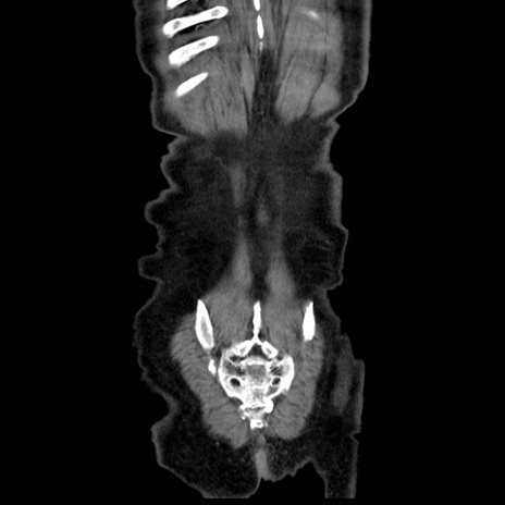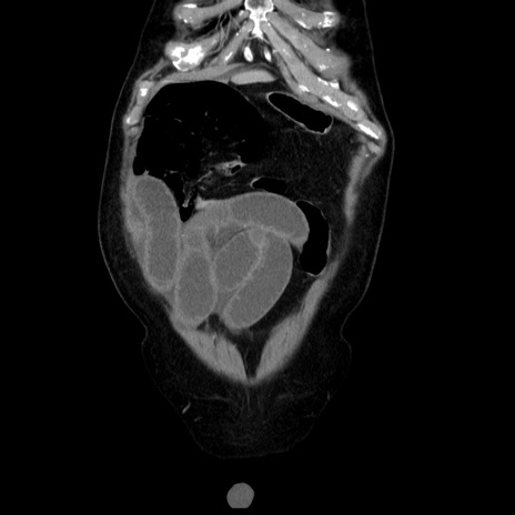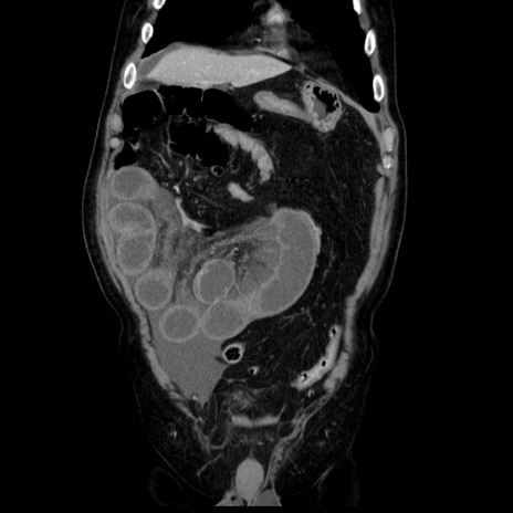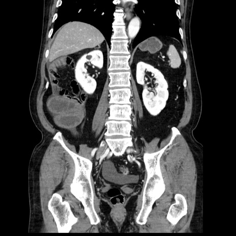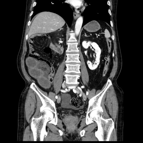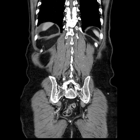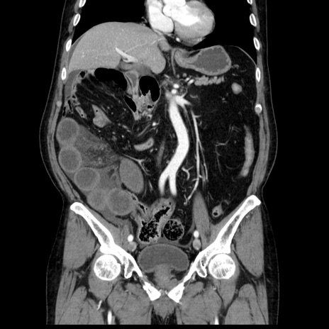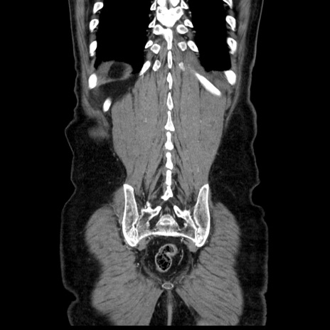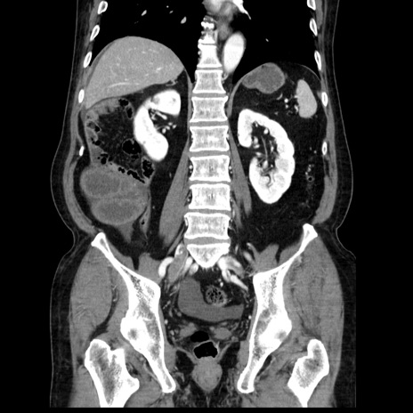 【症例】80歳代男性 【主訴】臍周囲痛 【現病歴】約6時間前から臍下部痛が出現。次第に腹部膨隆・背部痛も生じてきたため来院。背部痛の場所は変化しない。 【既往歴】腎盂腎炎 【身体所見】意識清明、BT 36.3℃、BP 131/87mmHg、P 87bpm、SpO2 100%(RA)、臍周囲自発痛・圧痛あり、反跳痛なし、自発痛部位に一致して板状硬あり、腹部膨隆、腸雑音減弱、CVA tenderness両側陰性。 【データ】WBC 19600、CRP 0.33