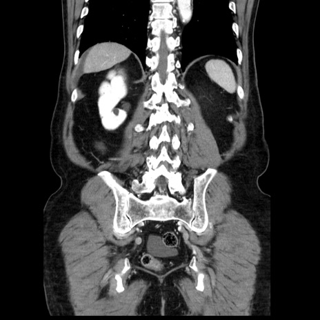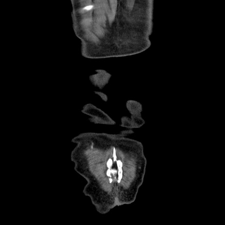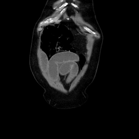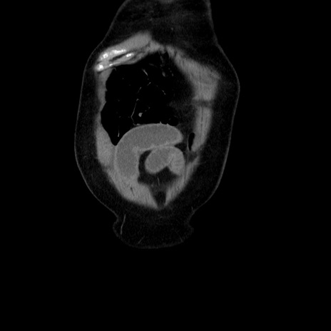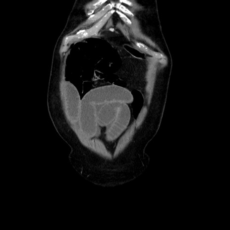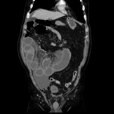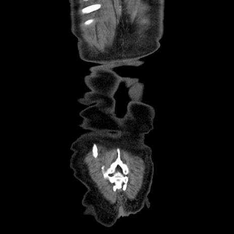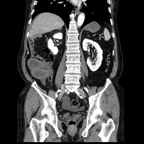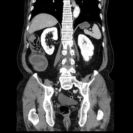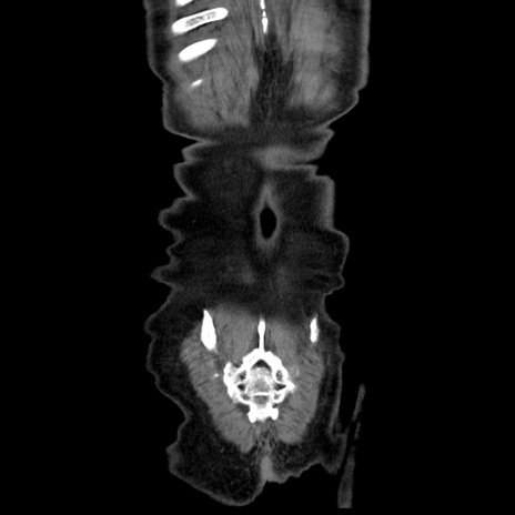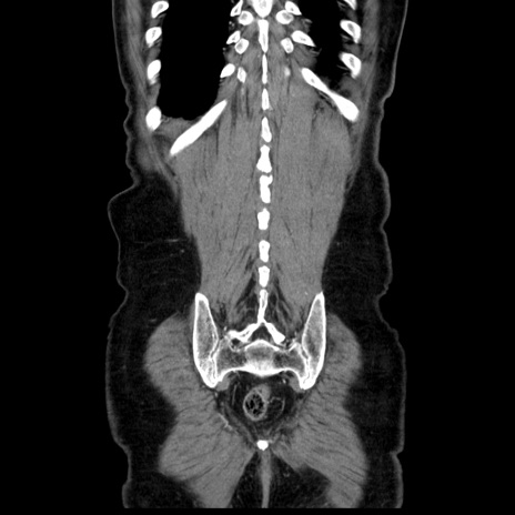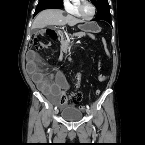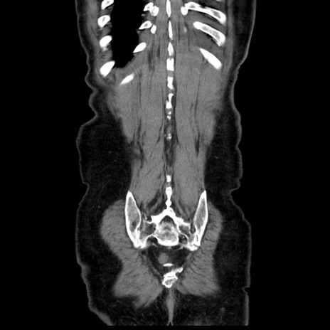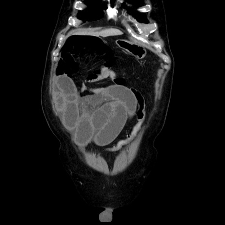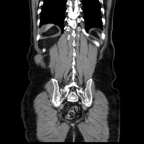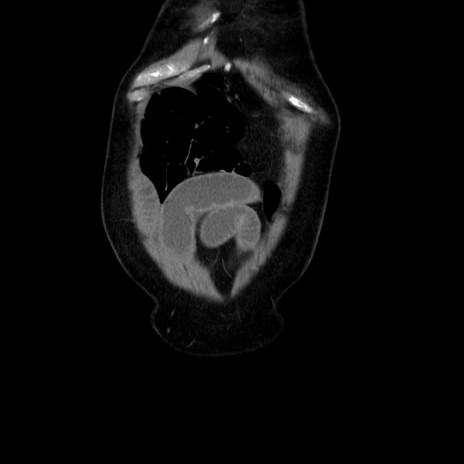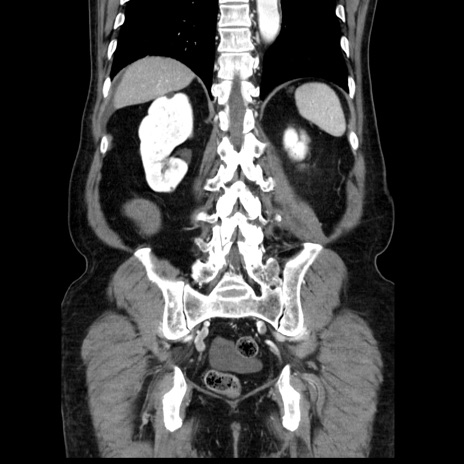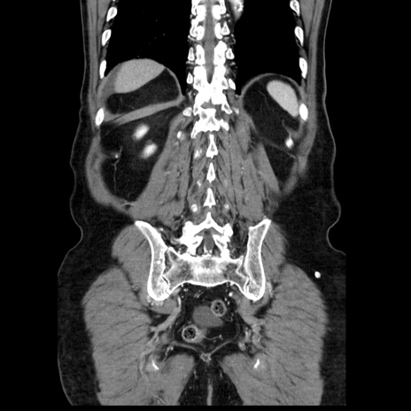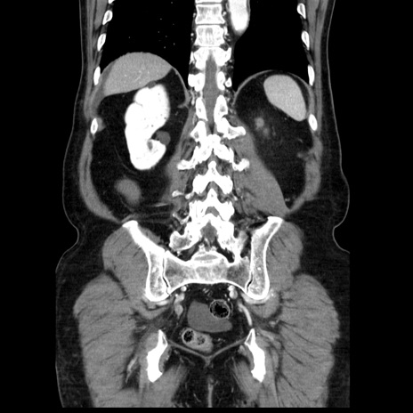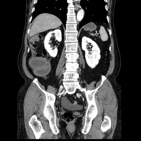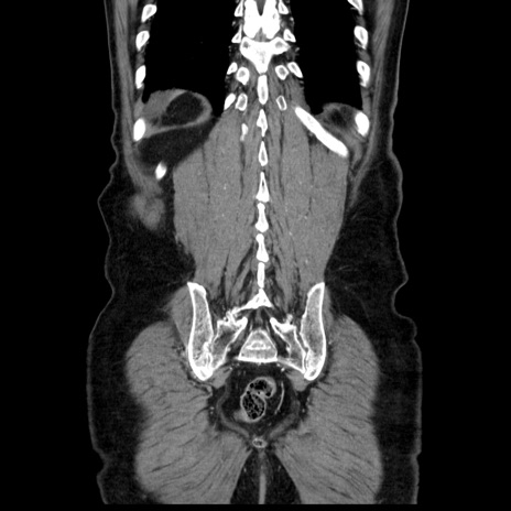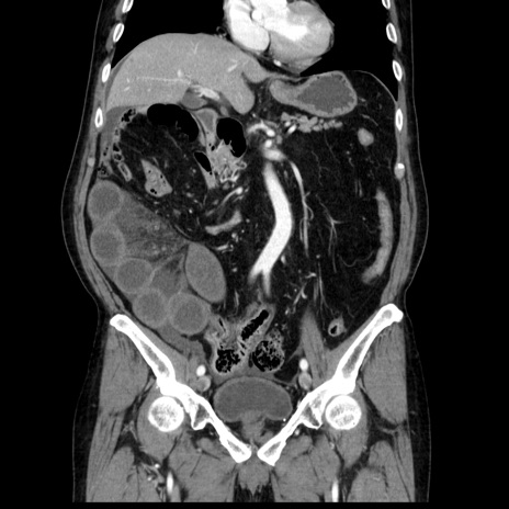 【症例】80歳代男性 【主訴】臍周囲痛 【現病歴】約6時間前から臍下部痛が出現。次第に腹部膨隆・背部痛も生じてきたため来院。背部痛の場所は変化しない。 【既往歴】腎盂腎炎 【身体所見】意識清明、BT 36.3℃、BP 131/87mmHg、P 87bpm、SpO2 100%(RA)、臍周囲自発痛・圧痛あり、反跳痛なし、自発痛部位に一致して板状硬あり、腹部膨隆、腸雑音減弱、CVA tenderness両側陰性。 【データ】WBC 19600、CRP 0.33