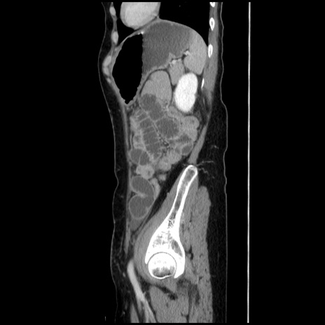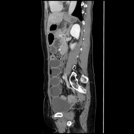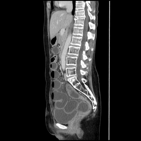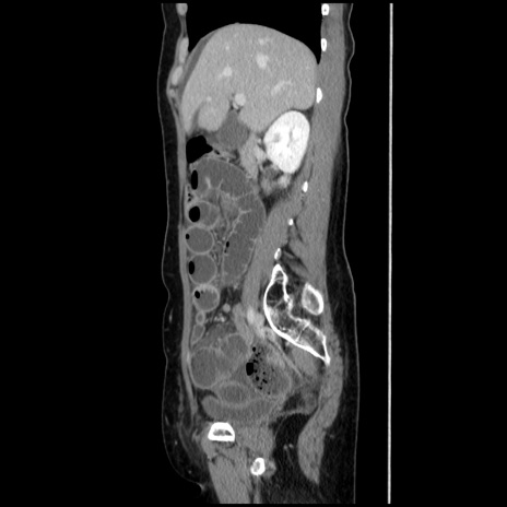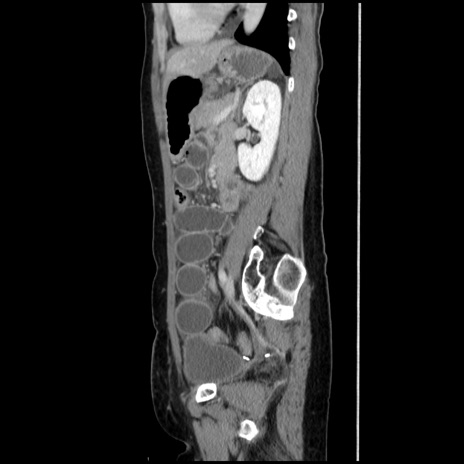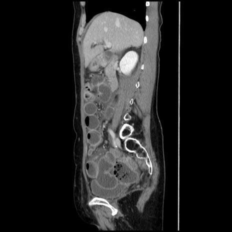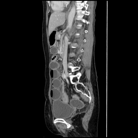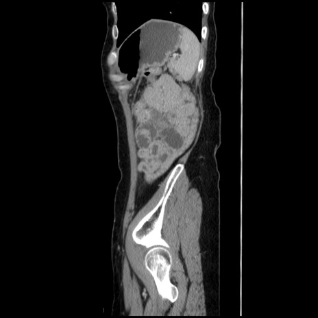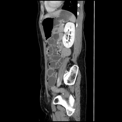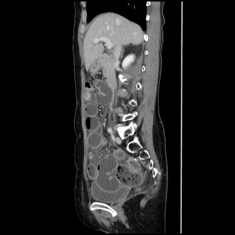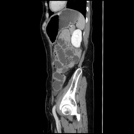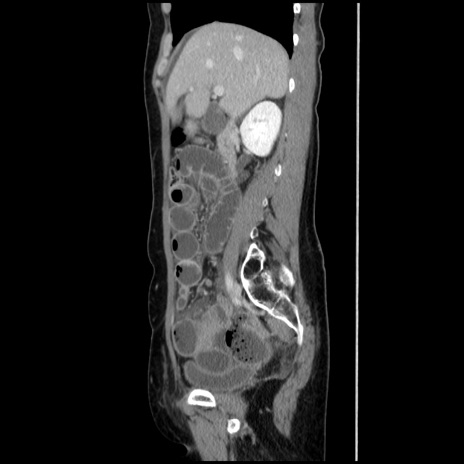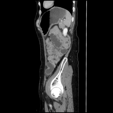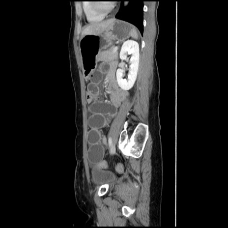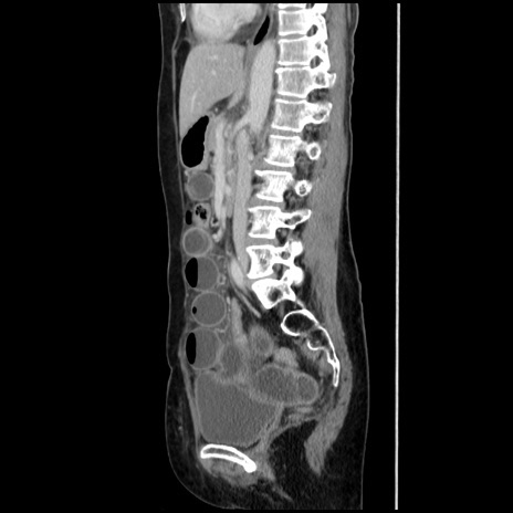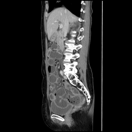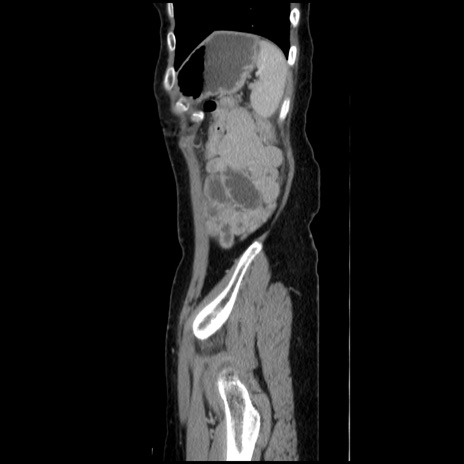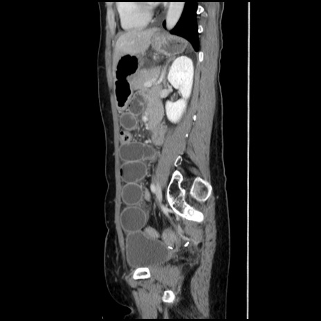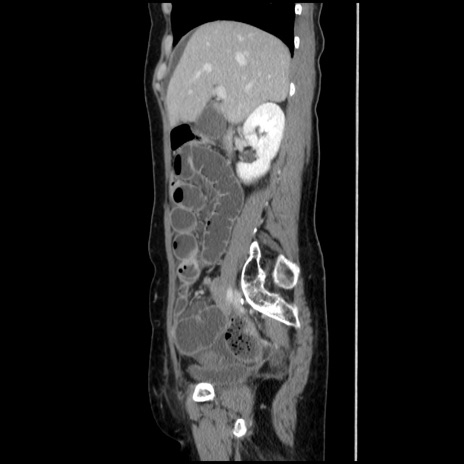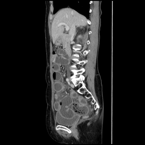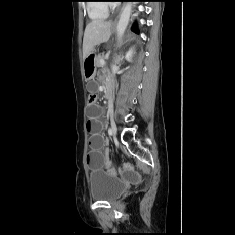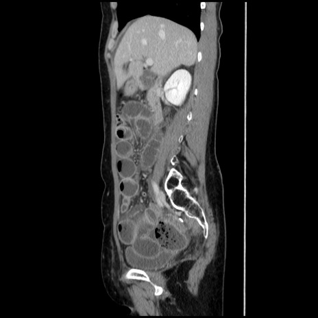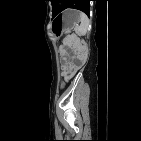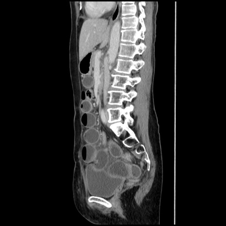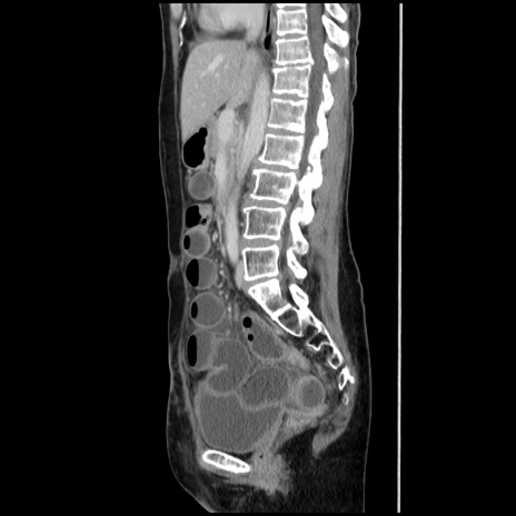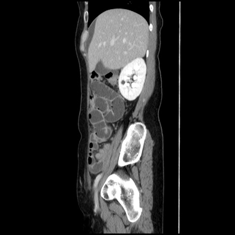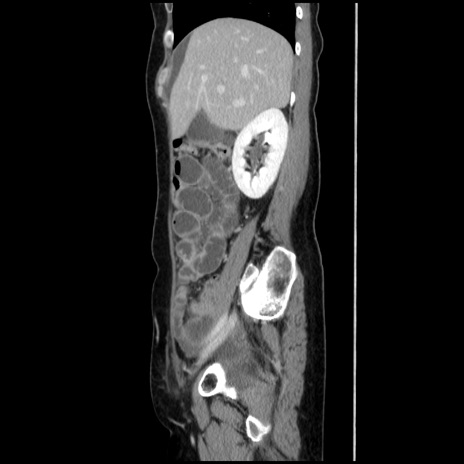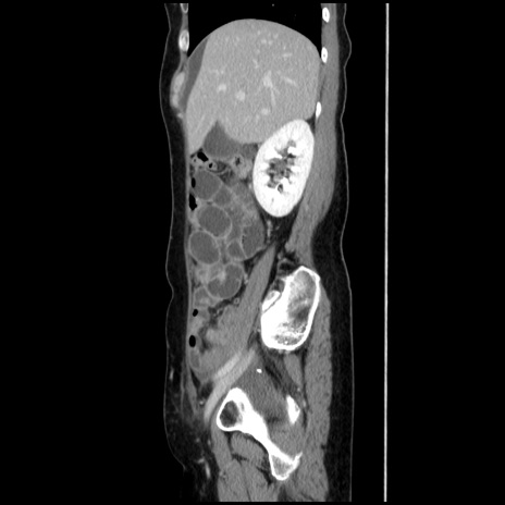 【症例】40歳代 女性 【主訴】上腹部痛、嘔気・嘔吐 【現病歴】約9時間前頃から急に上腹部痛、嘔気、嘔吐が出現。改善しないため救急要請。 【既往歴】子宮頚癌(広汎子宮全摘術、放射線療法)、腸閉塞 【身体所見】腹部:平坦、軟、腸雑音亢進、上腹部を中心に腹部全体に圧痛あり。 【データ】WBC 8400、CRP 0.03