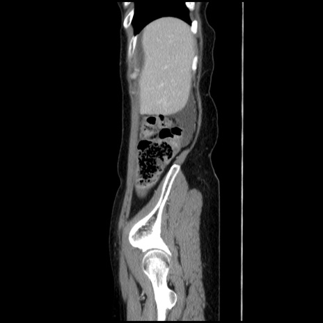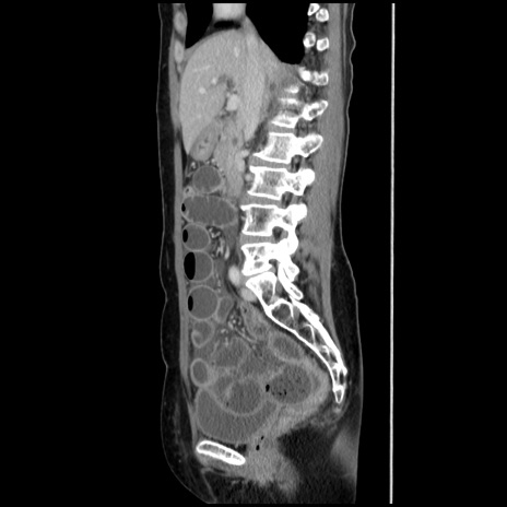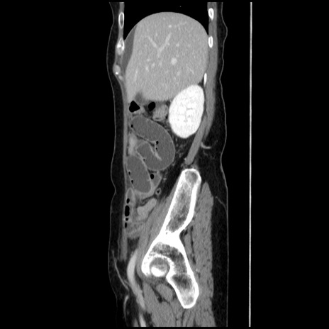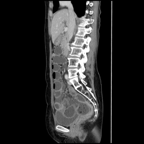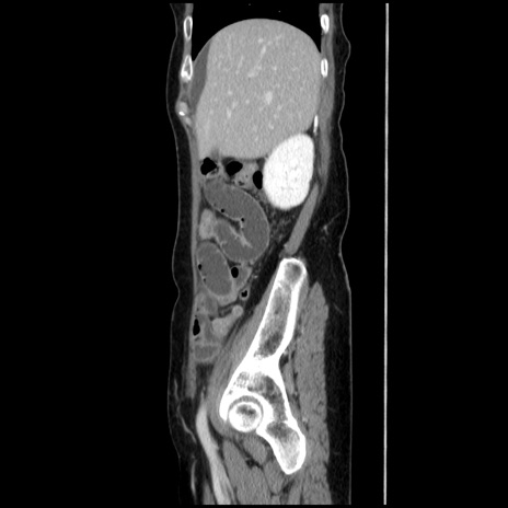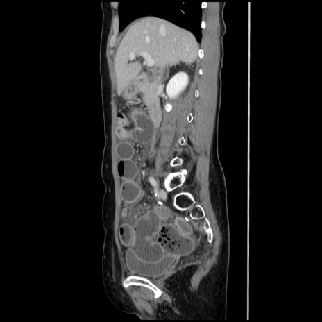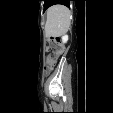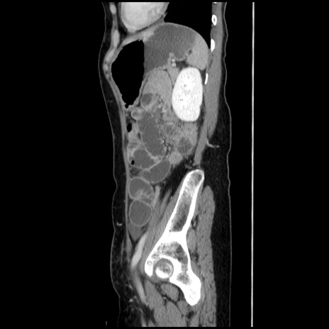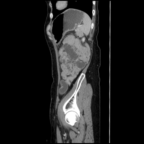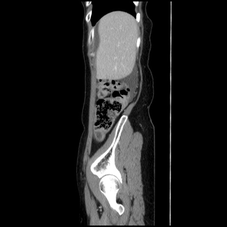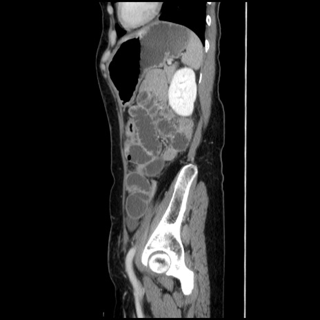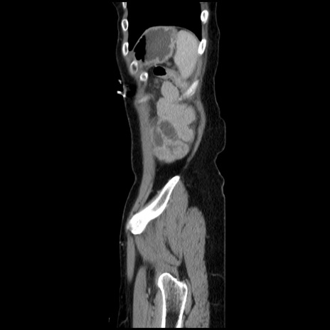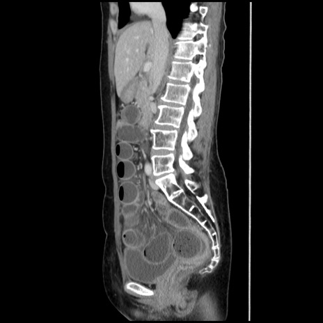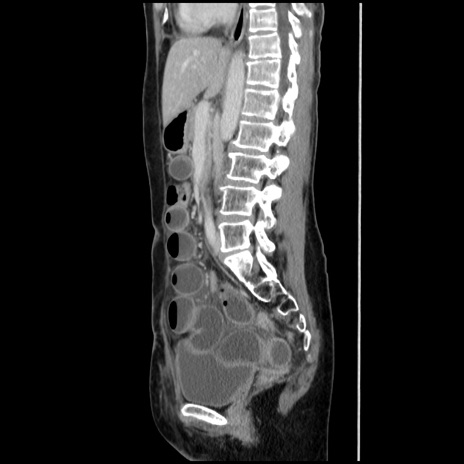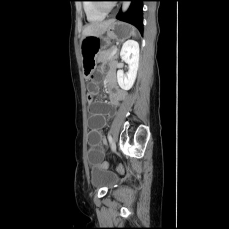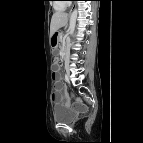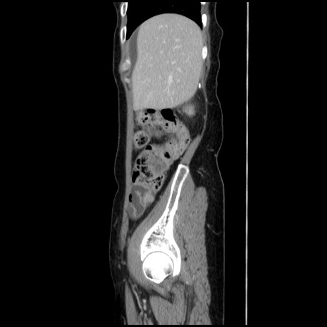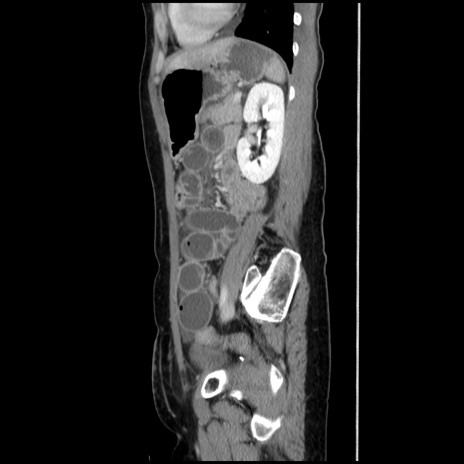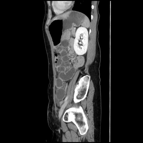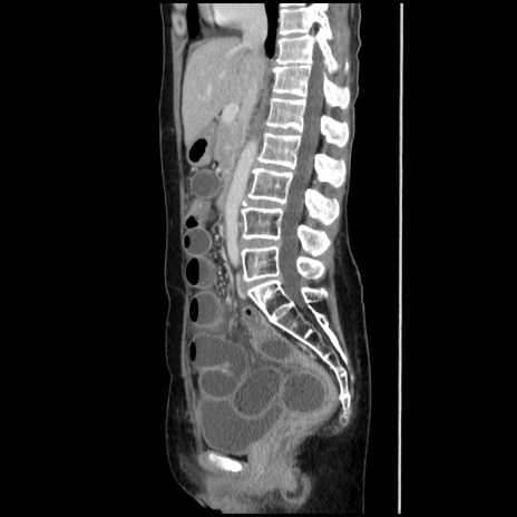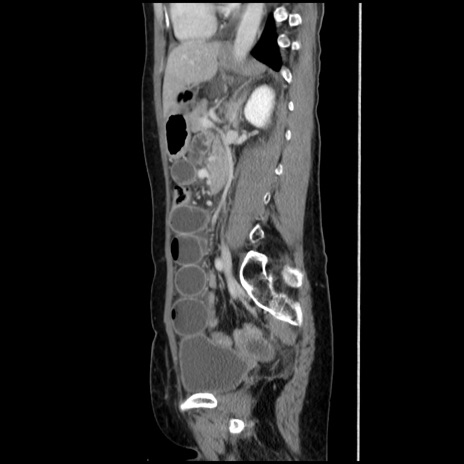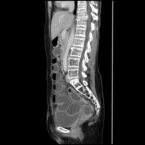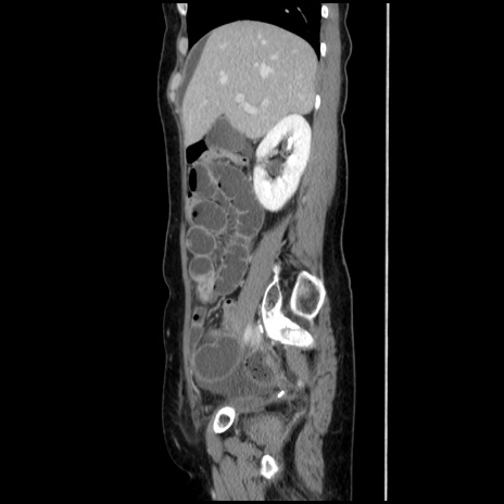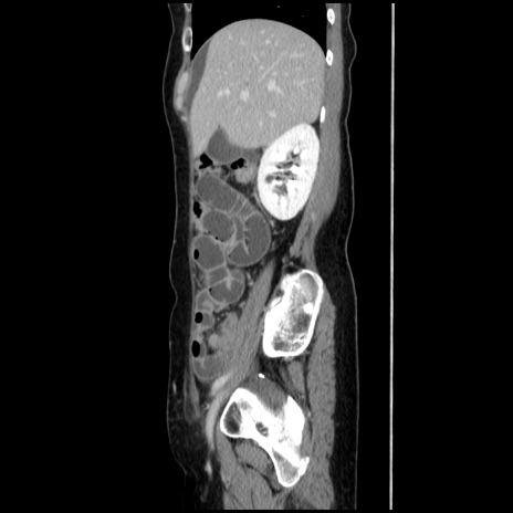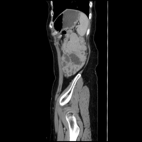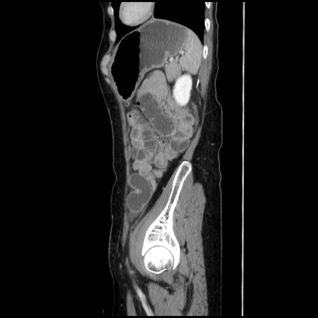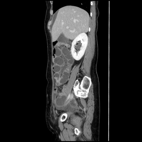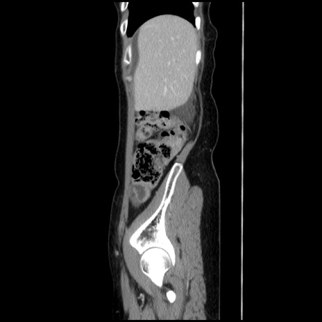 【症例】40歳代 女性 【主訴】上腹部痛、嘔気・嘔吐 【現病歴】約9時間前頃から急に上腹部痛、嘔気、嘔吐が出現。改善しないため救急要請。 【既往歴】子宮頚癌(広汎子宮全摘術、放射線療法)、腸閉塞 【身体所見】腹部:平坦、軟、腸雑音亢進、上腹部を中心に腹部全体に圧痛あり。 【データ】WBC 8400、CRP 0.03
