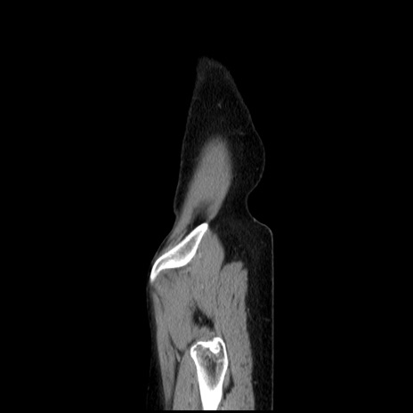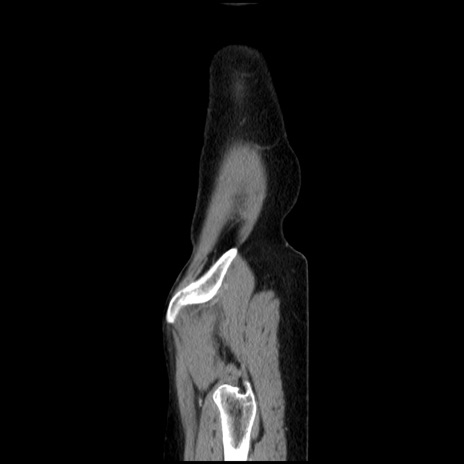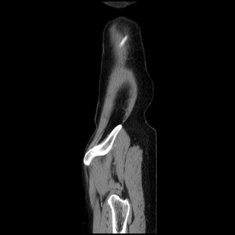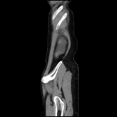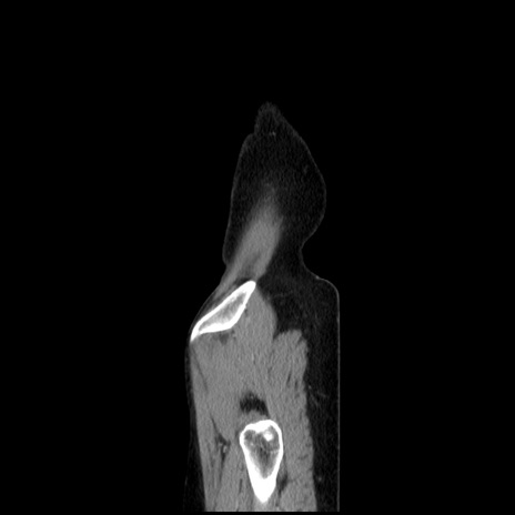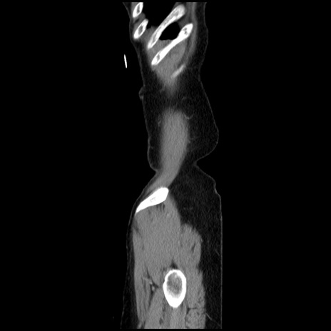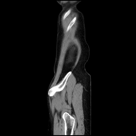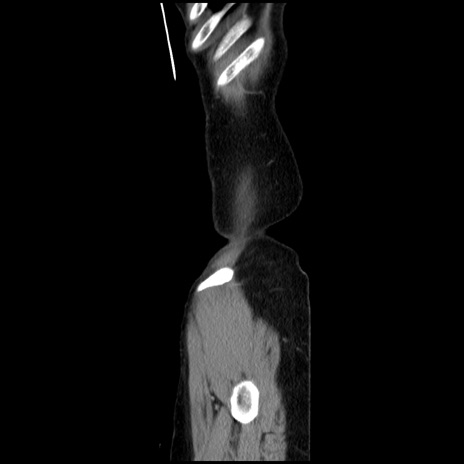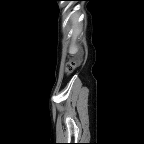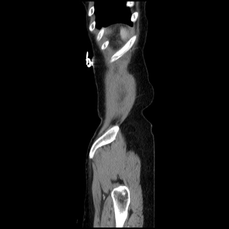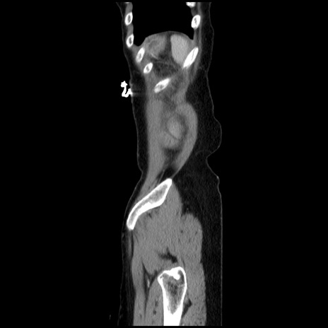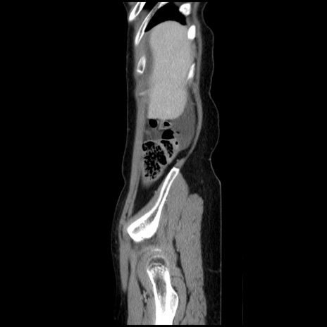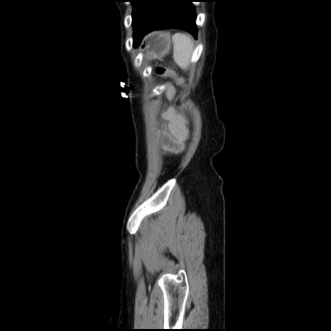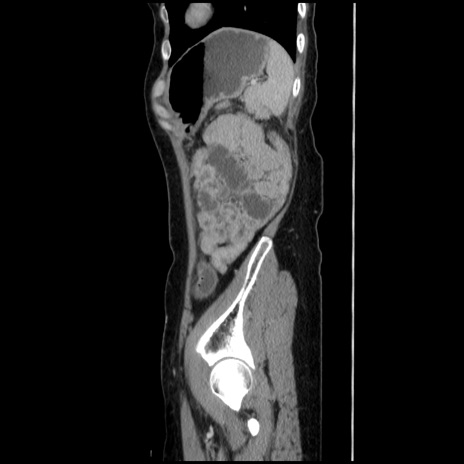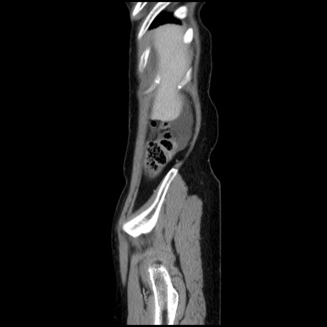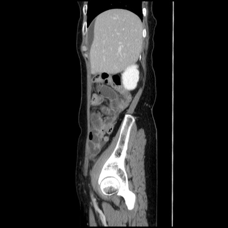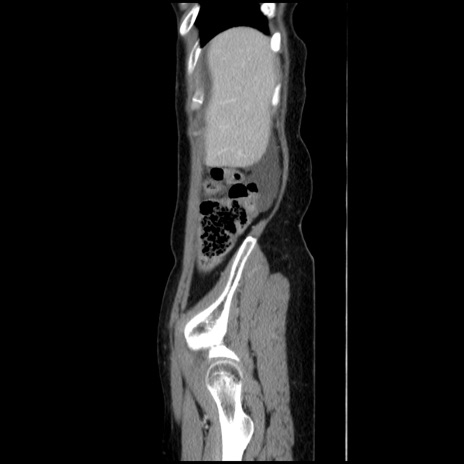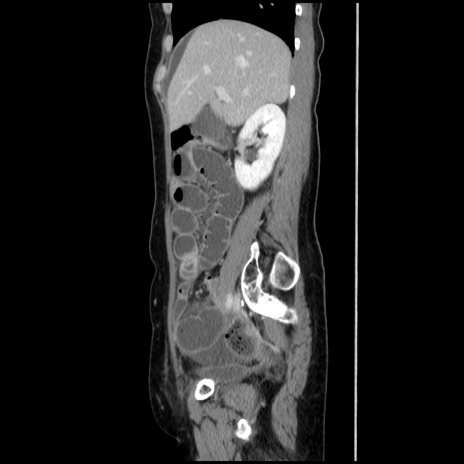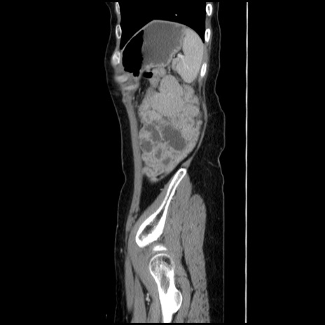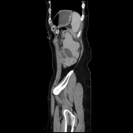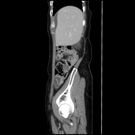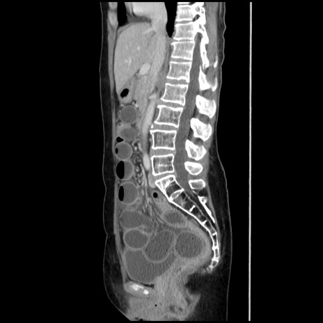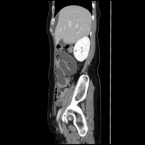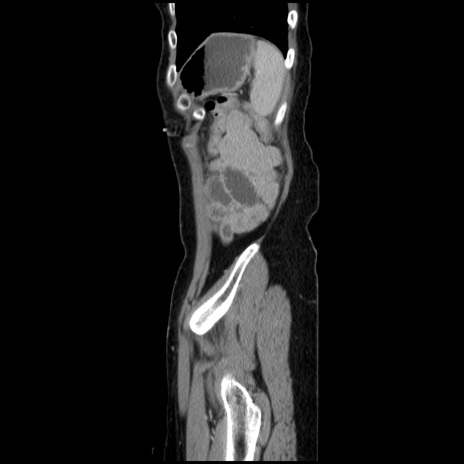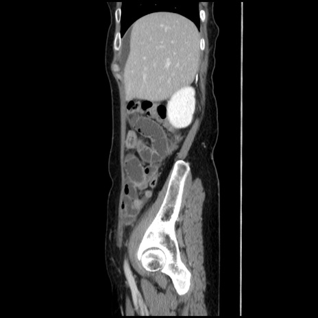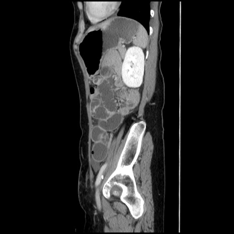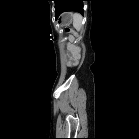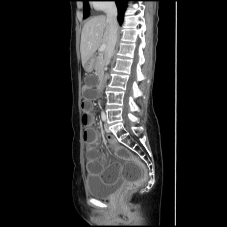 【症例】40歳代 女性 【主訴】上腹部痛、嘔気・嘔吐 【現病歴】約9時間前頃から急に上腹部痛、嘔気、嘔吐が出現。改善しないため救急要請。 【既往歴】子宮頚癌(広汎子宮全摘術、放射線療法)、腸閉塞 【身体所見】腹部:平坦、軟、腸雑音亢進、上腹部を中心に腹部全体に圧痛あり。 【データ】WBC 8400、CRP 0.03