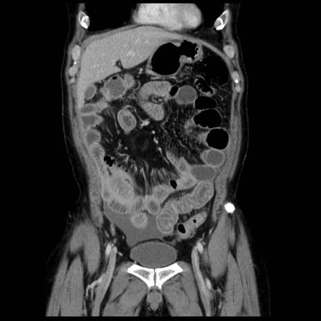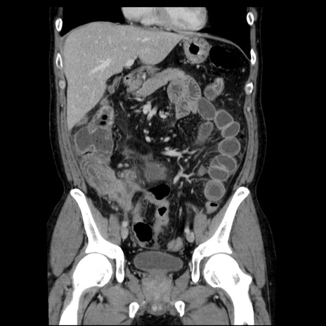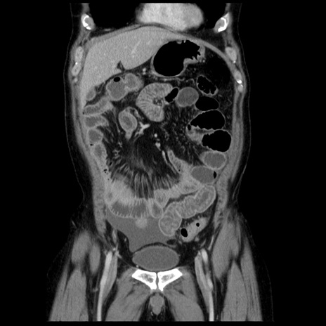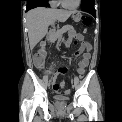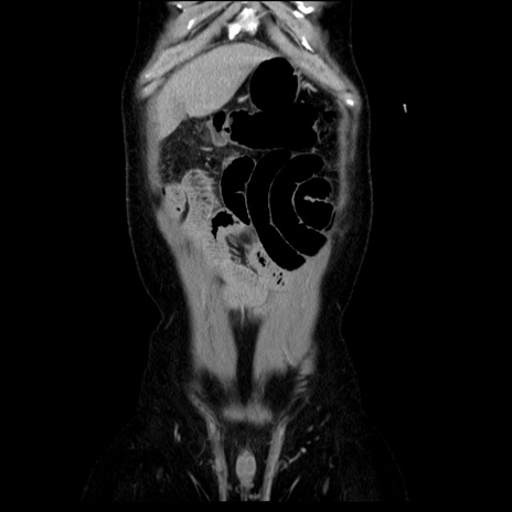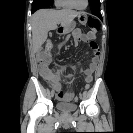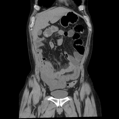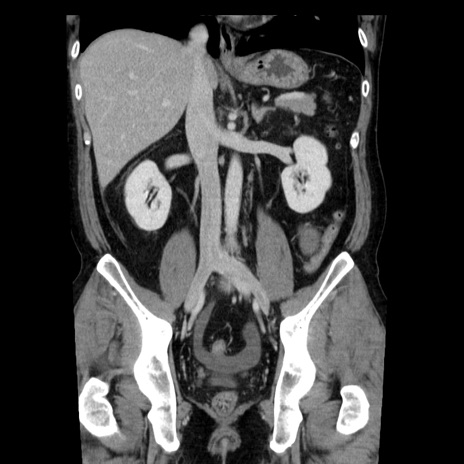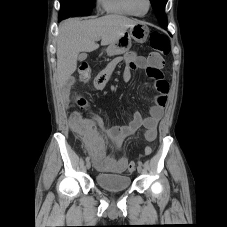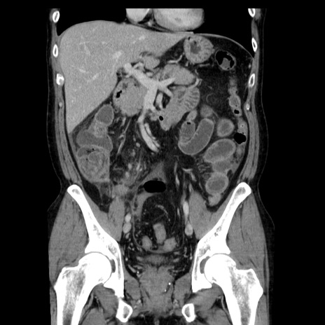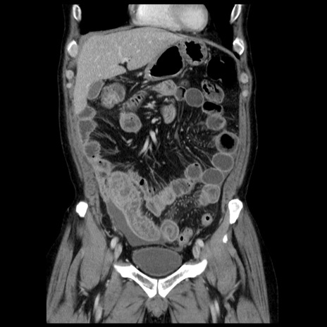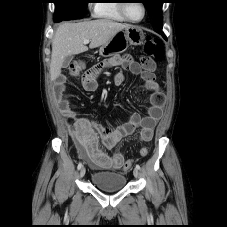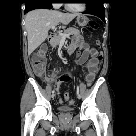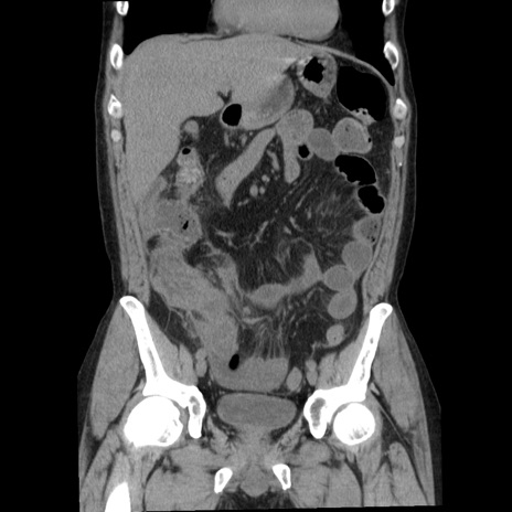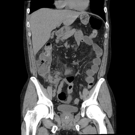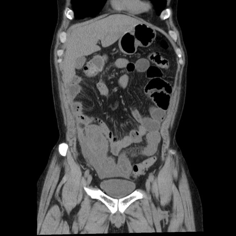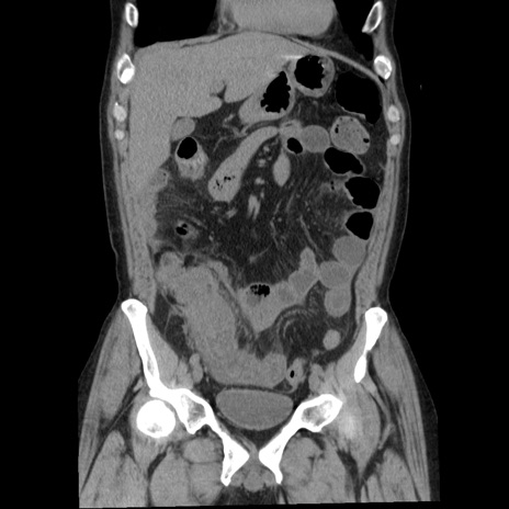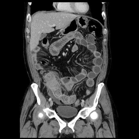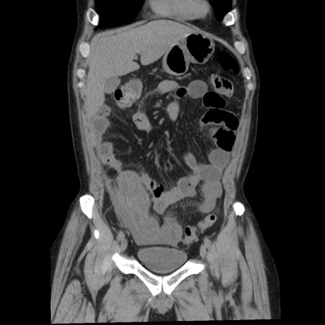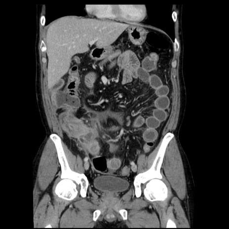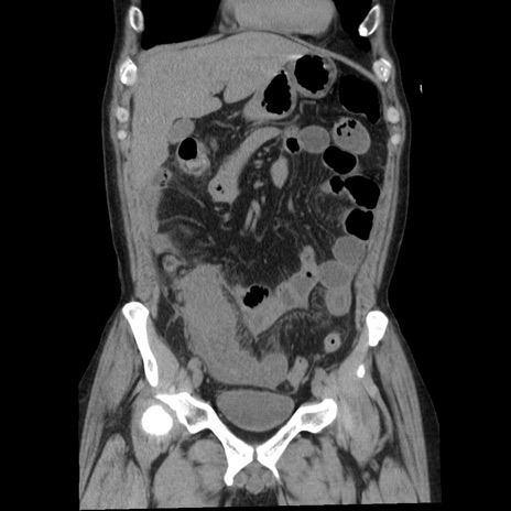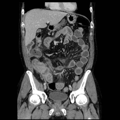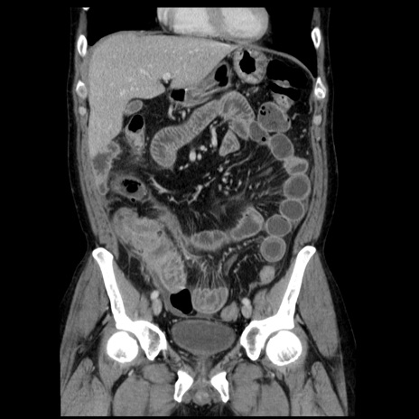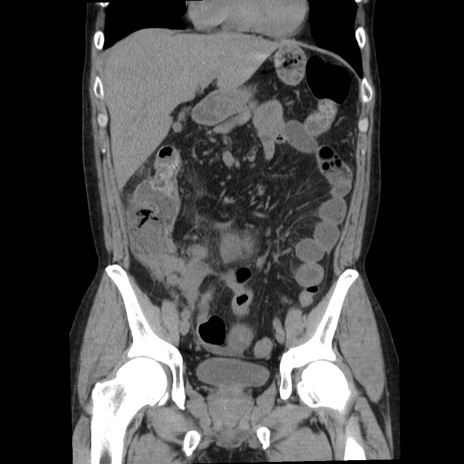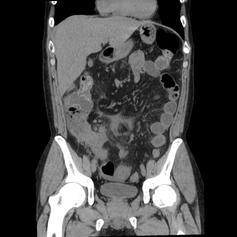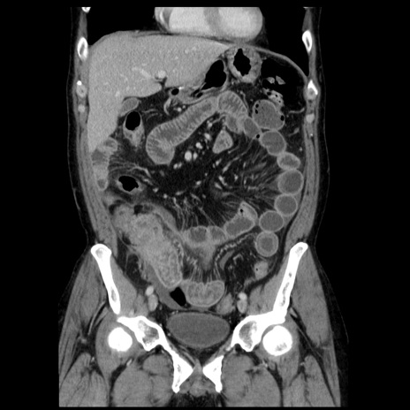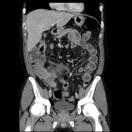 【症例】40歳代男性 【現病歴】2日前から胃痛あり。徐々に周期的な激痛に変化した。本日になっても激痛があるため受診。 【既往歴】なし 【身体所見】意識清明、BT 38-39℃台あり、腹部:膨満、やや硬、右下腹部に圧痛あり。 【データ】WBC 8500、CRP 23.26