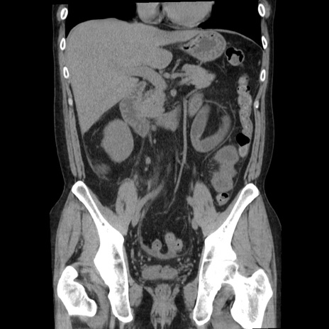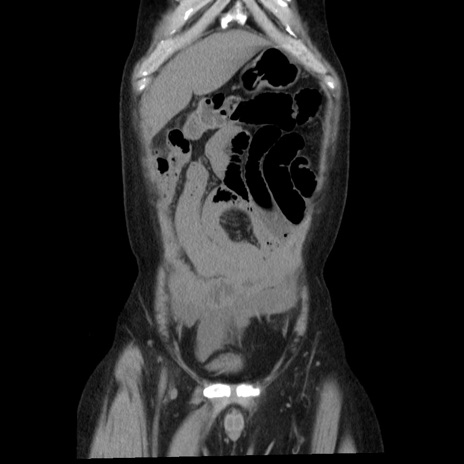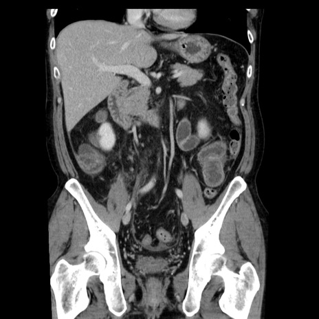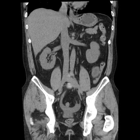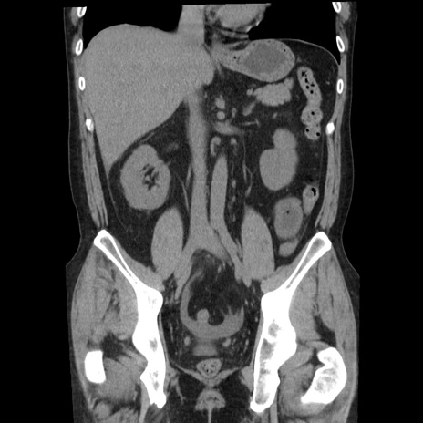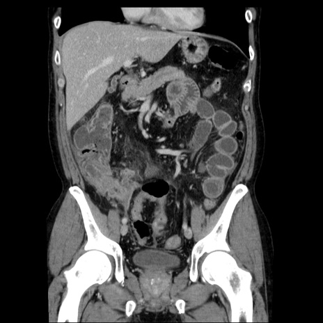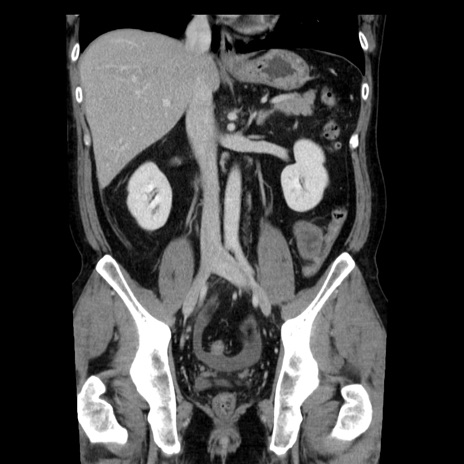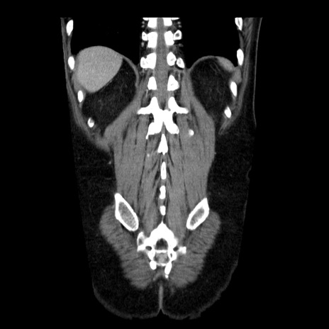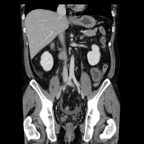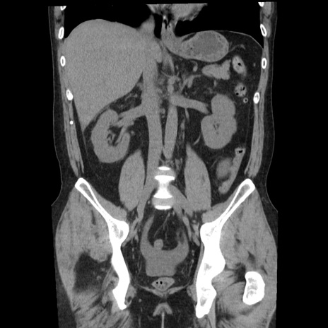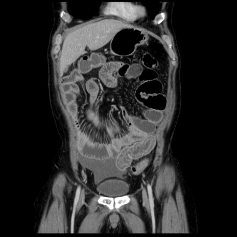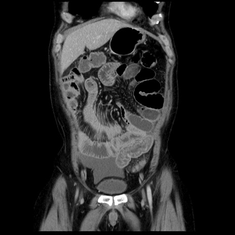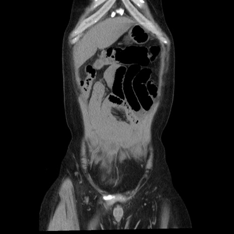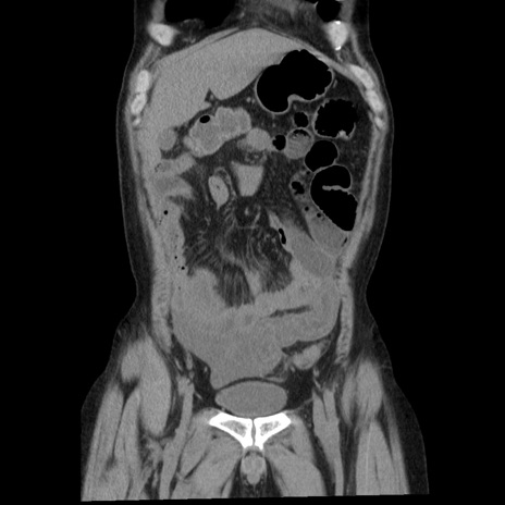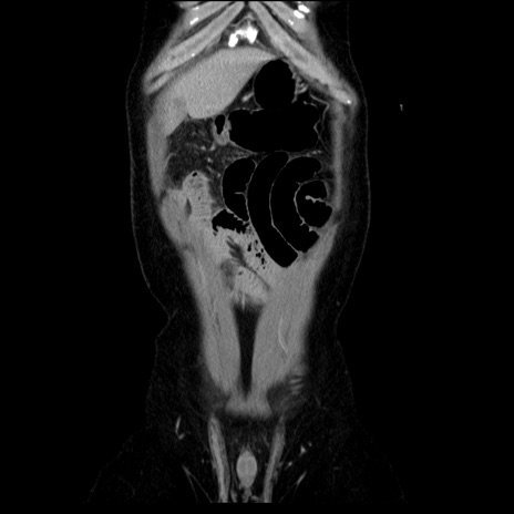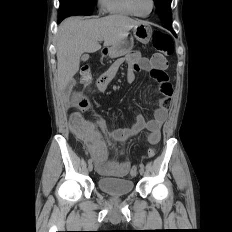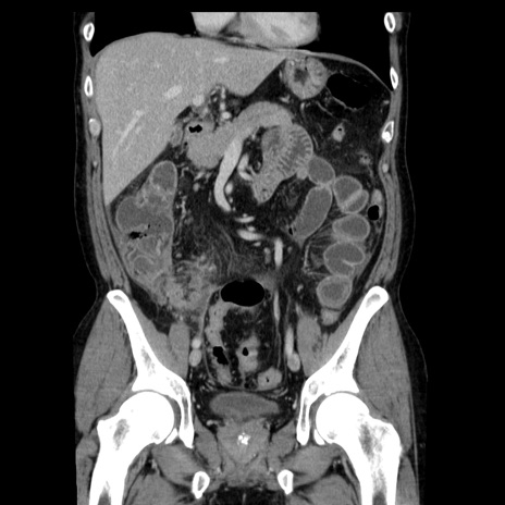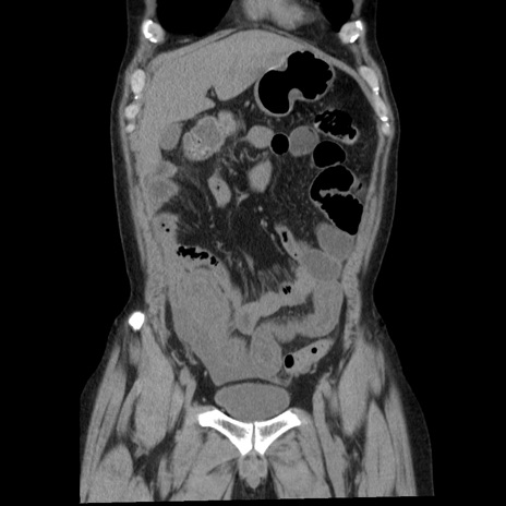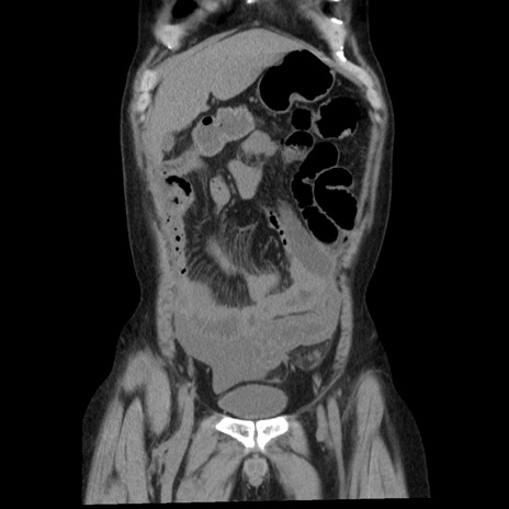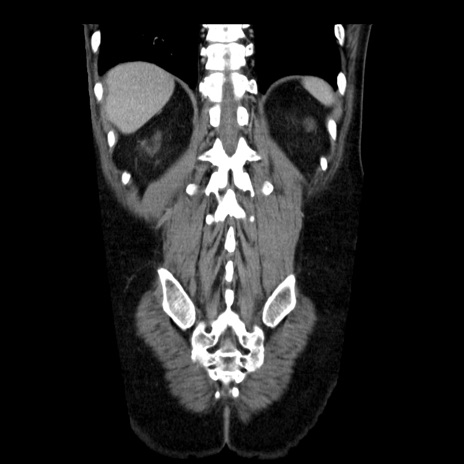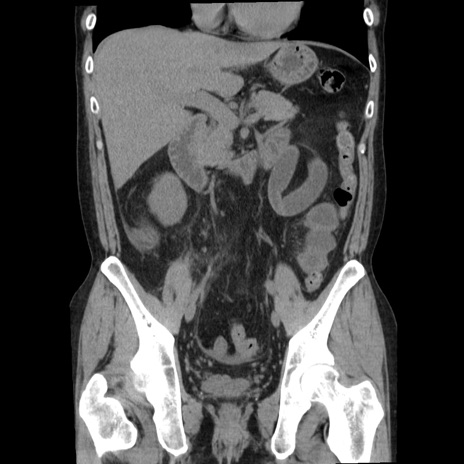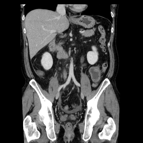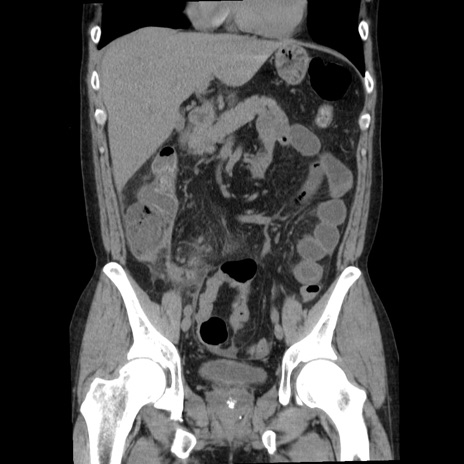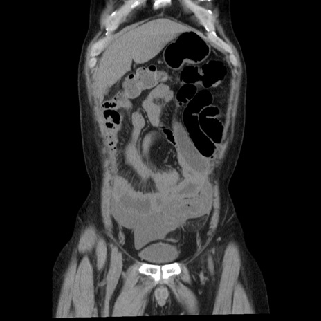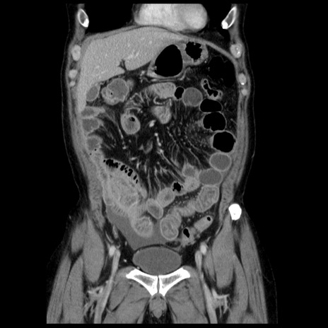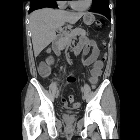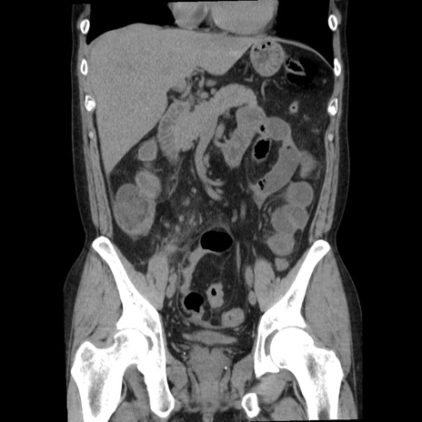 【症例】40歳代男性 【現病歴】2日前から胃痛あり。徐々に周期的な激痛に変化した。本日になっても激痛があるため受診。 【既往歴】なし 【身体所見】意識清明、BT 38-39℃台あり、腹部:膨満、やや硬、右下腹部に圧痛あり。 【データ】WBC 8500、CRP 23.26