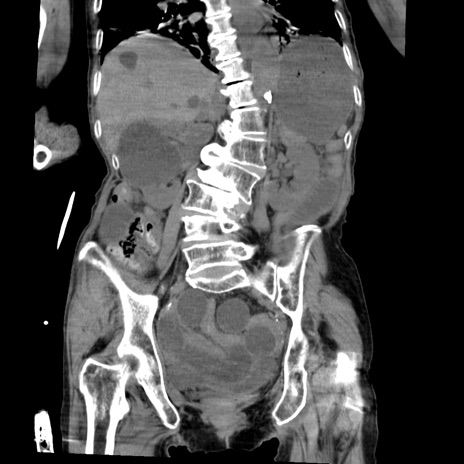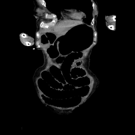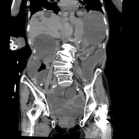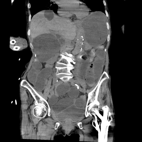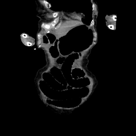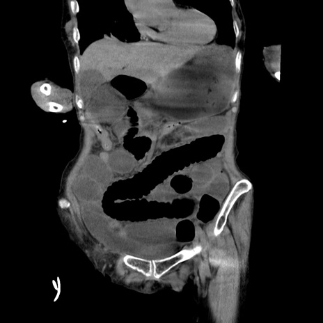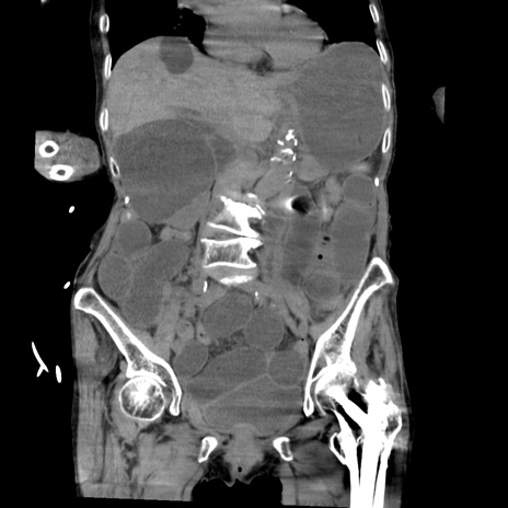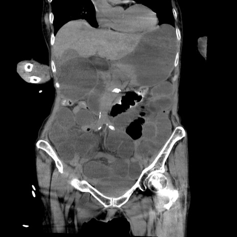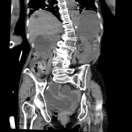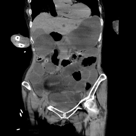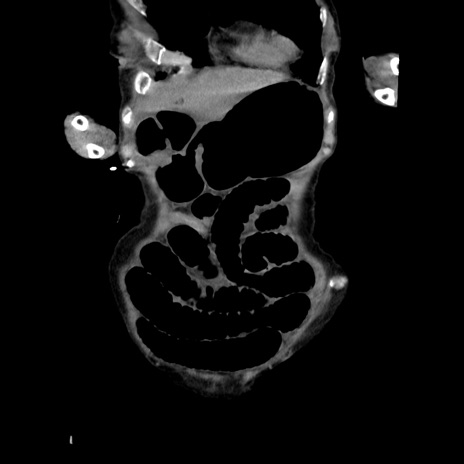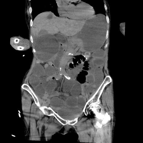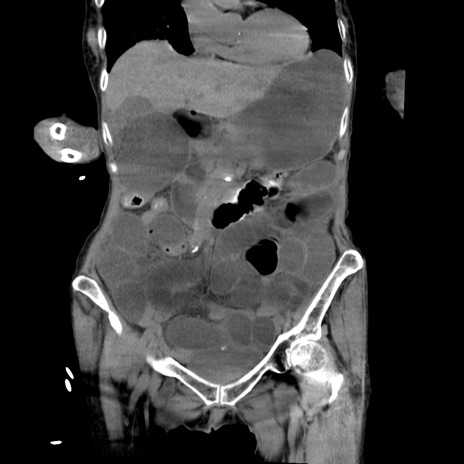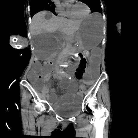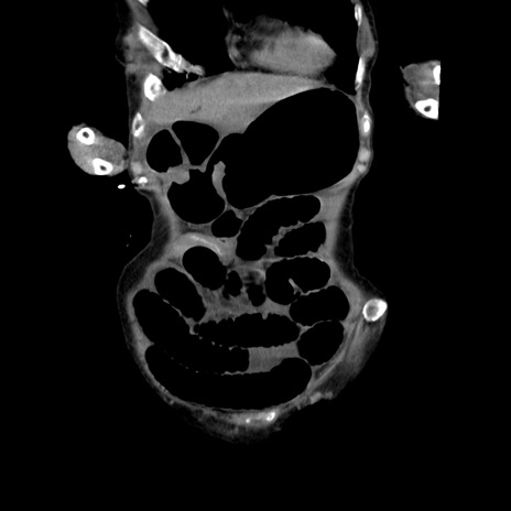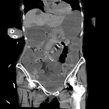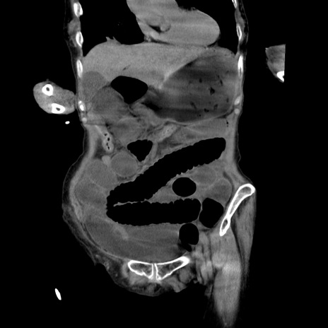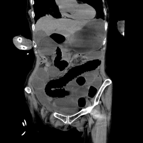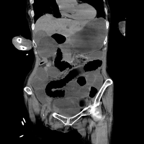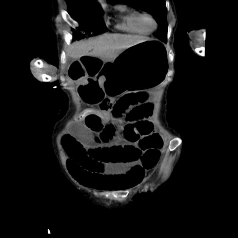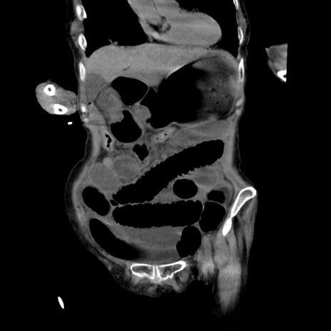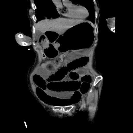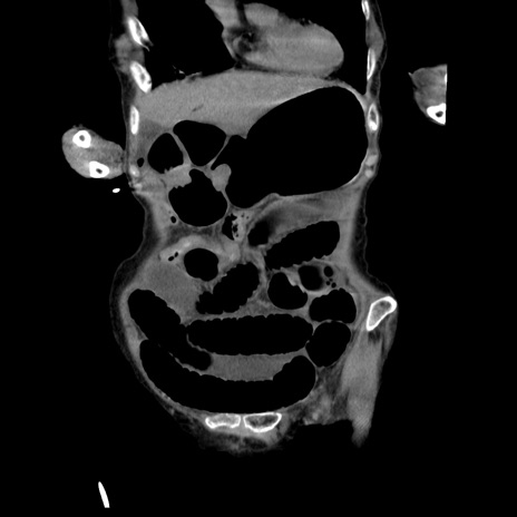 【症例】80歳代女性 【主訴】嘔吐、腹痛 【現病歴】数時間前より嘔吐あり。心窩部痛出現し、徐々に右下腹痛あり。その後も数回嘔吐あり救急搬送となる。 【既往歴】左大腿骨頚部骨折手術 【身体所見】腹部は膨隆しているが軟らかく圧痛なし。腸雑音はやや亢進。 【データ】WBC 12000、CRP 19.05