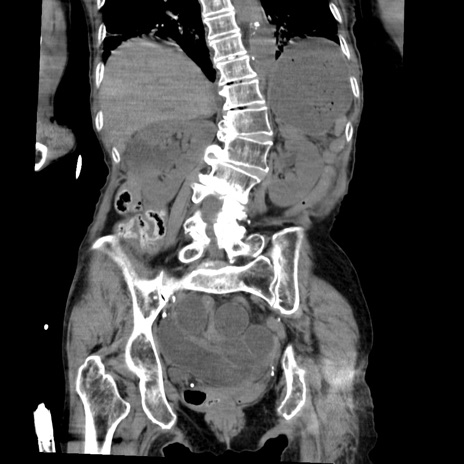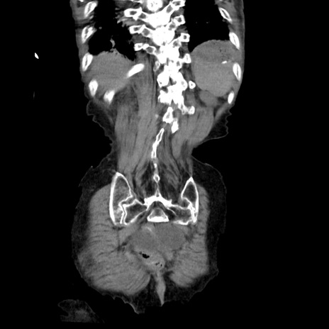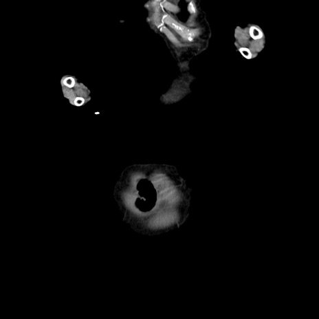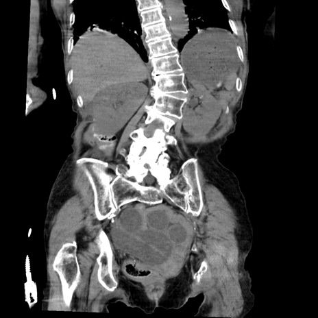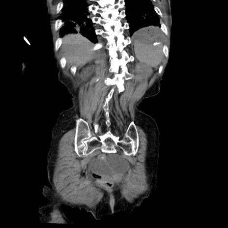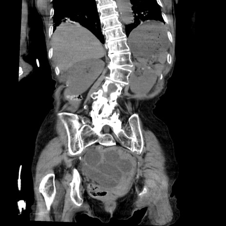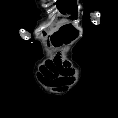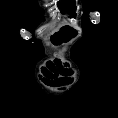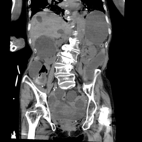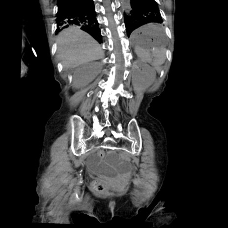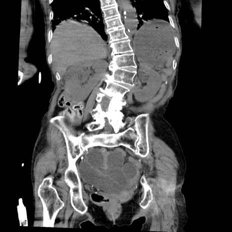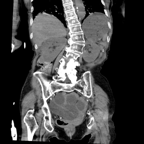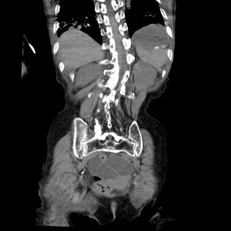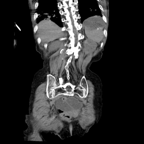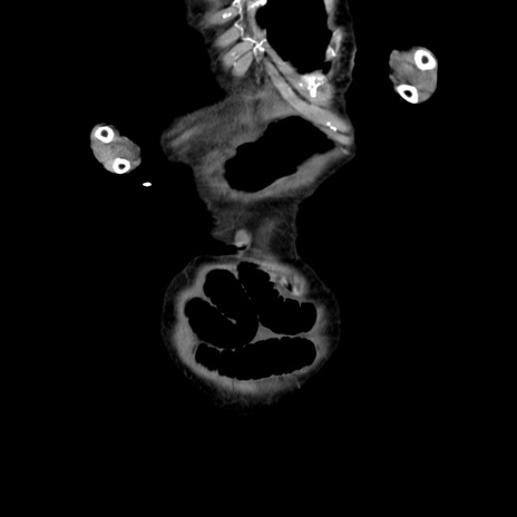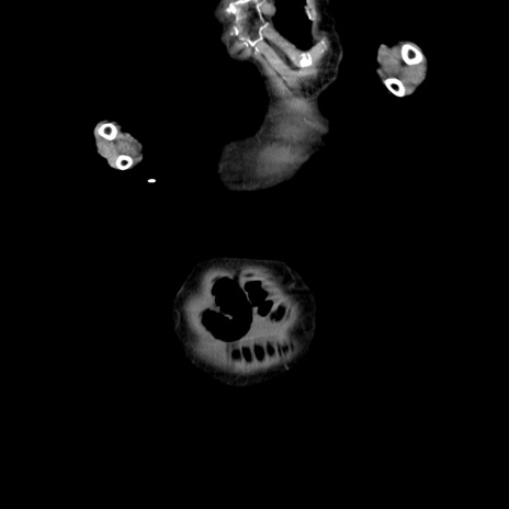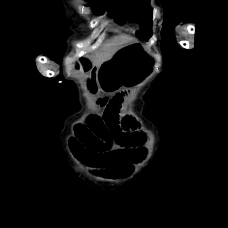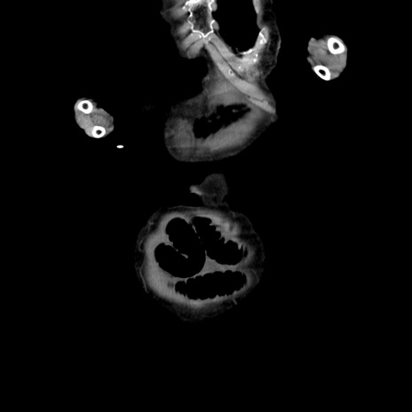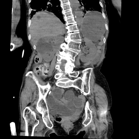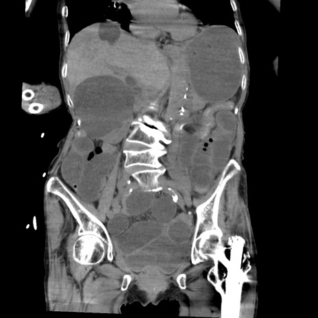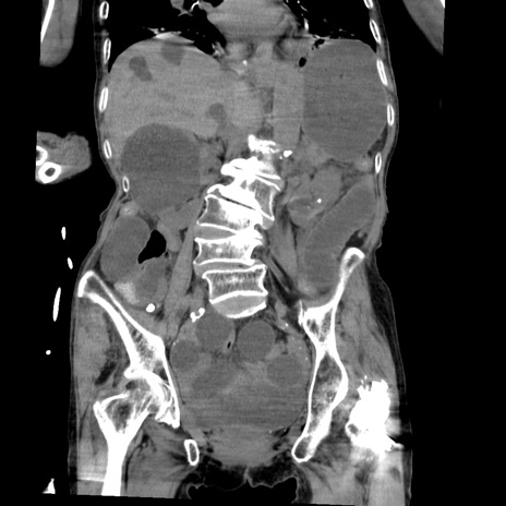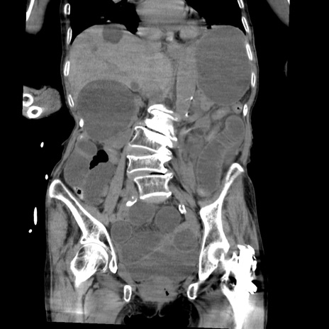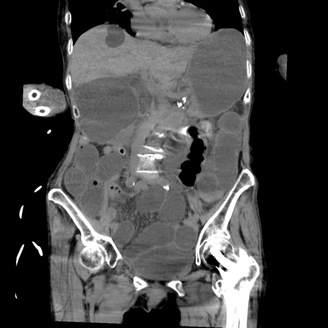 【症例】80歳代女性 【主訴】嘔吐、腹痛 【現病歴】数時間前より嘔吐あり。心窩部痛出現し、徐々に右下腹痛あり。その後も数回嘔吐あり救急搬送となる。 【既往歴】左大腿骨頚部骨折手術 【身体所見】腹部は膨隆しているが軟らかく圧痛なし。腸雑音はやや亢進。 【データ】WBC 12000、CRP 19.05
