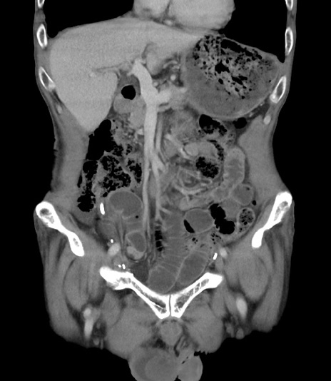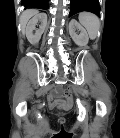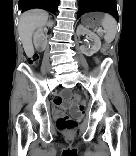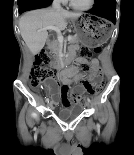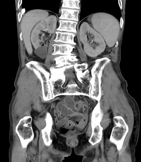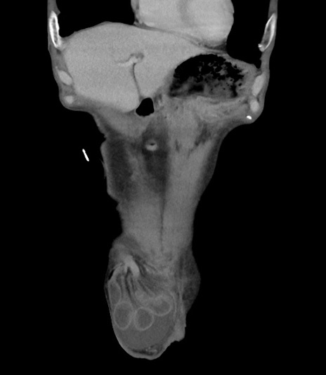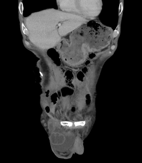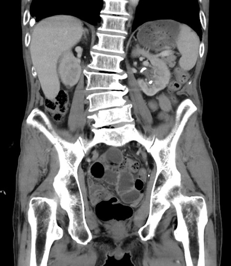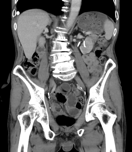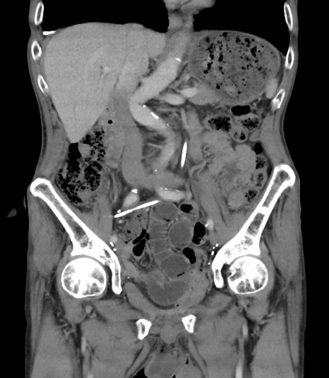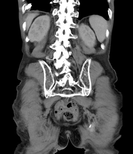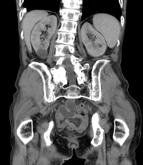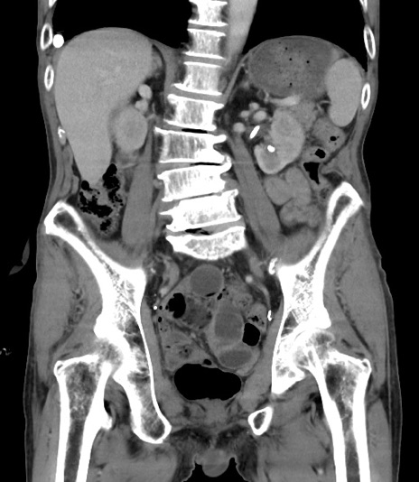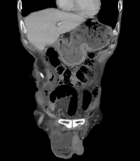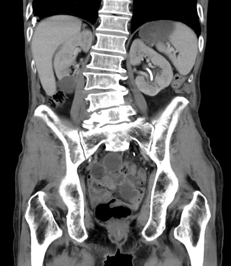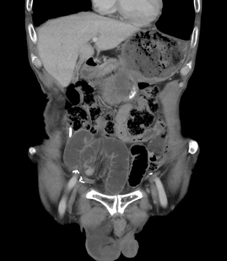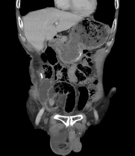 【症例】 70歳代男性 【主訴】右鼠径部腫瘤、疼痛 【現病歴】本日朝より上記主訴あり、受診。 【既往歴】膀胱癌にて膀胱全摘、両側尿管皮膚瘻 【データ】WBC 5600、CRP 0.56
