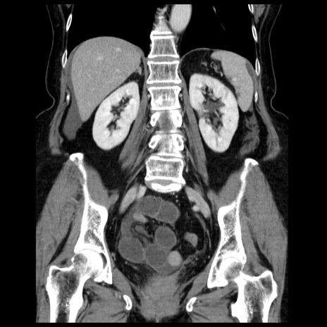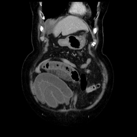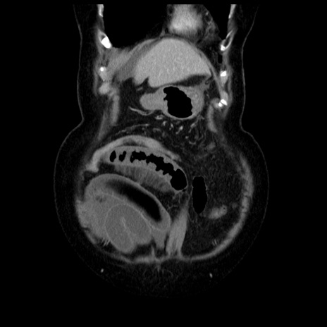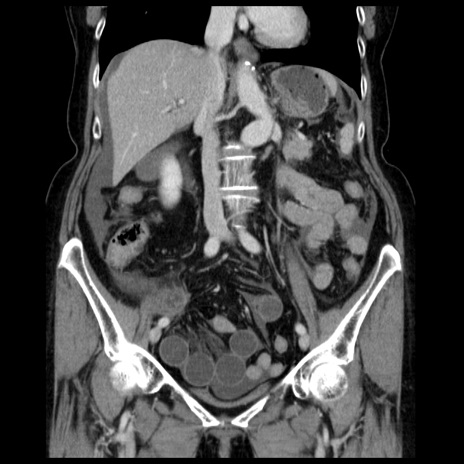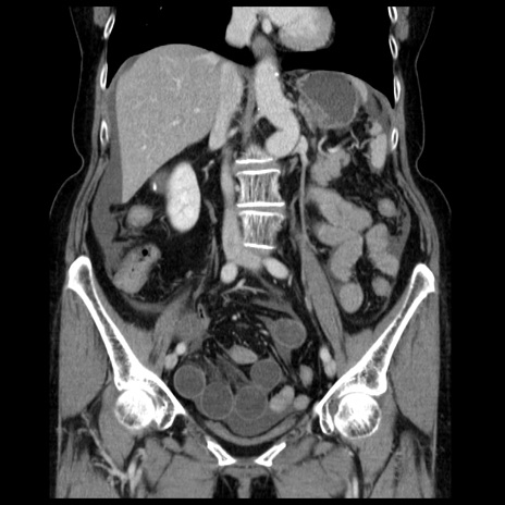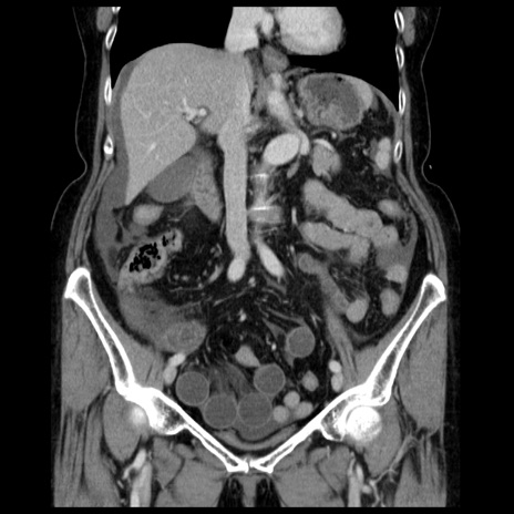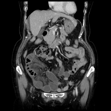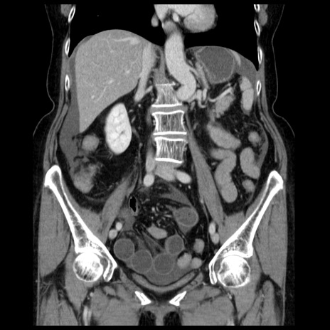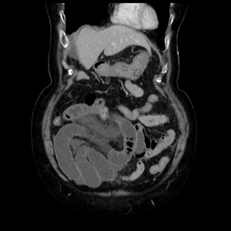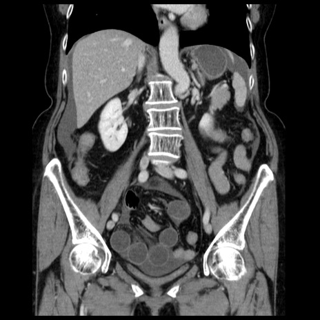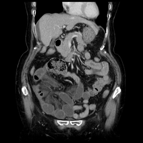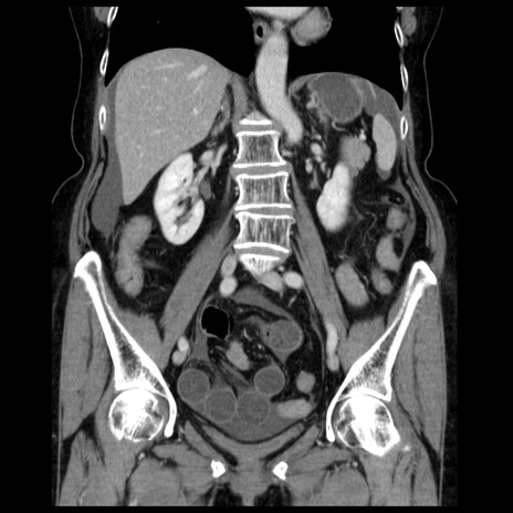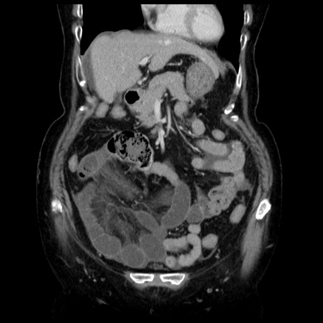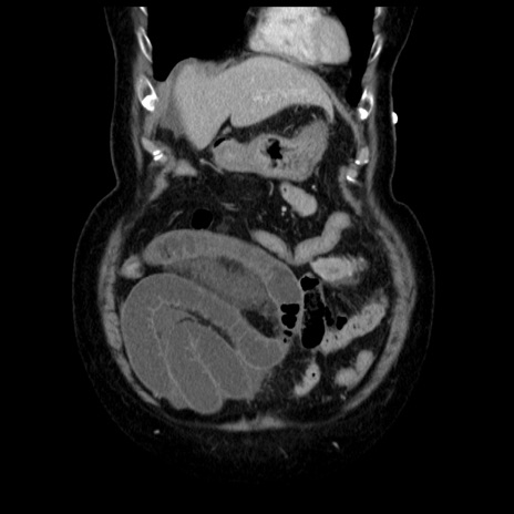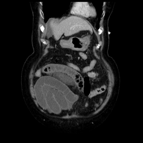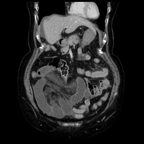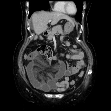 【症例】70歳代女性 【主訴】腹痛、嘔吐 【現病歴】15時間程前(昨晩)より腹痛あり。今朝になっても症状の改善なく、嘔吐あり。腹痛も増悪あり、救急外来受診。 【既往歴】子宮癌全摘術後 【身体所見】意識清明、BP 121/72mmHg、P 74bpm、SpO2 100%(RA)、腹部:平坦・軟、腸雑音ほぼ聴取せず。下腹部・心窩部・臍左上に圧痛あり。反跳痛なし。 【データ】WBC 10600、CRP 0.15