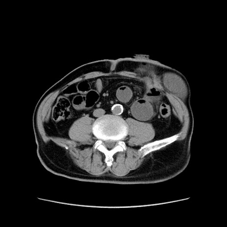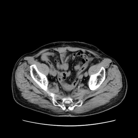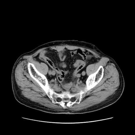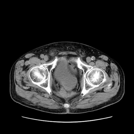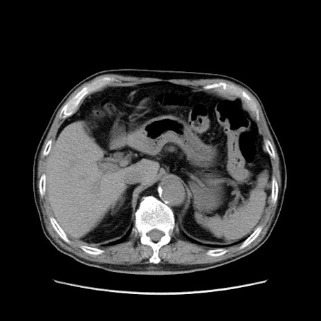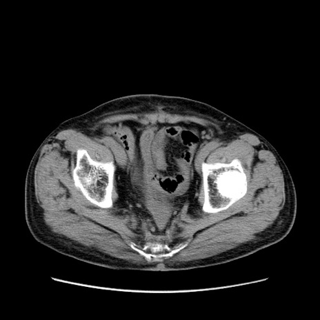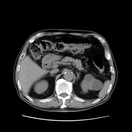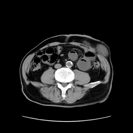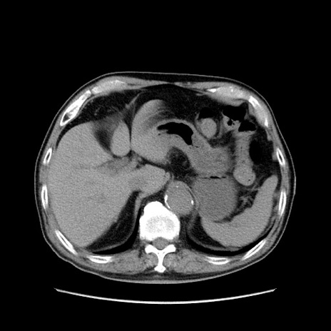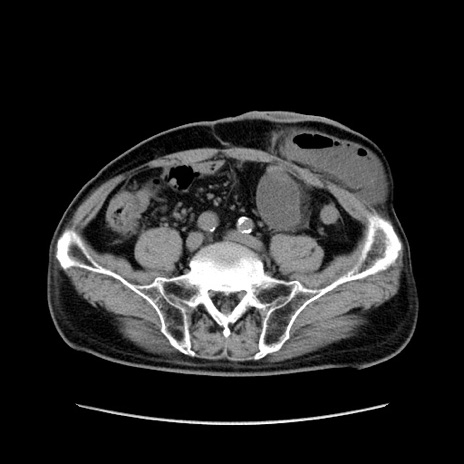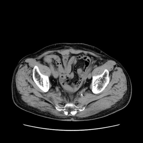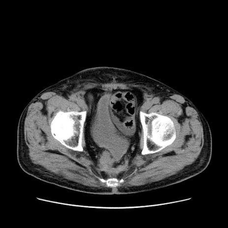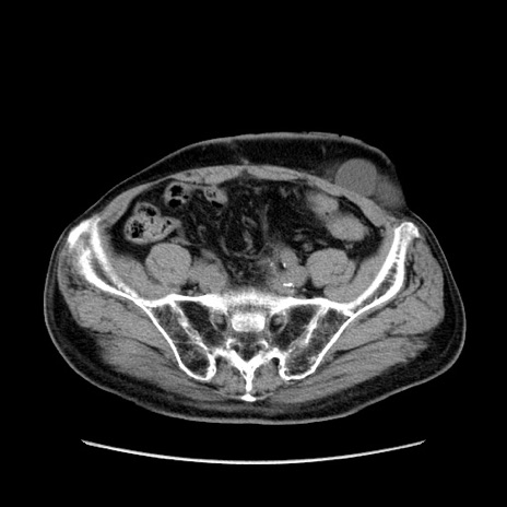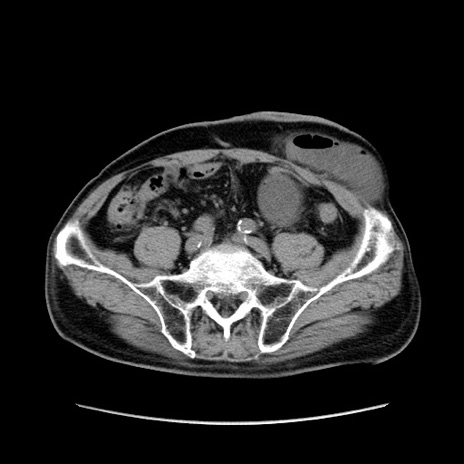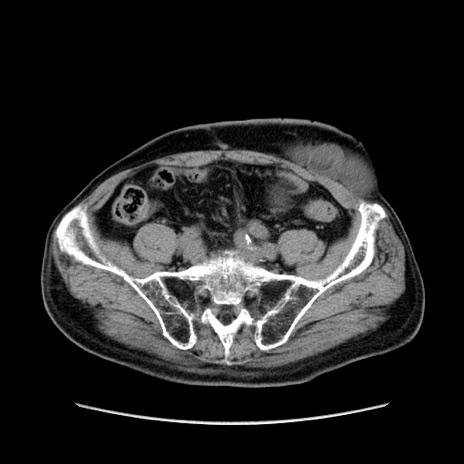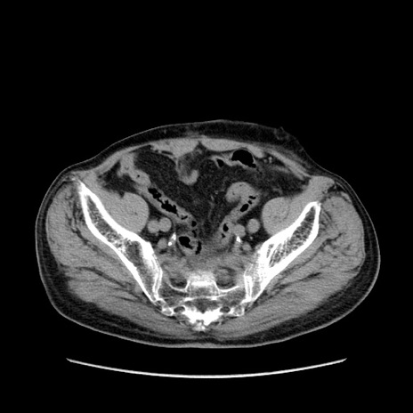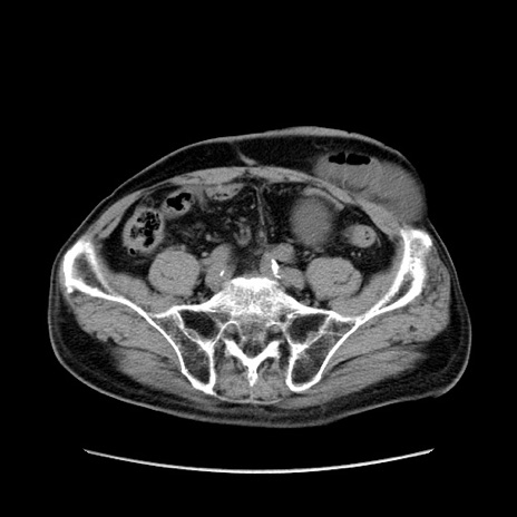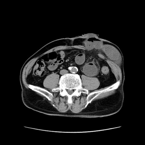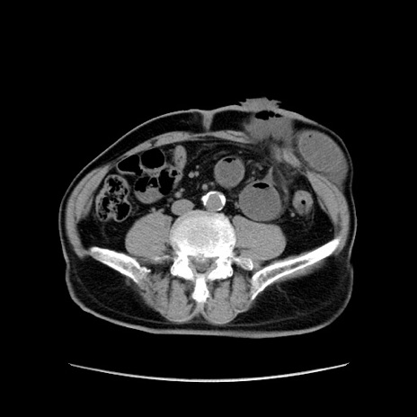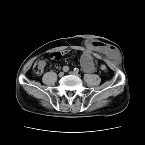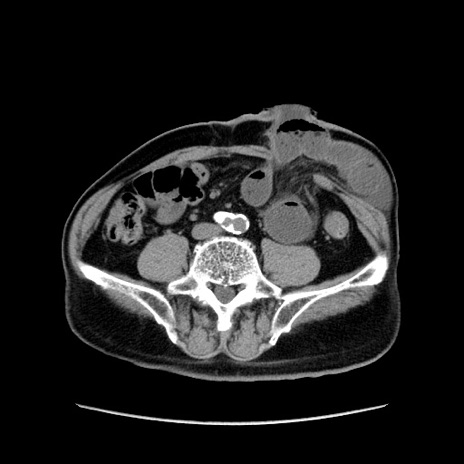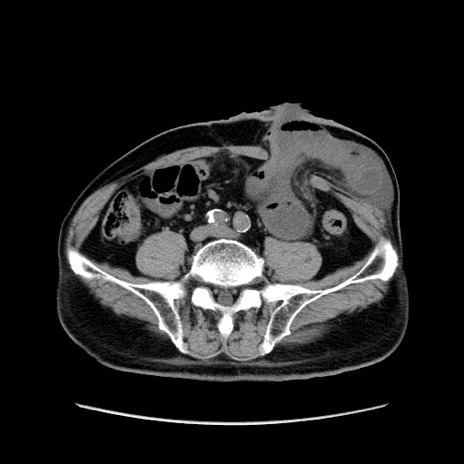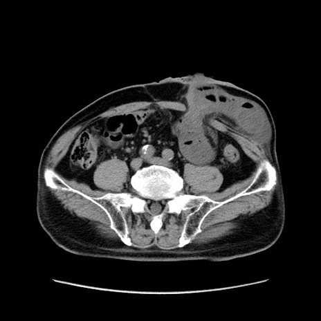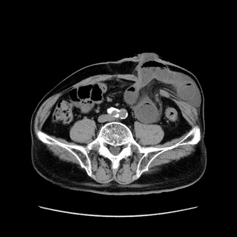 【症例】80歳代男性 【主訴】左側腹部痛、嘔吐 【現病歴】本日早朝より左腹部に痛みあり。昼頃嘔吐認めたため、救急要請。 【既往歴】直腸癌(Mile手術)、胆摘 【身体所見】意識清明、BT 35.9℃、BP 221/93mmHg、SpO2 97%(RA) 、腹部:左ストーマ周囲に限局性の腹部膨隆あり。 膨隆部自発痛・圧痛あり・軟。 【データ】WBC 7700、CRP 0.09