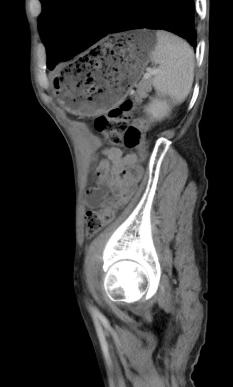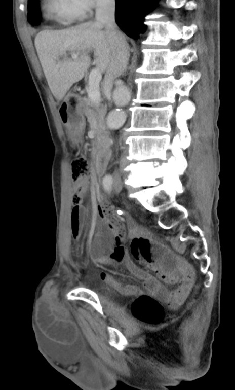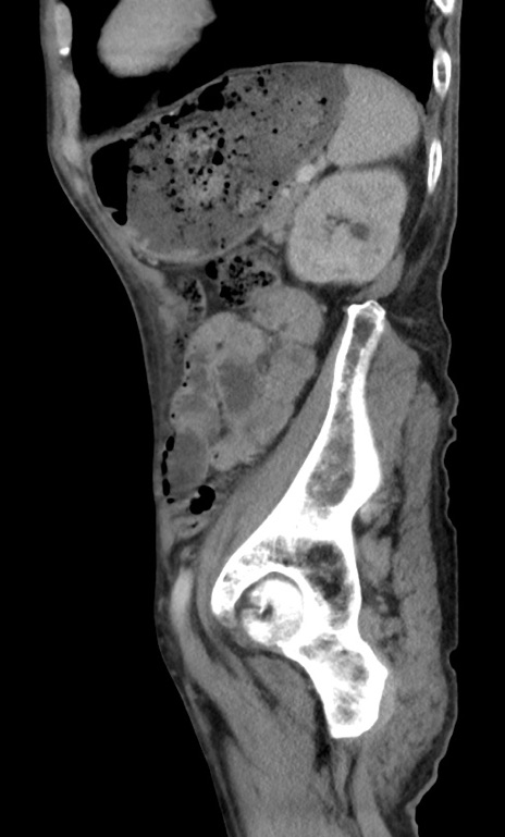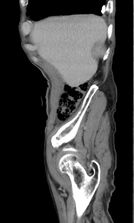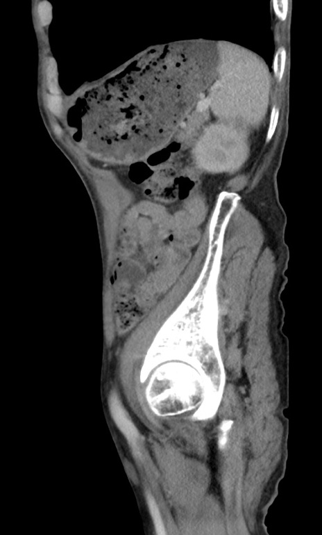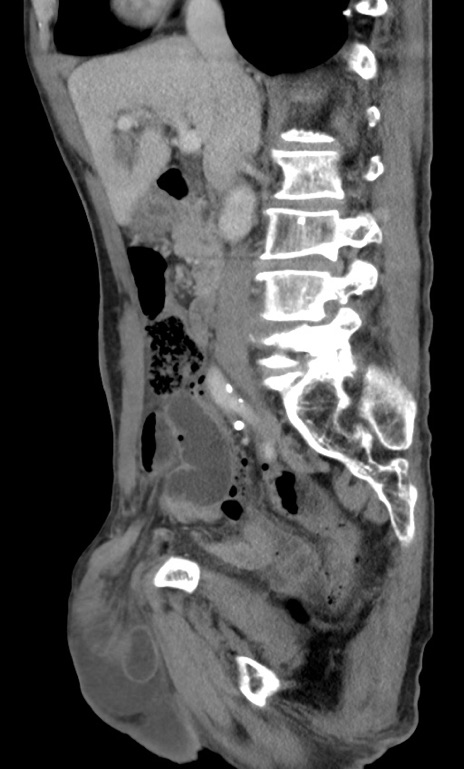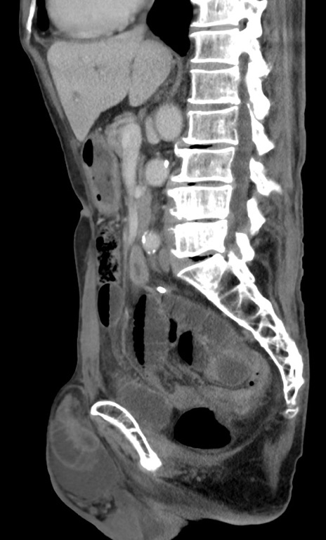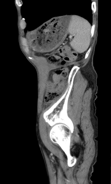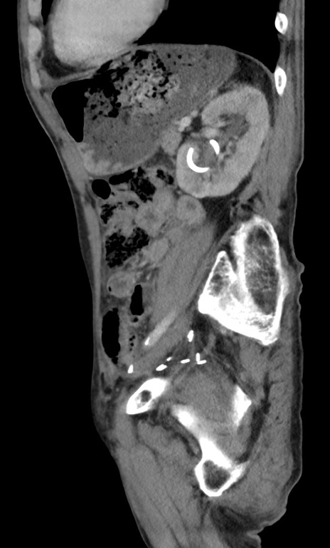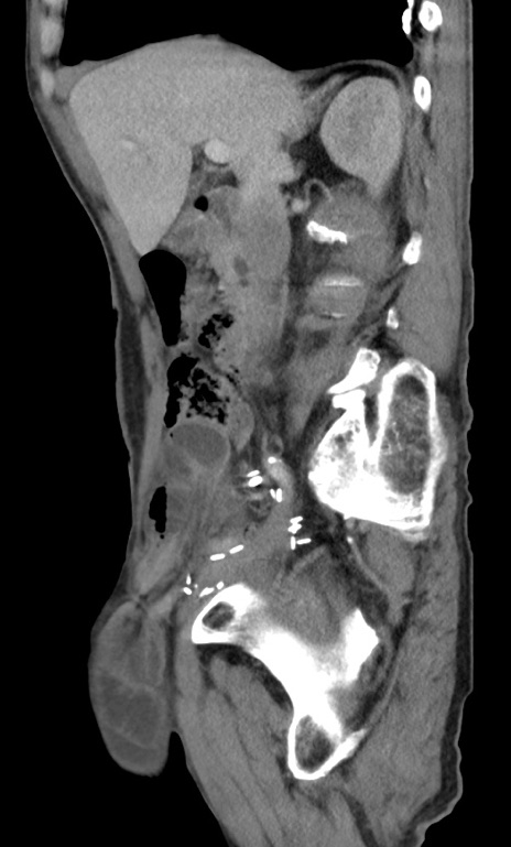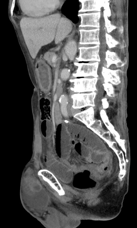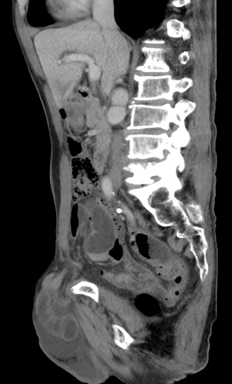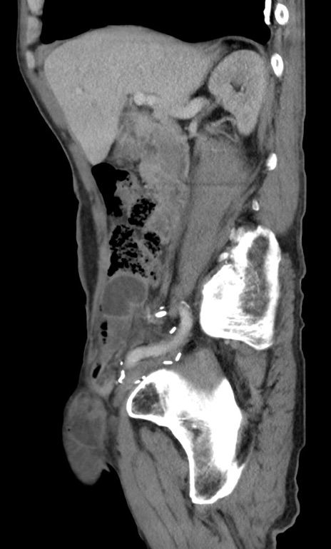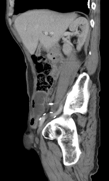 【症例】 70歳代男性 【主訴】右鼠径部腫瘤、疼痛 【現病歴】本日朝より上記主訴あり、受診。 【既往歴】膀胱癌にて膀胱全摘、両側尿管皮膚瘻 【データ】WBC 5600、CRP 0.56