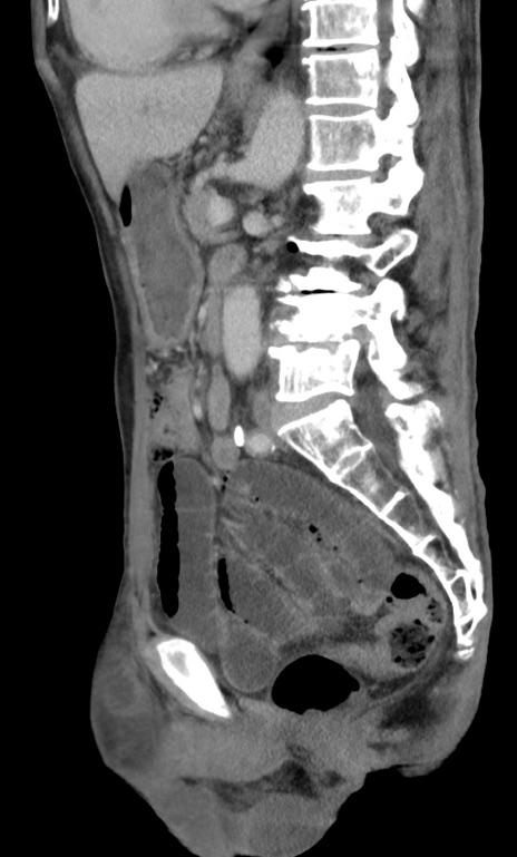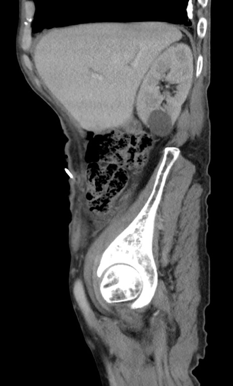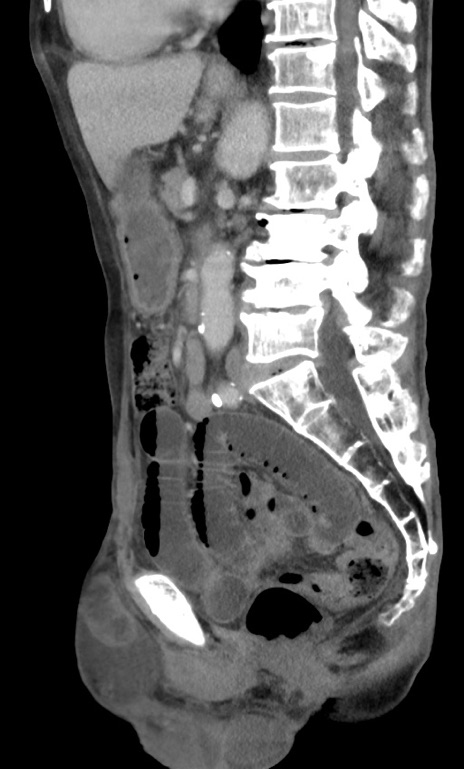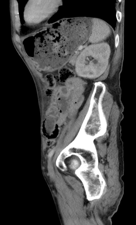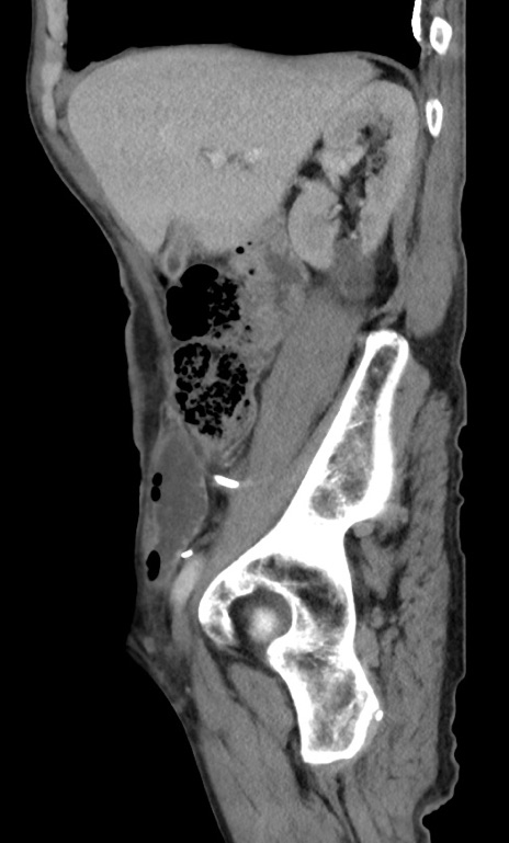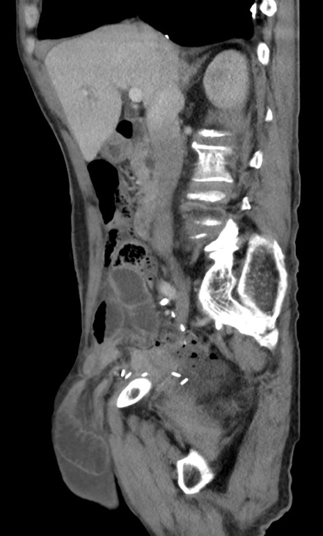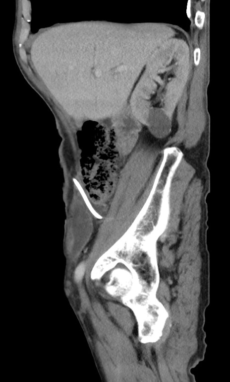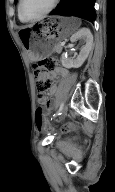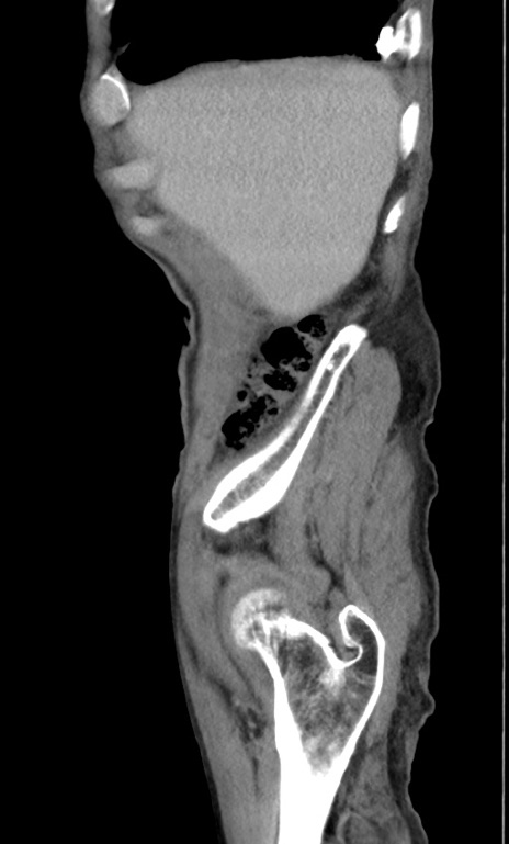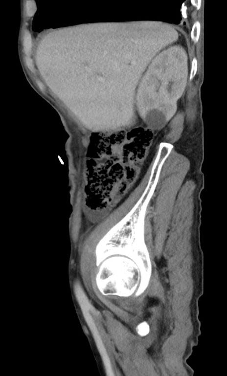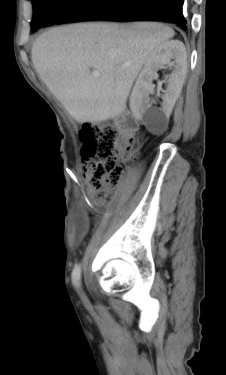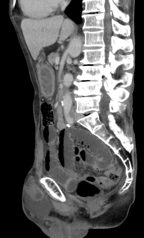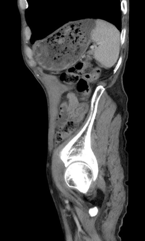 【症例】 70歳代男性 【主訴】右鼠径部腫瘤、疼痛 【現病歴】本日朝より上記主訴あり、受診。 【既往歴】膀胱癌にて膀胱全摘、両側尿管皮膚瘻 【データ】WBC 5600、CRP 0.56