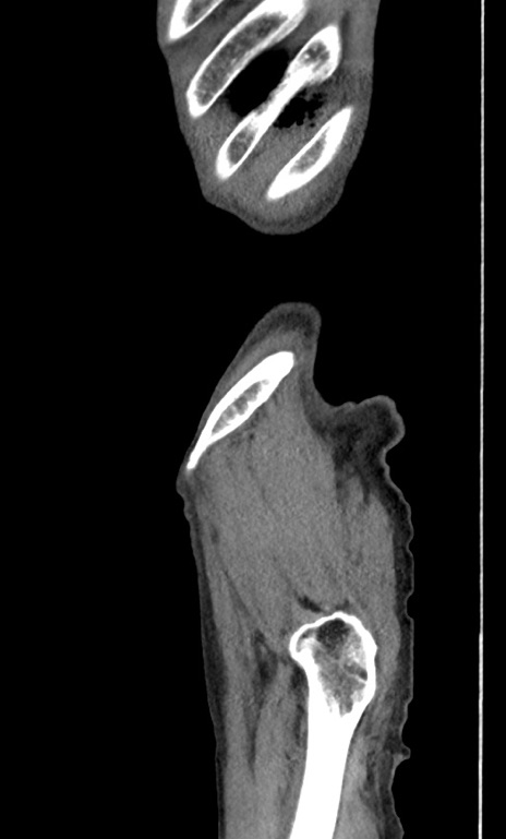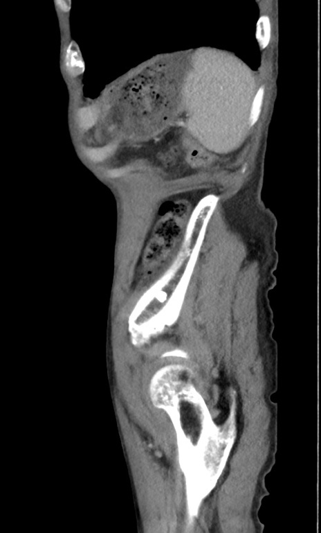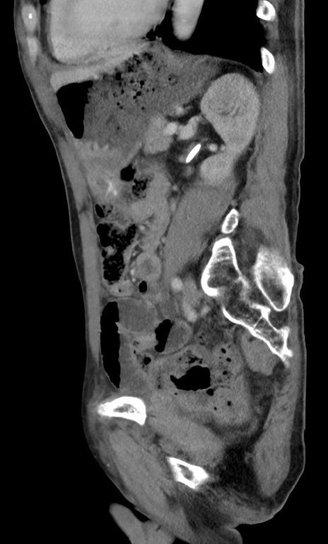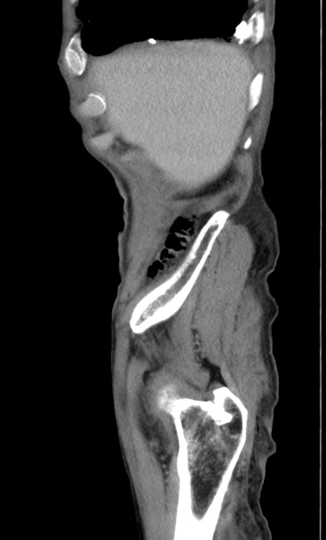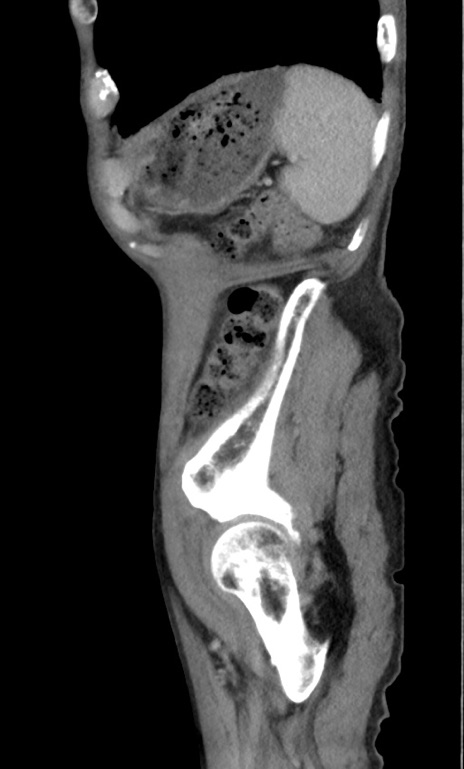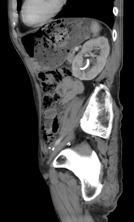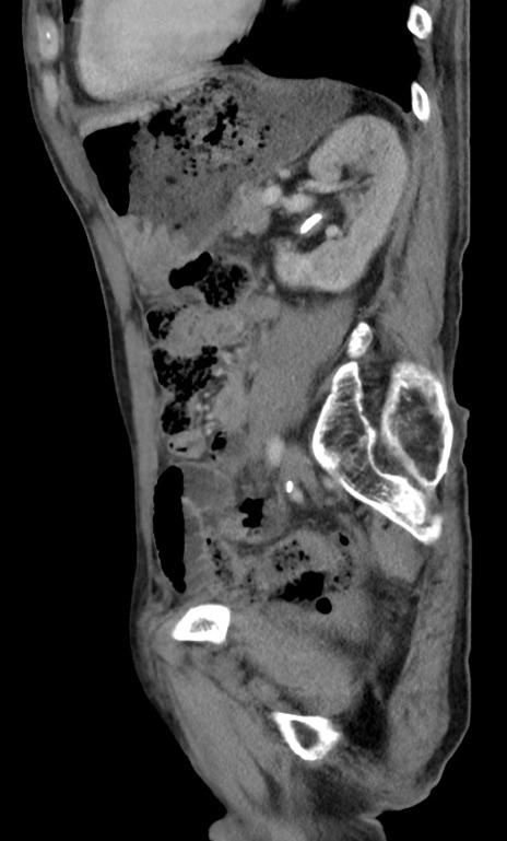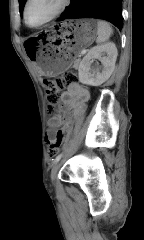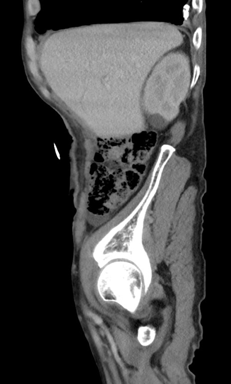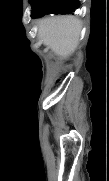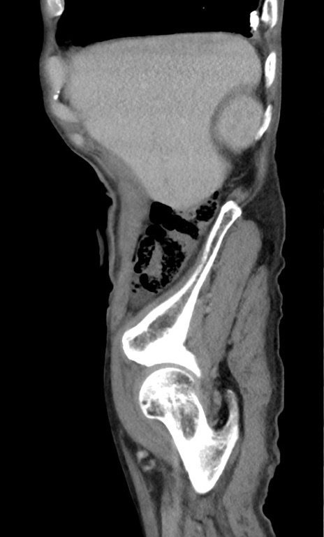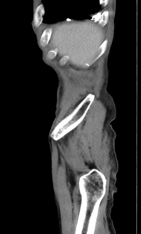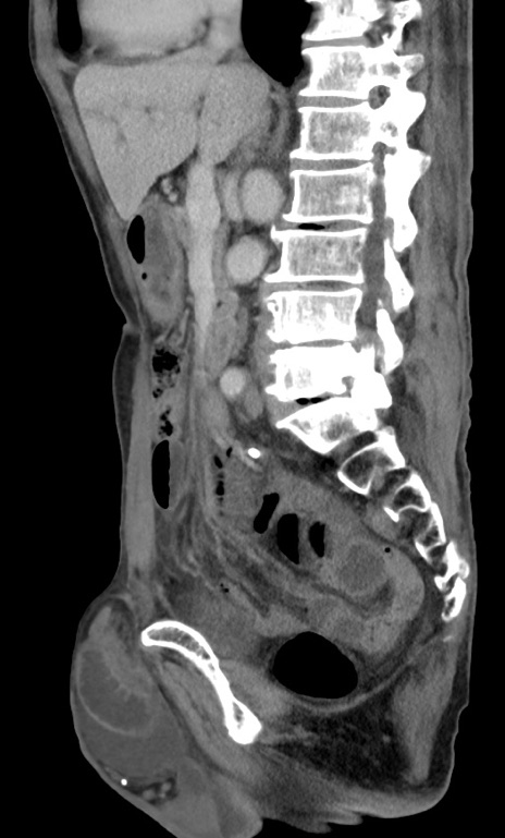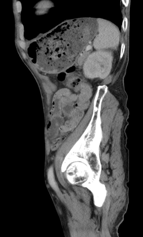 【症例】 70歳代男性 【主訴】右鼠径部腫瘤、疼痛 【現病歴】本日朝より上記主訴あり、受診。 【既往歴】膀胱癌にて膀胱全摘、両側尿管皮膚瘻 【データ】WBC 5600、CRP 0.56