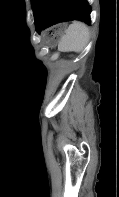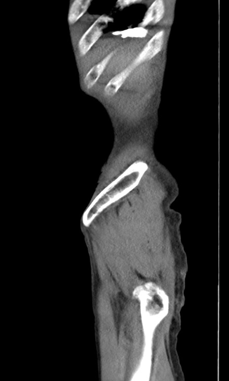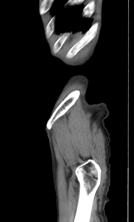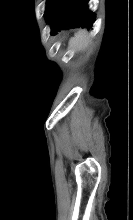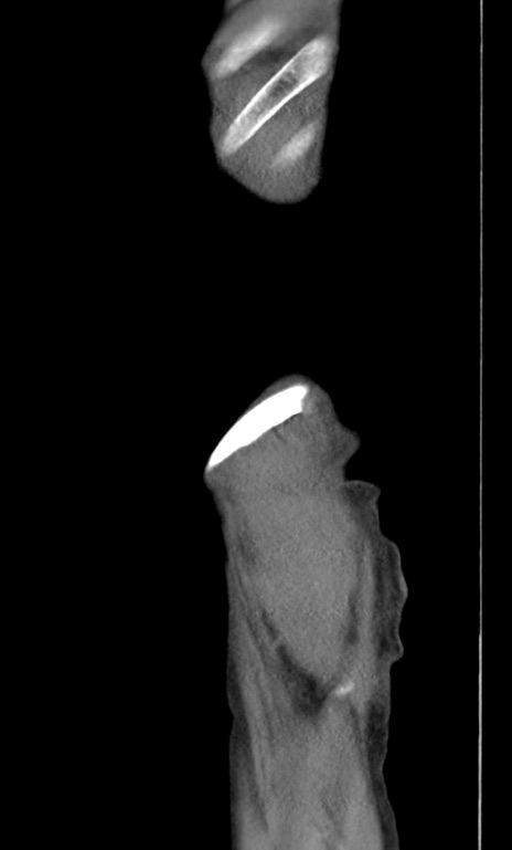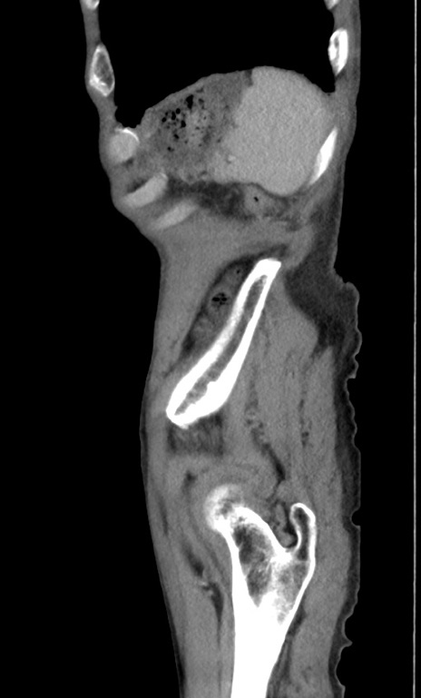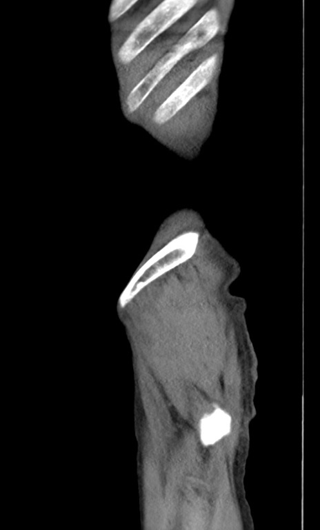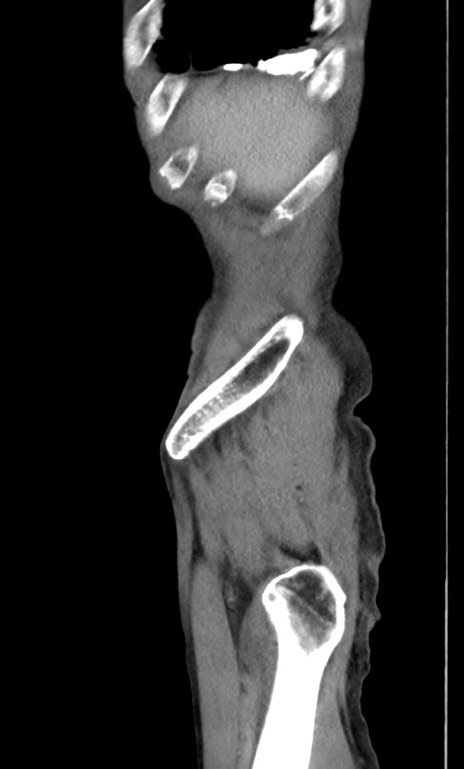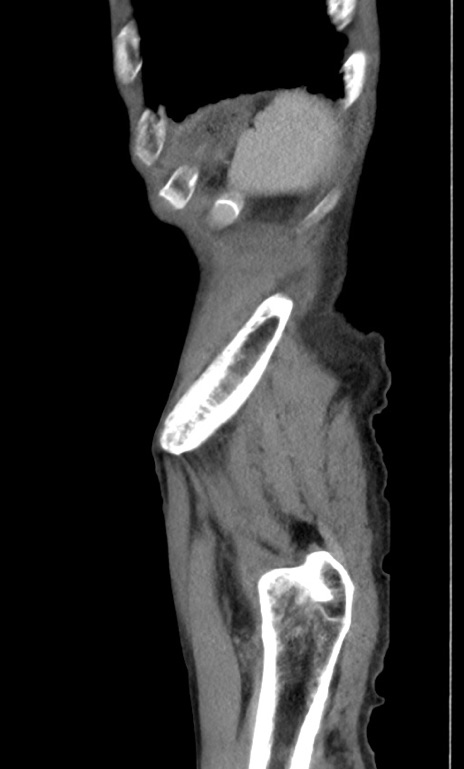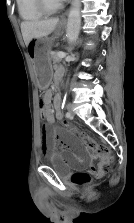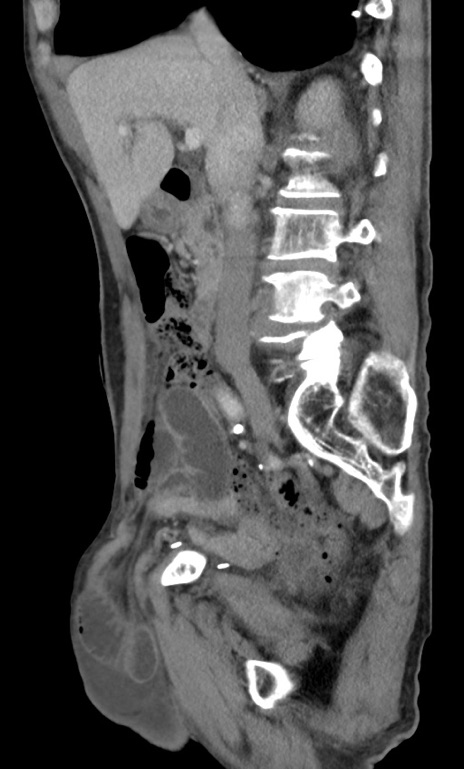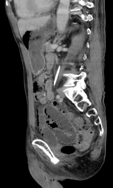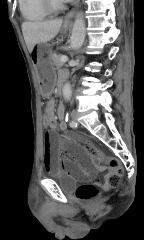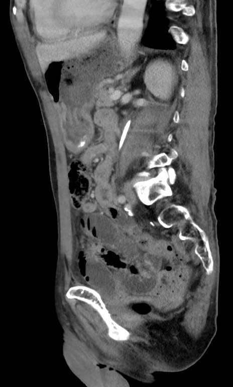 【症例】 70歳代男性 【主訴】右鼠径部腫瘤、疼痛 【現病歴】本日朝より上記主訴あり、受診。 【既往歴】膀胱癌にて膀胱全摘、両側尿管皮膚瘻 【データ】WBC 5600、CRP 0.56
