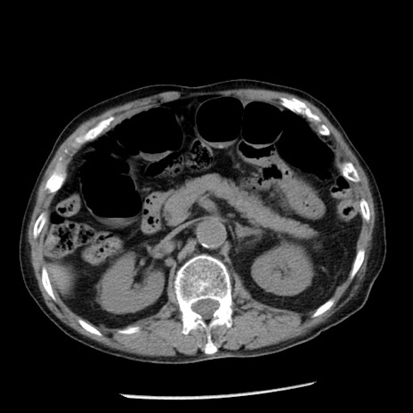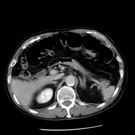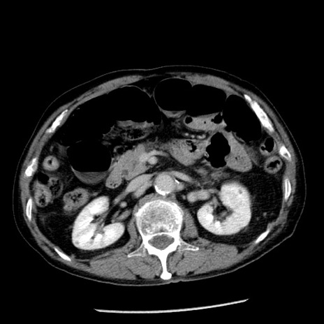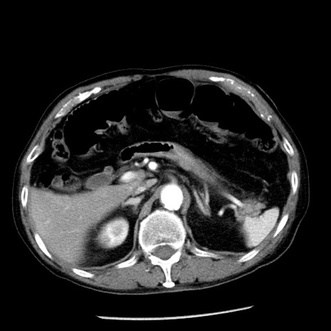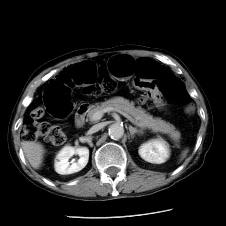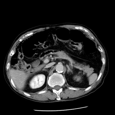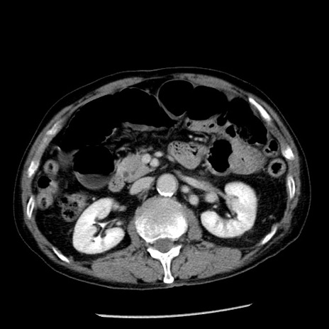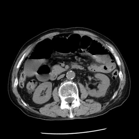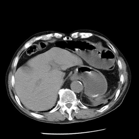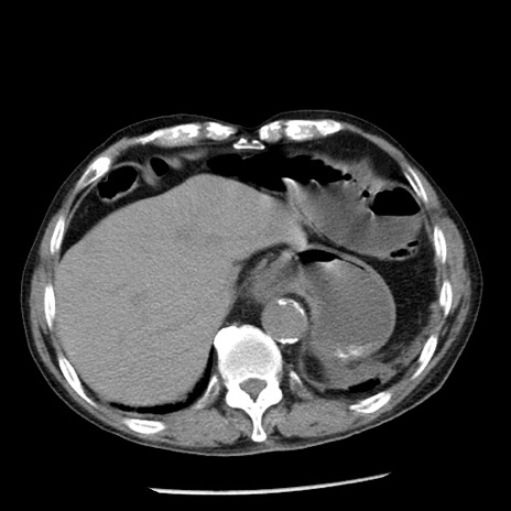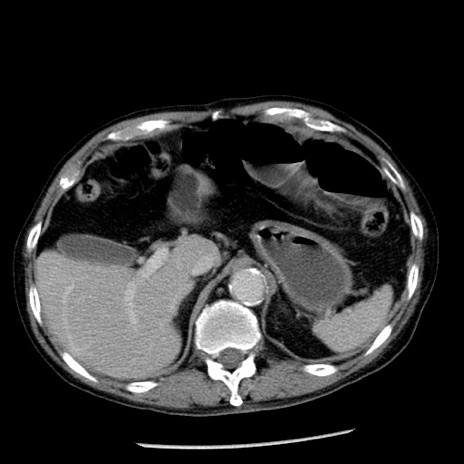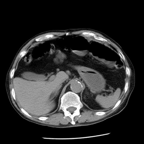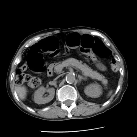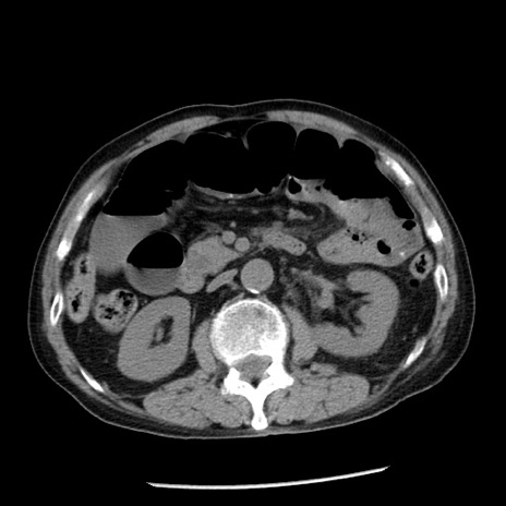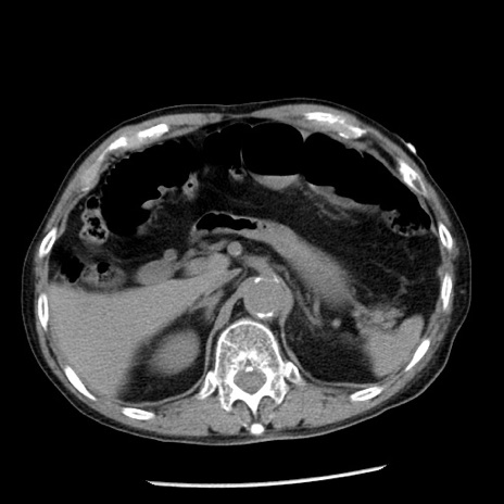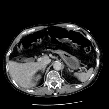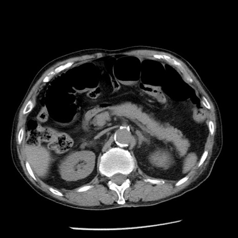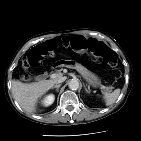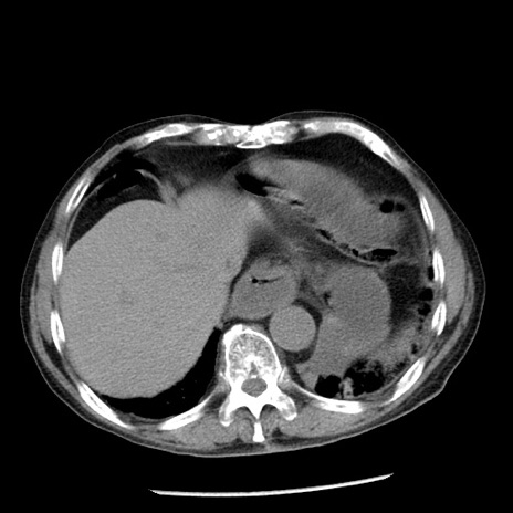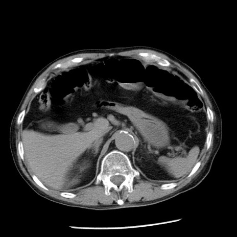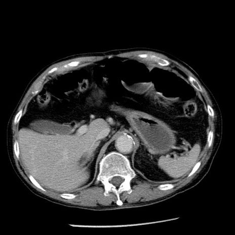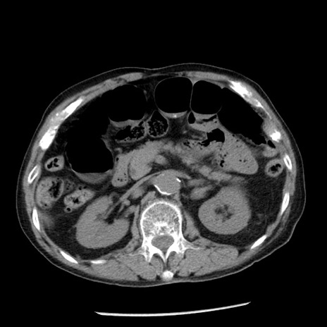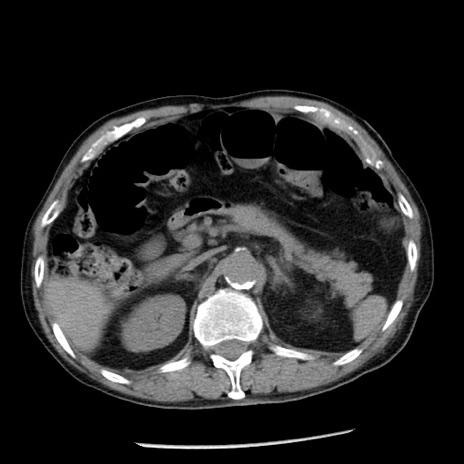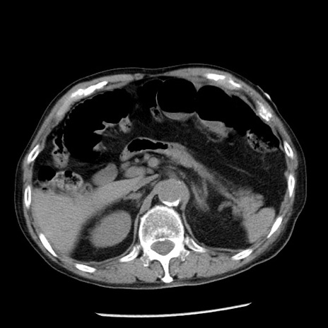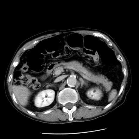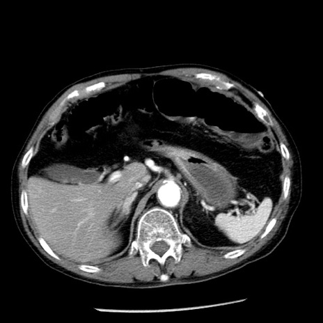 【症例】80歳代男性 【主訴】嘔吐 【現病歴】昨晩2回嘔吐あり、今朝になっても嘔吐あり。来院。 【既往歴】胃潰瘍 【身体所見】意識清明、BT 37.6℃、BP 166/95mmHg、HR 100bpm、SpO2 97%、腹部:平坦・軟、腸蠕動音聴取良好、圧痛なし。 【データ】WBC 21900、CRP 1.46