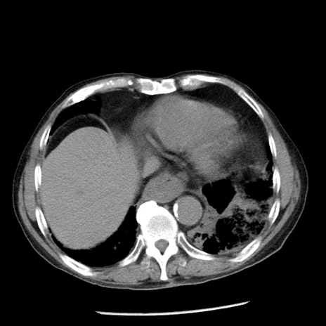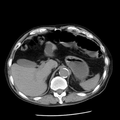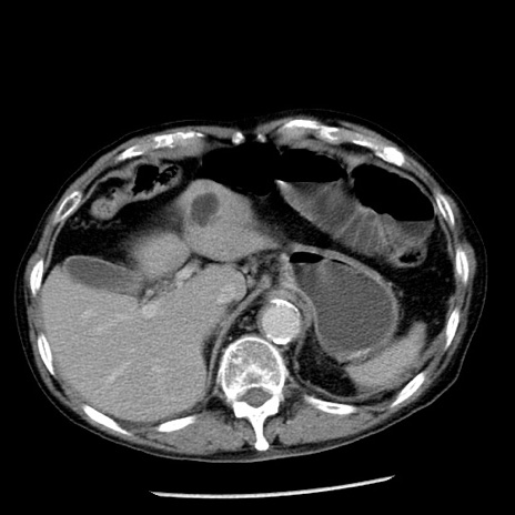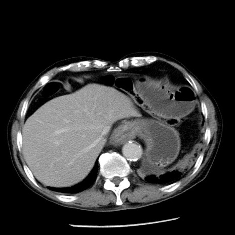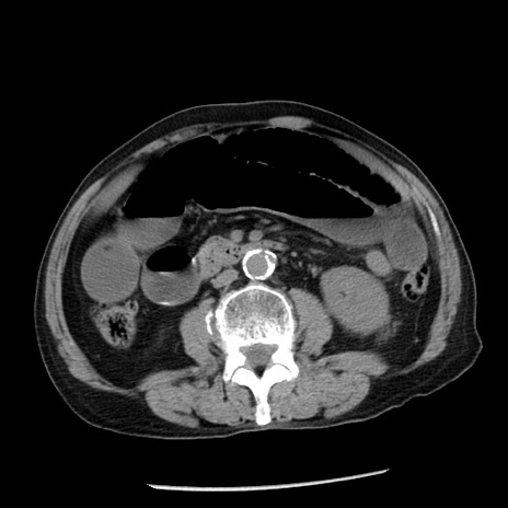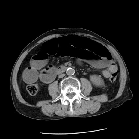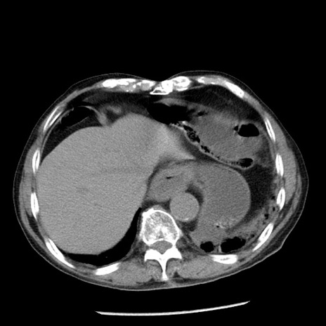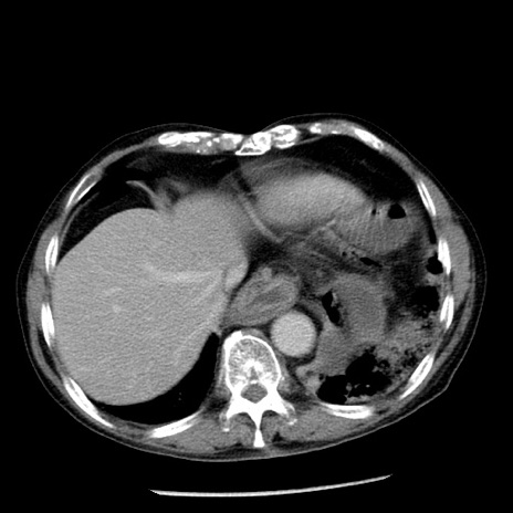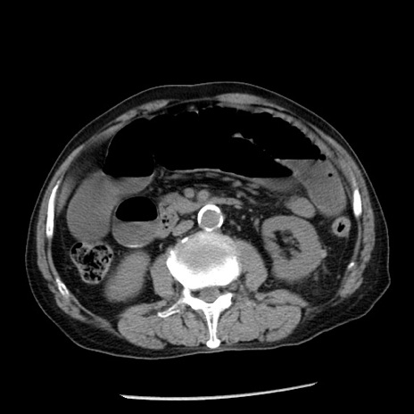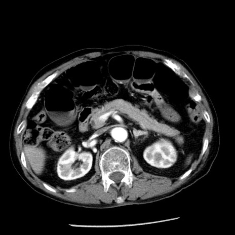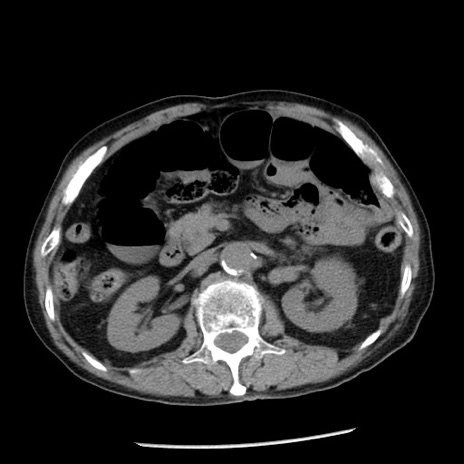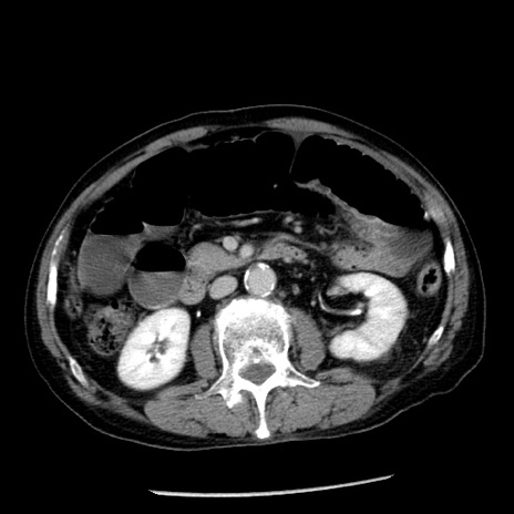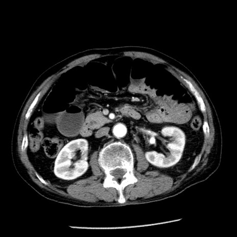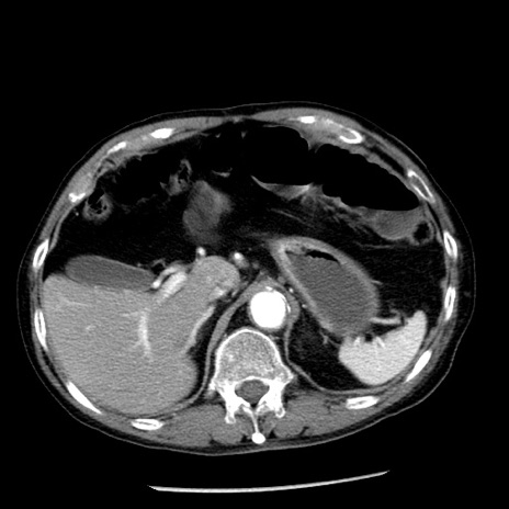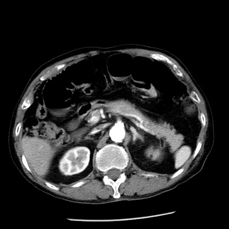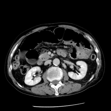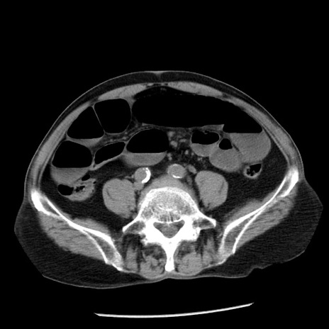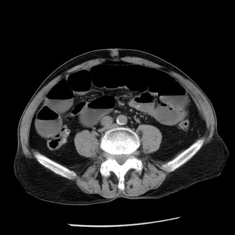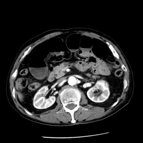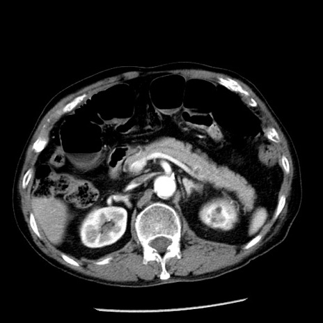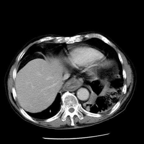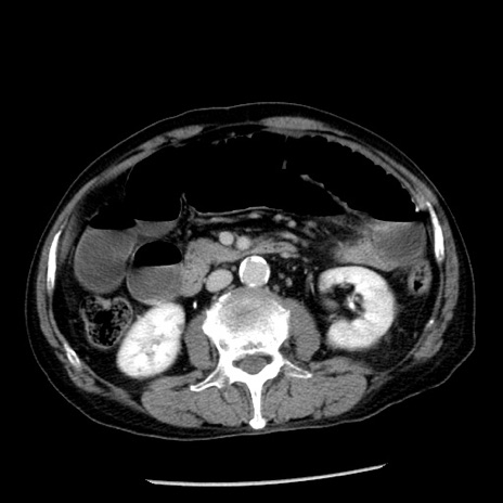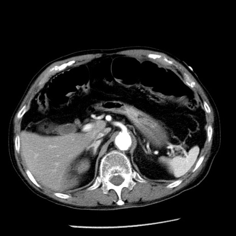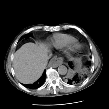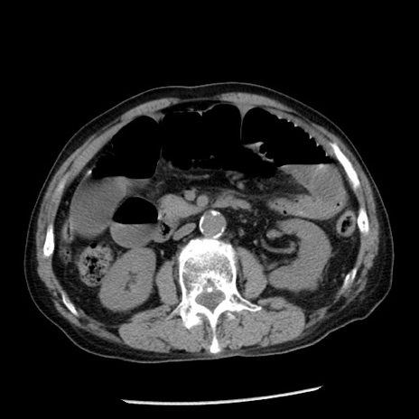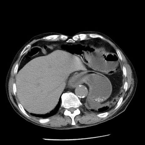 【症例】80歳代男性 【主訴】嘔吐 【現病歴】昨晩2回嘔吐あり、今朝になっても嘔吐あり。来院。 【既往歴】胃潰瘍 【身体所見】意識清明、BT 37.6℃、BP 166/95mmHg、HR 100bpm、SpO2 97%、腹部:平坦・軟、腸蠕動音聴取良好、圧痛なし。 【データ】WBC 21900、CRP 1.46