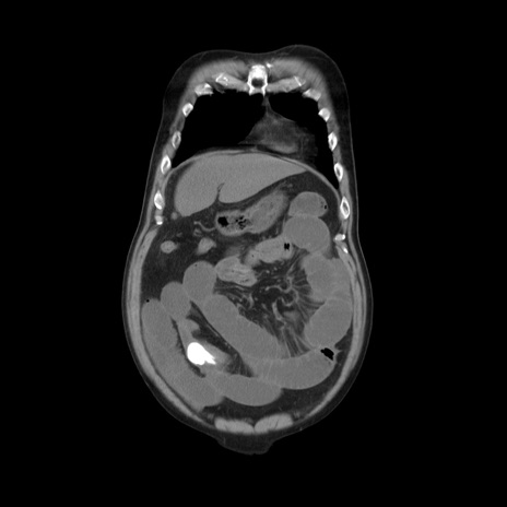 【現病歴】5日前頃より倦怠感を認め食事量減少し4日前の朝嘔吐、食事摂取困難となった。 3日前近医受診し点滴施行され整腸剤などを処方された。 当日他院を受診し、腹部膨満著明、炎症反応の上昇(CRP10.8、WBC11200)あり、紹介受診となる。