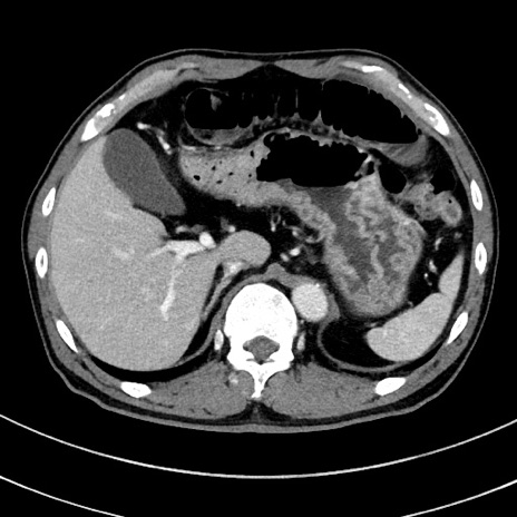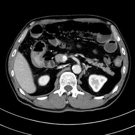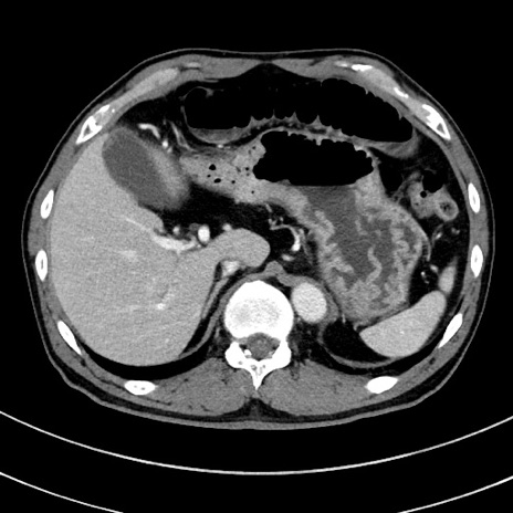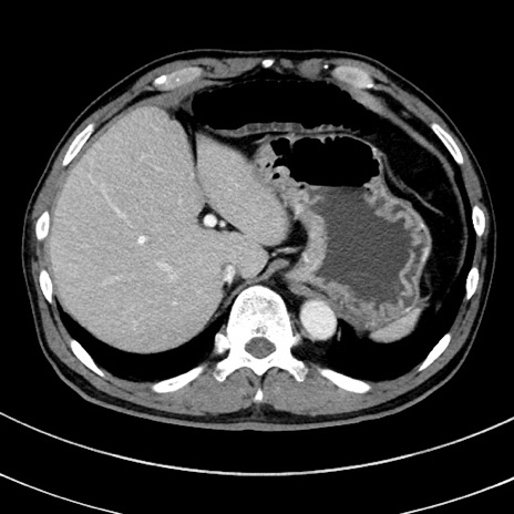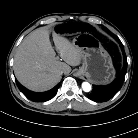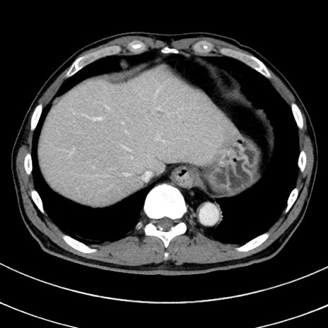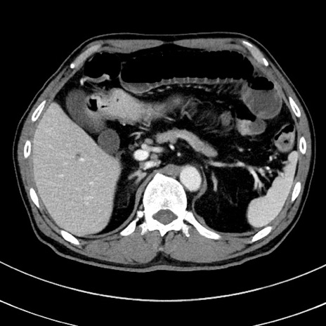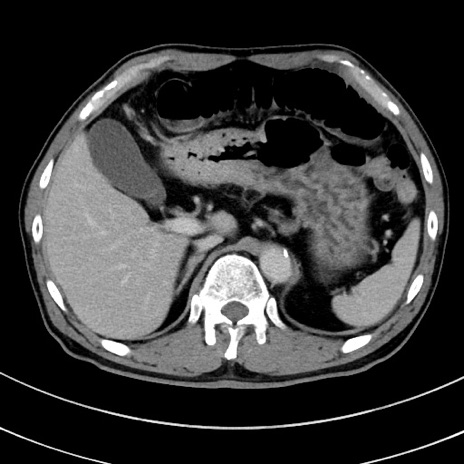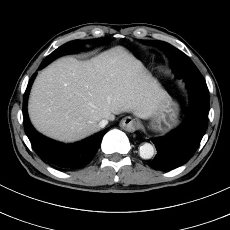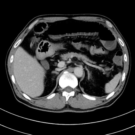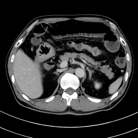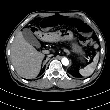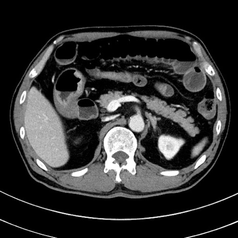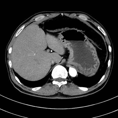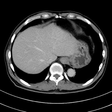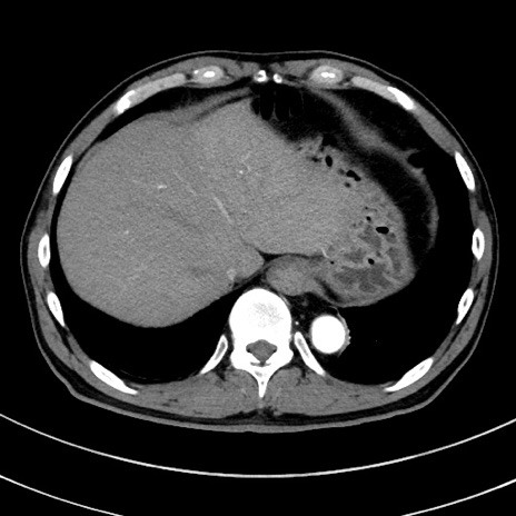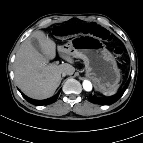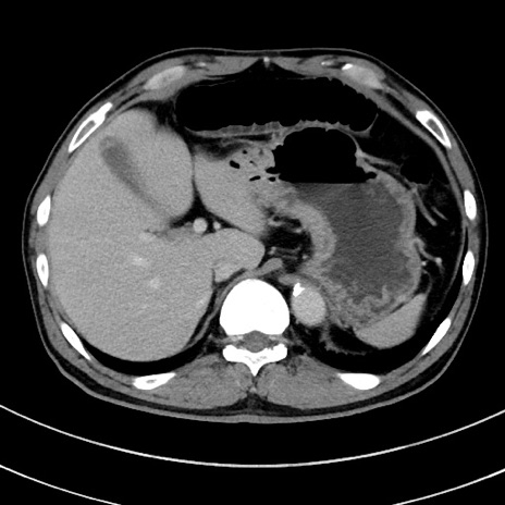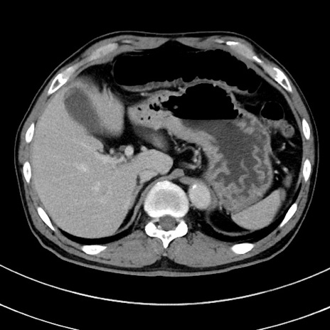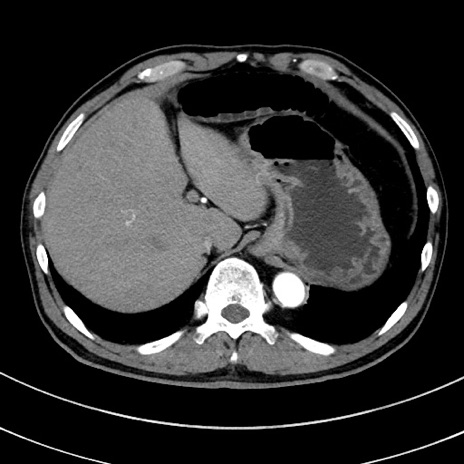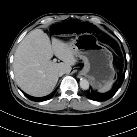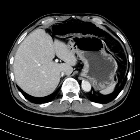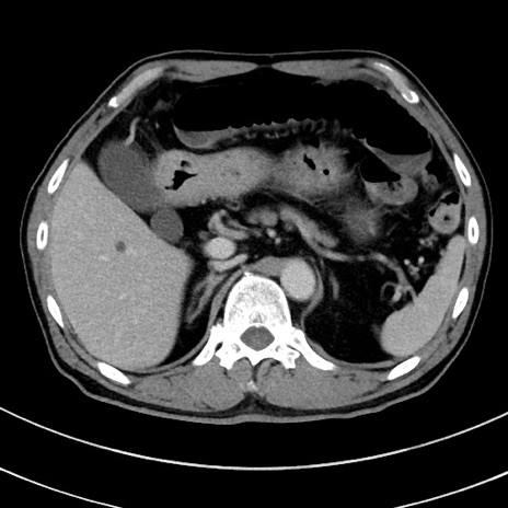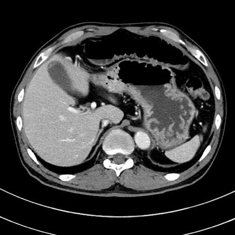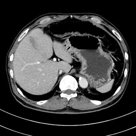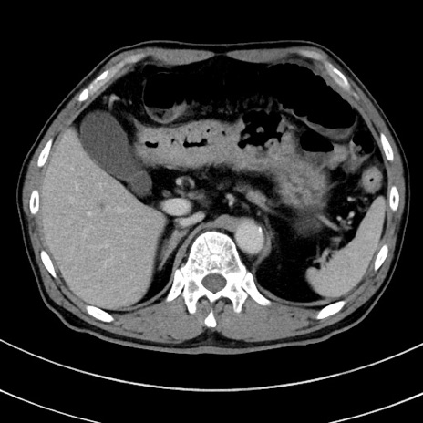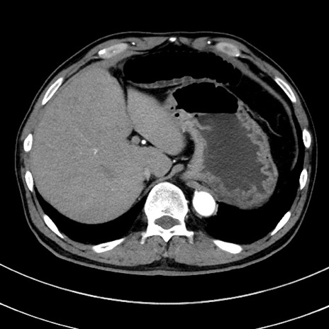 【症例】 60歳代男性 【主訴】 黒色吐物 【現病歴】 4日前から嘔気自覚、2日前の朝食後にも嘔気あり、自分で手で嘔吐反射起こし嘔吐したところ血が混ざっていたため受診。 【既往歴】 5年前汎発性腹膜炎を伴う急性虫垂炎で手術、高血圧、前立腺肥大症、高脂血症 【身体所見】 腹部正中に手術癩痕あり 腹部平坦・軟圧痛なし膨満感あり 【データ】WBC 8400、CRP 4.54
