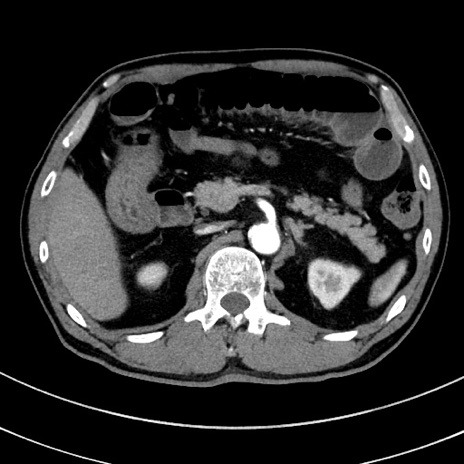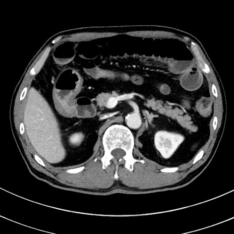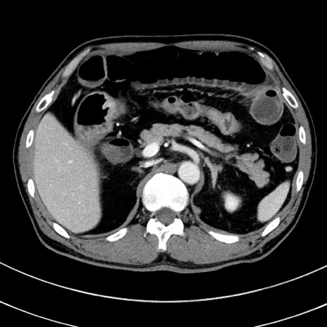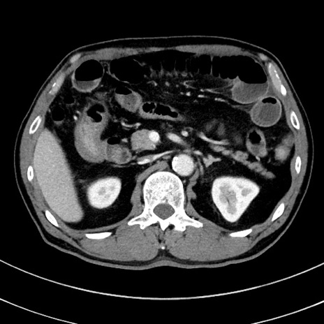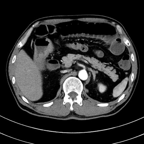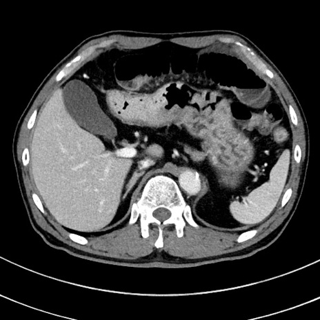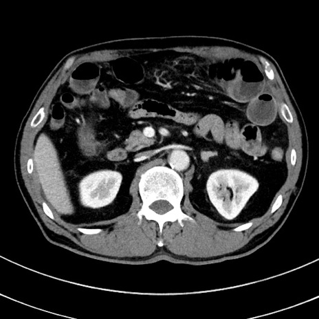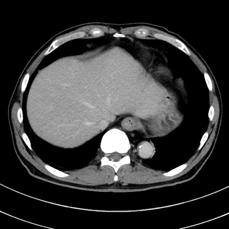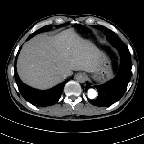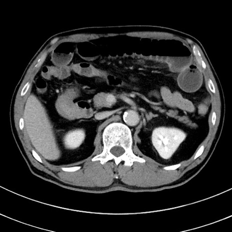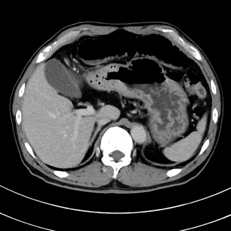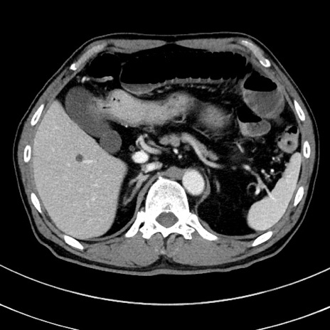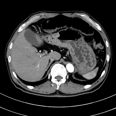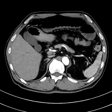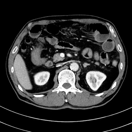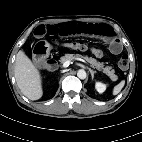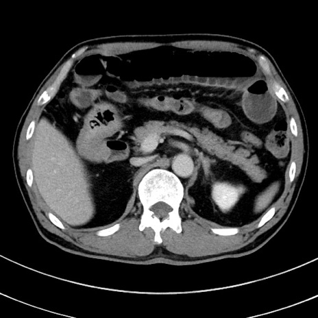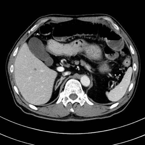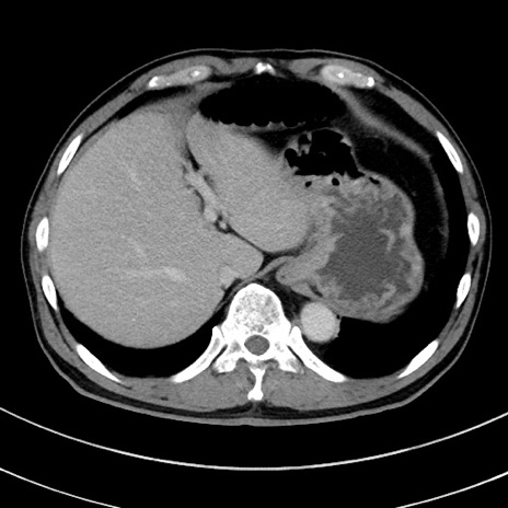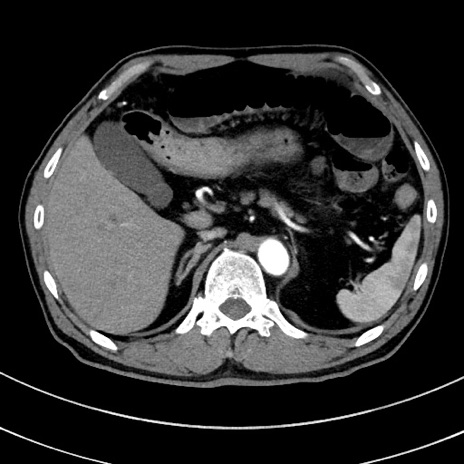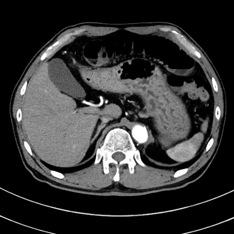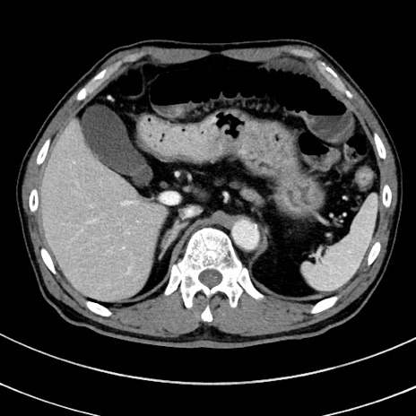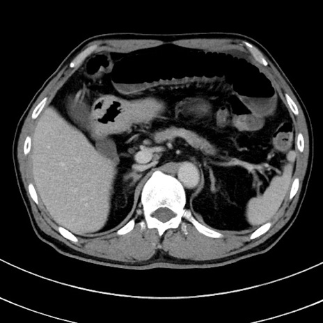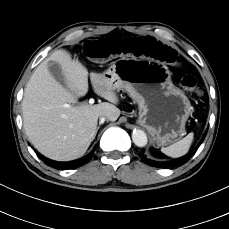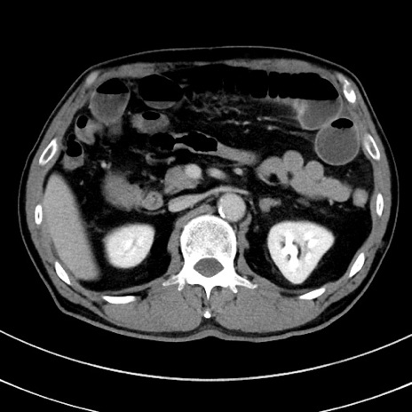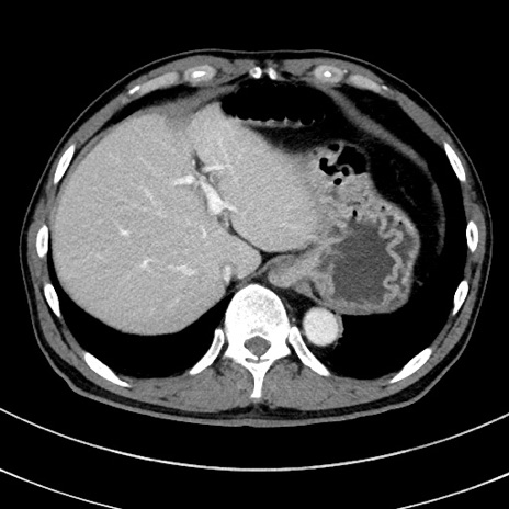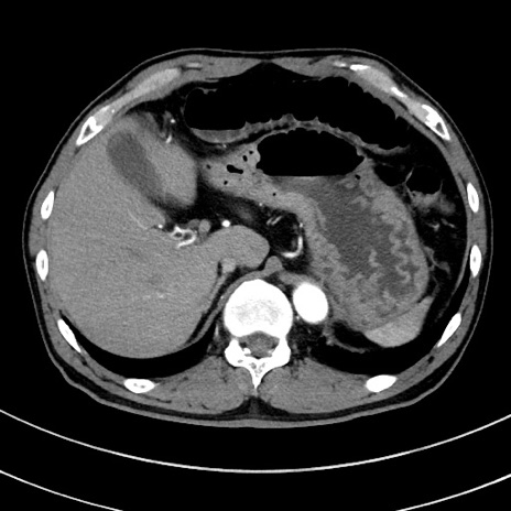 【症例】 60歳代男性 【主訴】 黒色吐物 【現病歴】 4日前から嘔気自覚、2日前の朝食後にも嘔気あり、自分で手で嘔吐反射起こし嘔吐したところ血が混ざっていたため受診。 【既往歴】 5年前汎発性腹膜炎を伴う急性虫垂炎で手術、高血圧、前立腺肥大症、高脂血症 【身体所見】 腹部正中に手術癩痕あり 腹部平坦・軟圧痛なし膨満感あり 【データ】WBC 8400、CRP 4.54