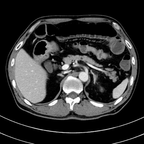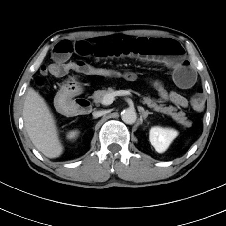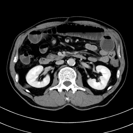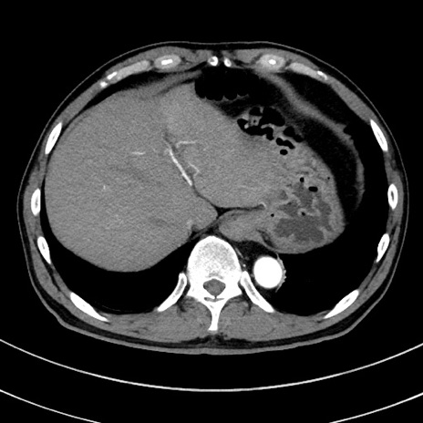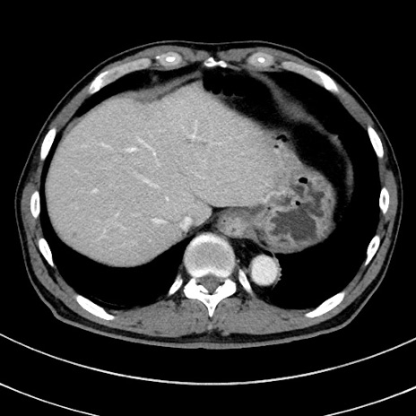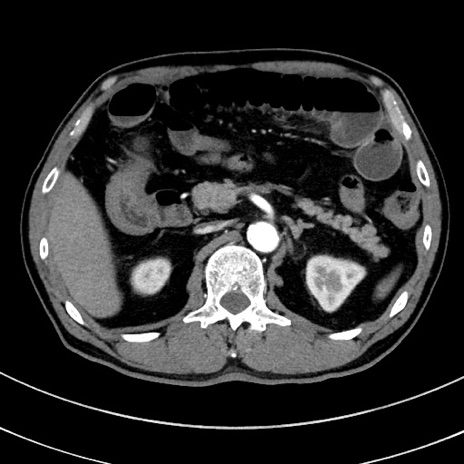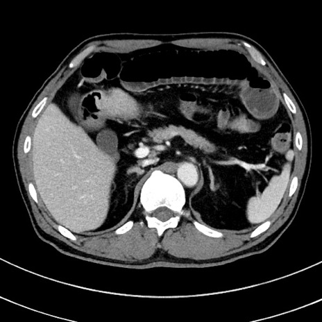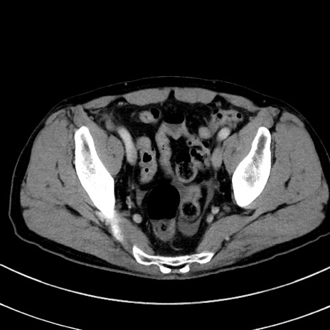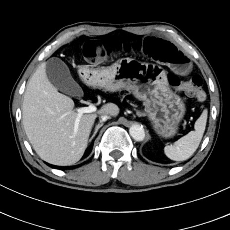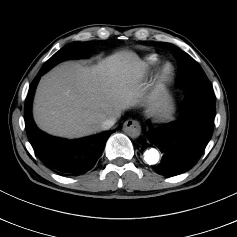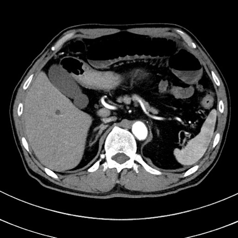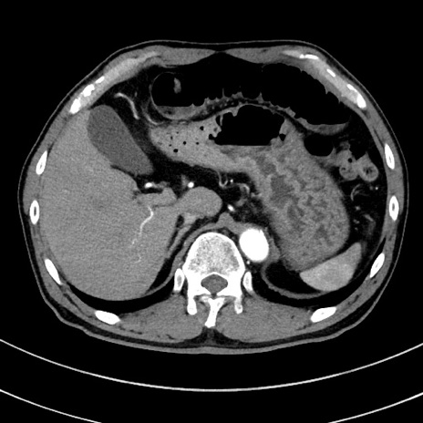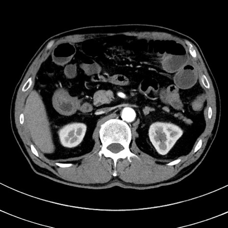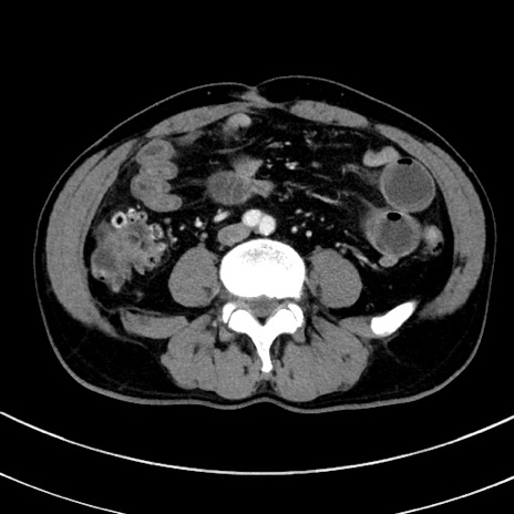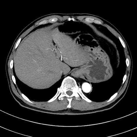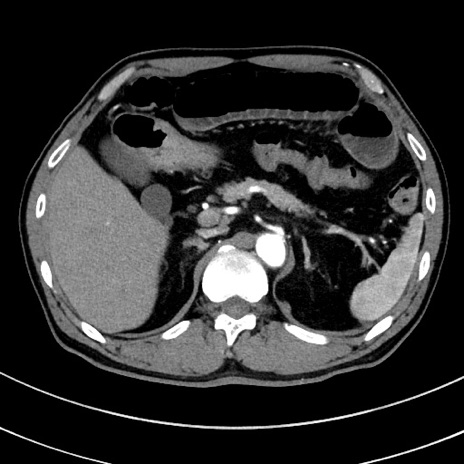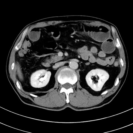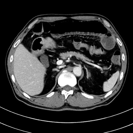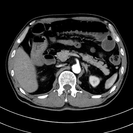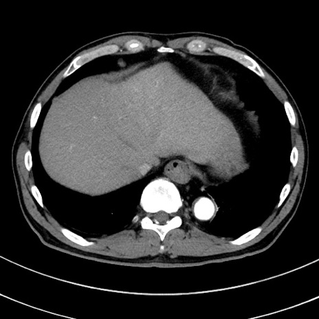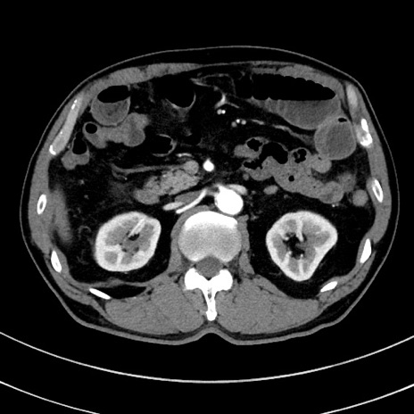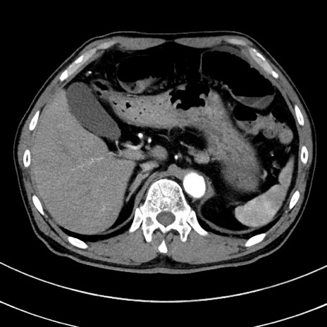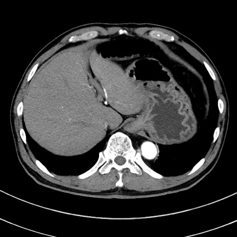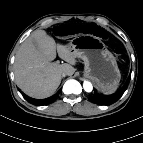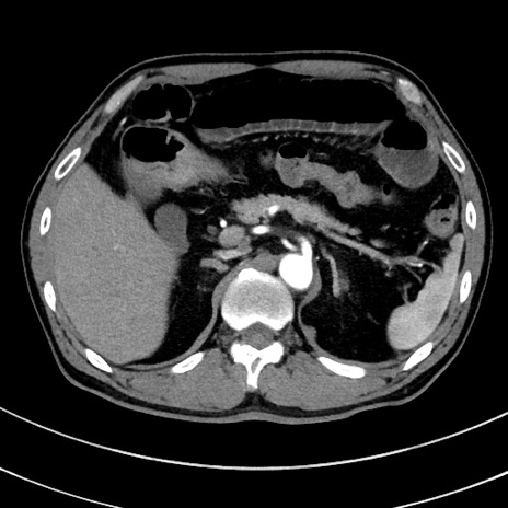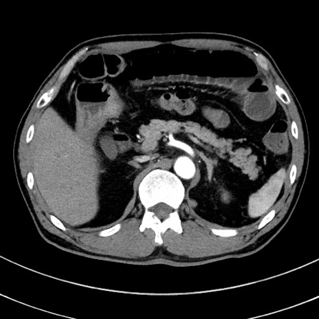 【症例】 60歳代男性 【主訴】 黒色吐物 【現病歴】 4日前から嘔気自覚、2日前の朝食後にも嘔気あり、自分で手で嘔吐反射起こし嘔吐したところ血が混ざっていたため受診。 【既往歴】 5年前汎発性腹膜炎を伴う急性虫垂炎で手術、高血圧、前立腺肥大症、高脂血症 【身体所見】 腹部正中に手術癩痕あり 腹部平坦・軟圧痛なし膨満感あり 【データ】WBC 8400、CRP 4.54