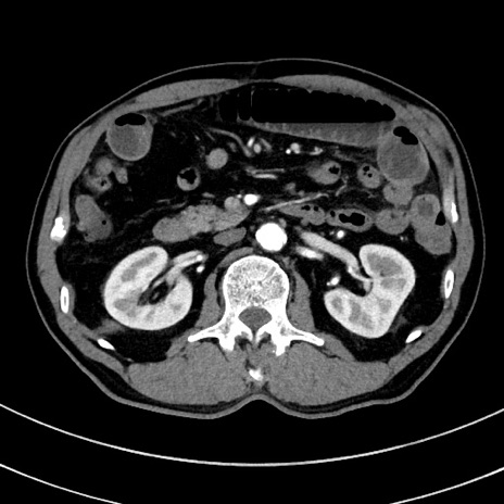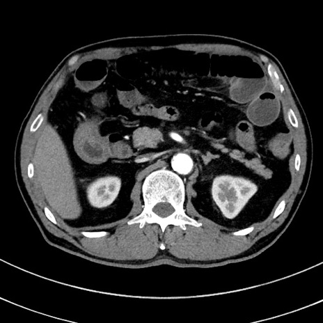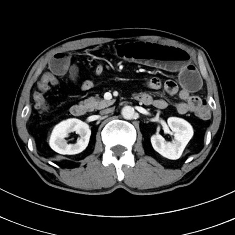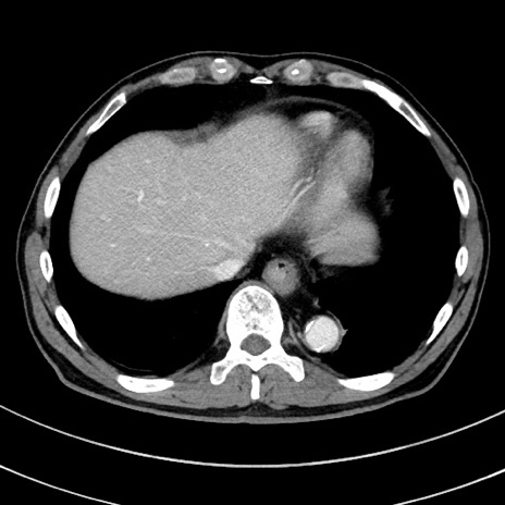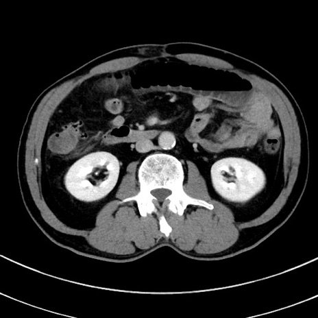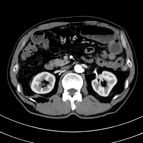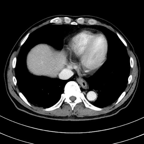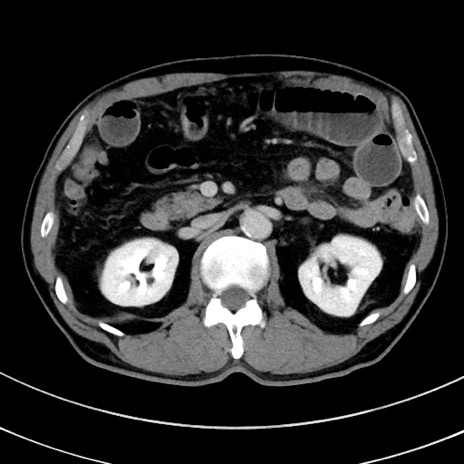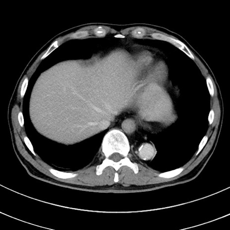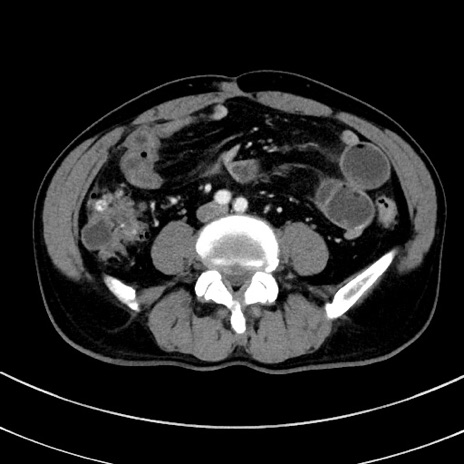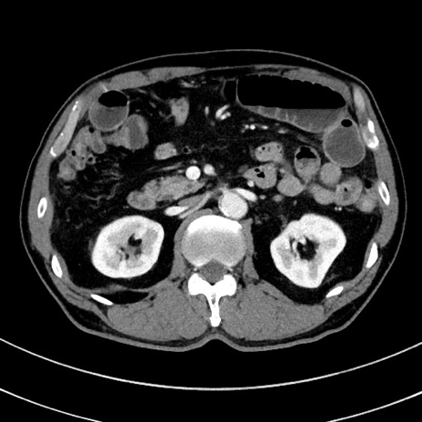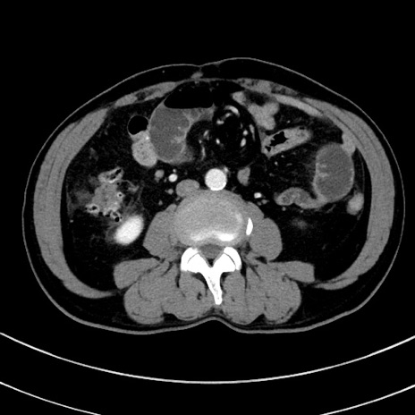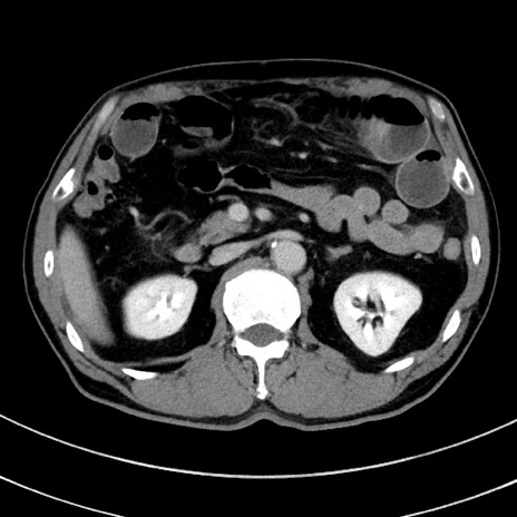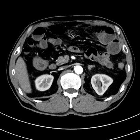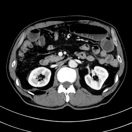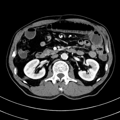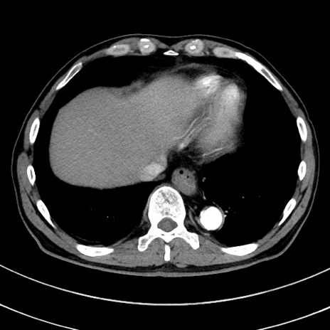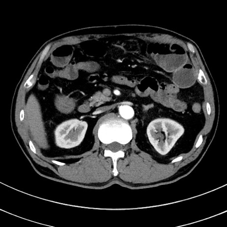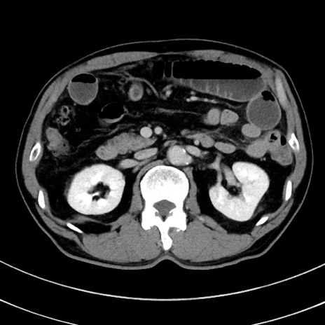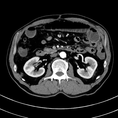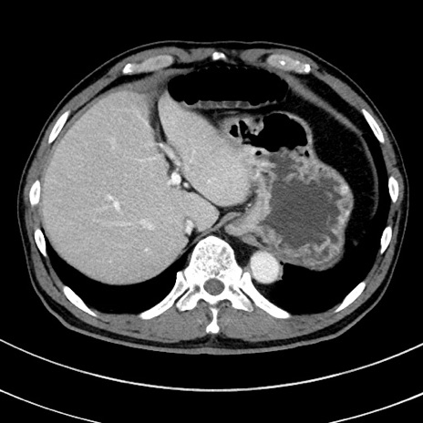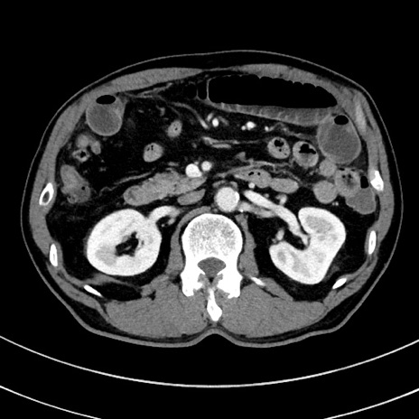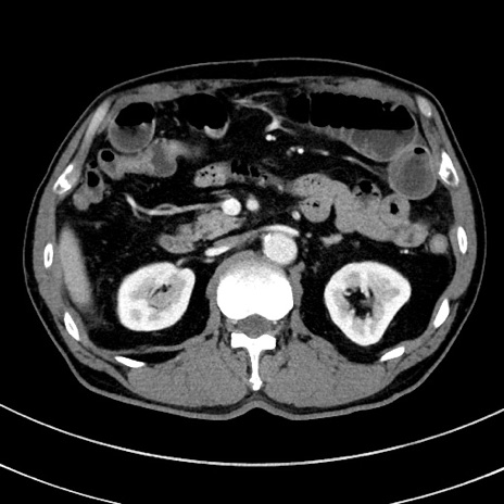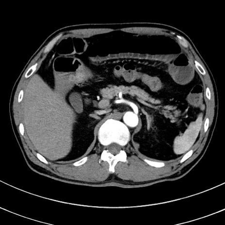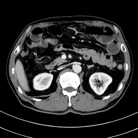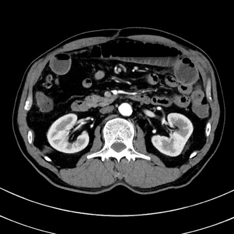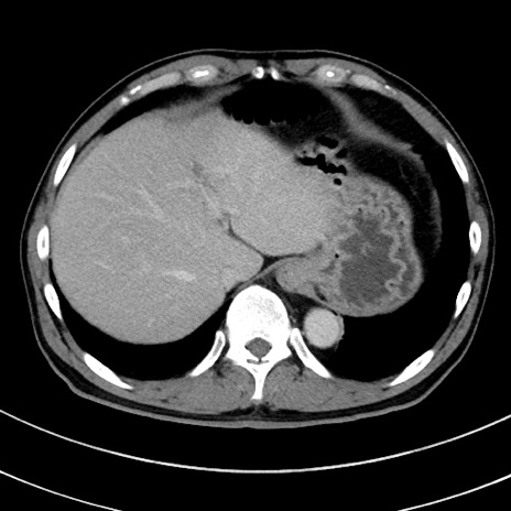 【症例】 60歳代男性 【主訴】 黒色吐物 【現病歴】 4日前から嘔気自覚、2日前の朝食後にも嘔気あり、自分で手で嘔吐反射起こし嘔吐したところ血が混ざっていたため受診。 【既往歴】 5年前汎発性腹膜炎を伴う急性虫垂炎で手術、高血圧、前立腺肥大症、高脂血症 【身体所見】 腹部正中に手術癩痕あり 腹部平坦・軟圧痛なし膨満感あり 【データ】WBC 8400、CRP 4.54