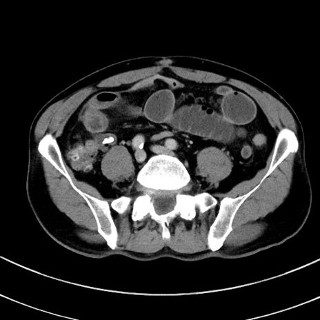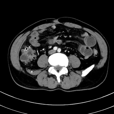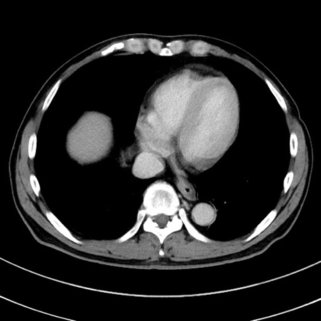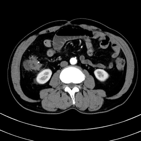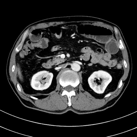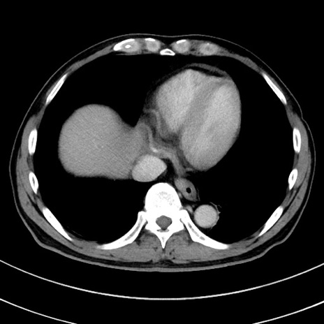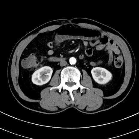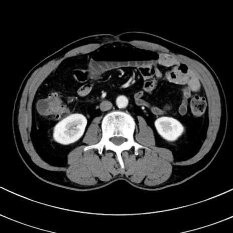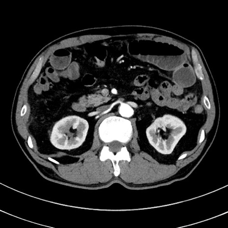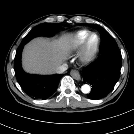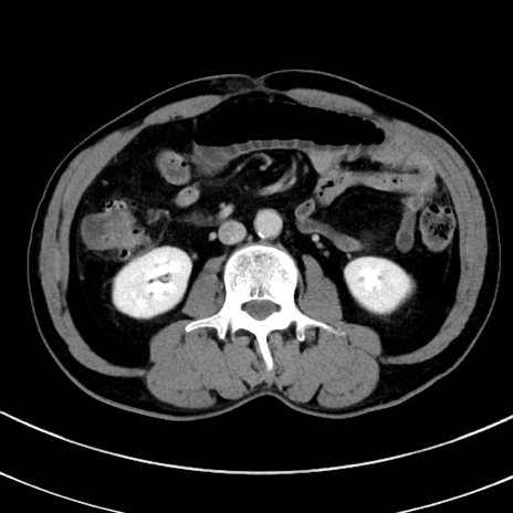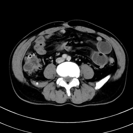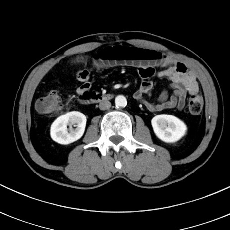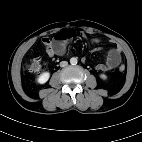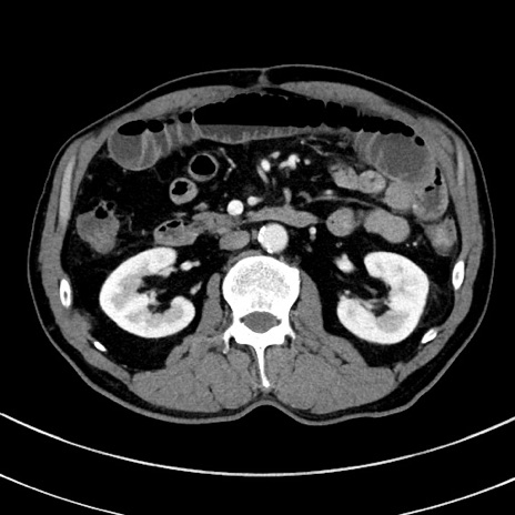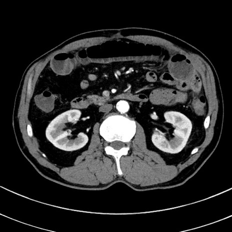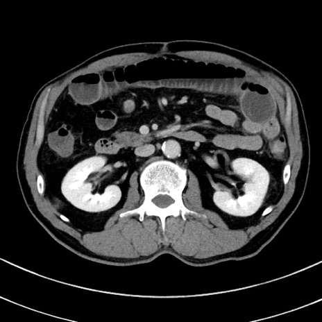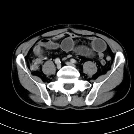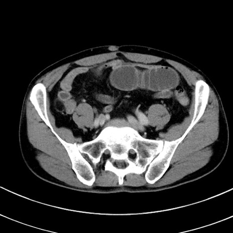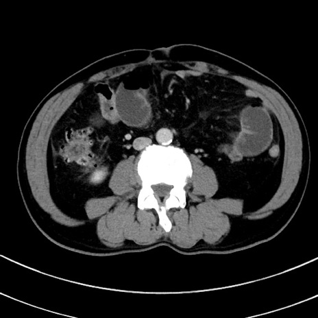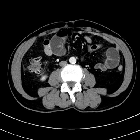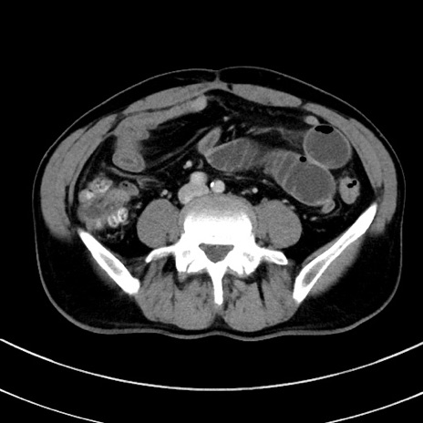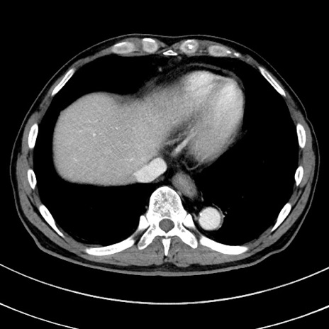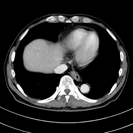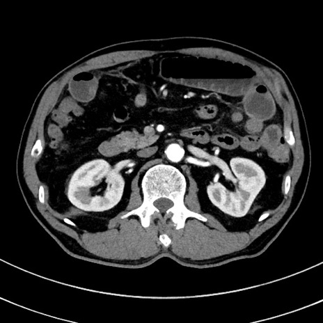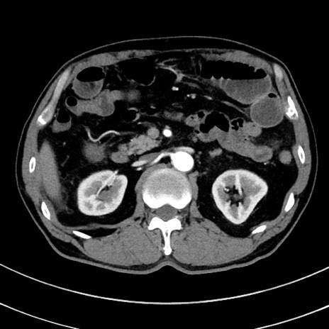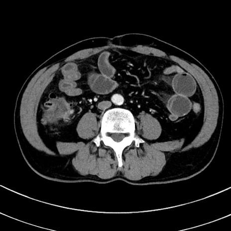 【症例】 60歳代男性 【主訴】 黒色吐物 【現病歴】 4日前から嘔気自覚、2日前の朝食後にも嘔気あり、自分で手で嘔吐反射起こし嘔吐したところ血が混ざっていたため受診。 【既往歴】 5年前汎発性腹膜炎を伴う急性虫垂炎で手術、高血圧、前立腺肥大症、高脂血症 【身体所見】 腹部正中に手術癩痕あり 腹部平坦・軟圧痛なし膨満感あり 【データ】WBC 8400、CRP 4.54
