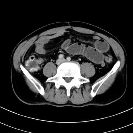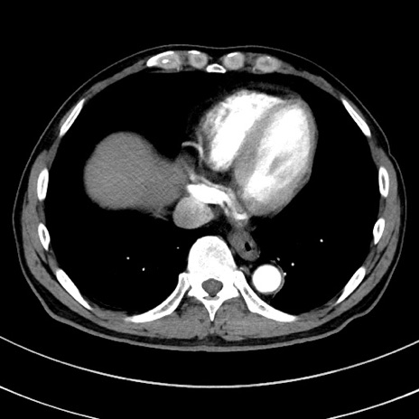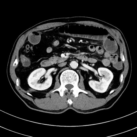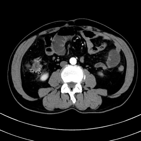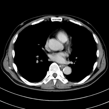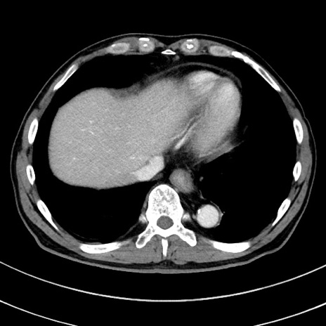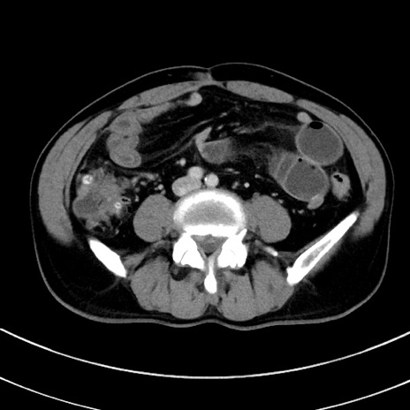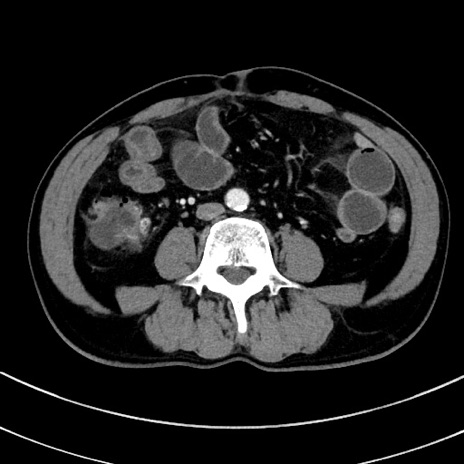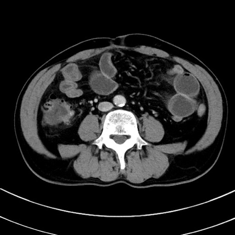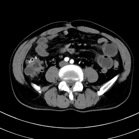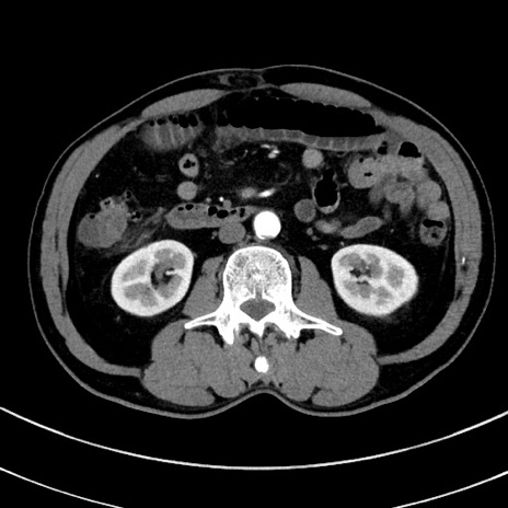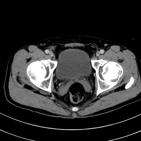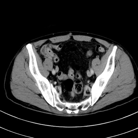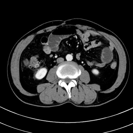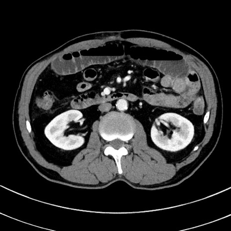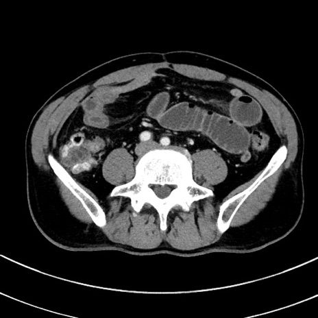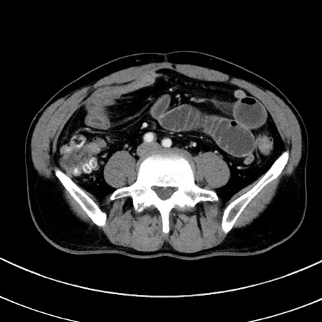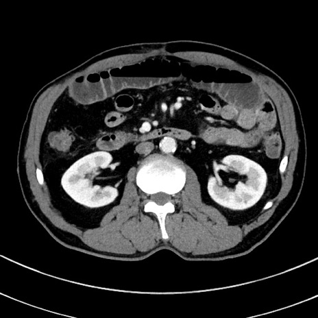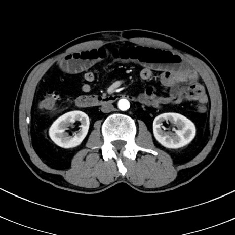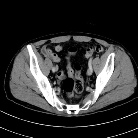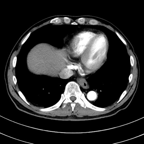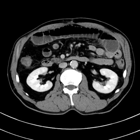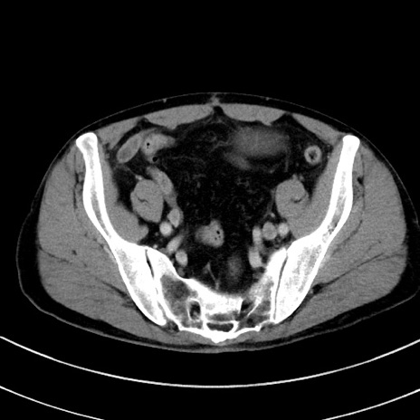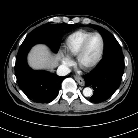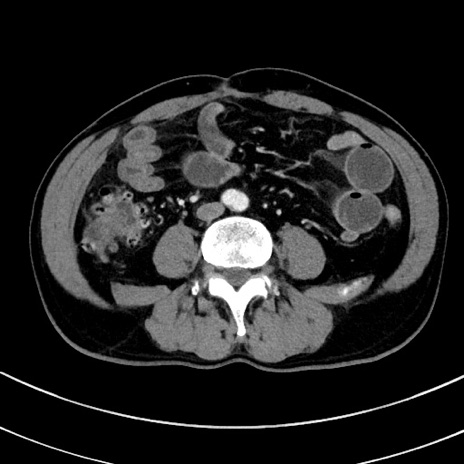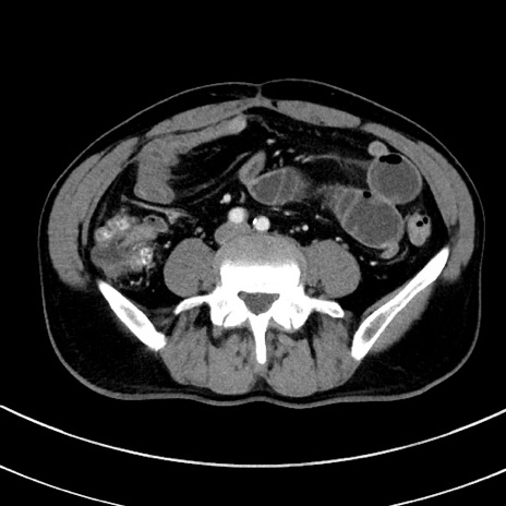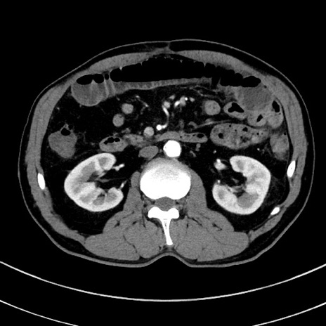 【症例】 60歳代男性 【主訴】 黒色吐物 【現病歴】 4日前から嘔気自覚、2日前の朝食後にも嘔気あり、自分で手で嘔吐反射起こし嘔吐したところ血が混ざっていたため受診。 【既往歴】 5年前汎発性腹膜炎を伴う急性虫垂炎で手術、高血圧、前立腺肥大症、高脂血症 【身体所見】 腹部正中に手術癩痕あり 腹部平坦・軟圧痛なし膨満感あり 【データ】WBC 8400、CRP 4.54