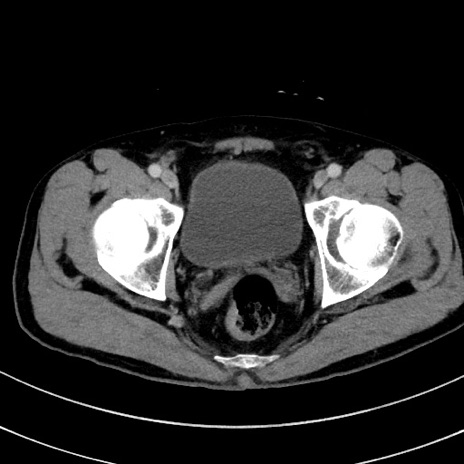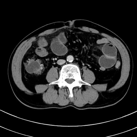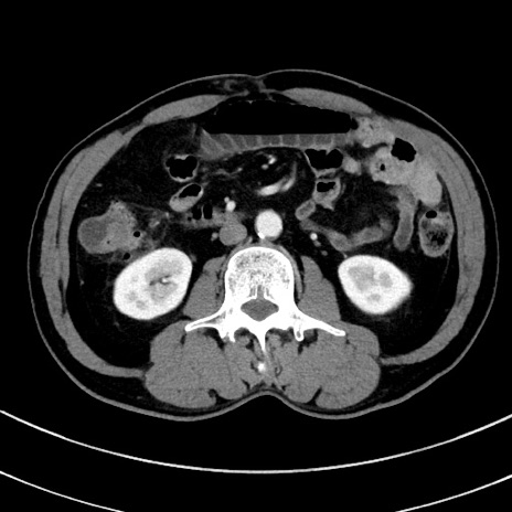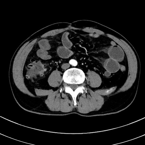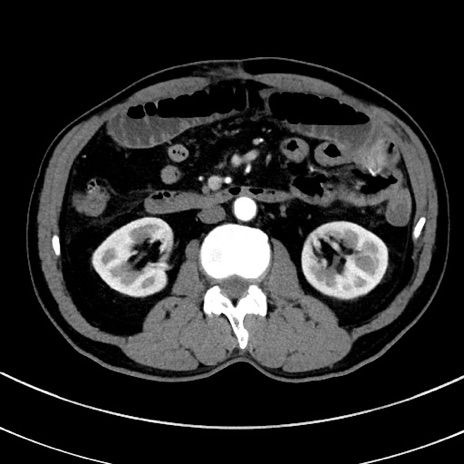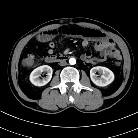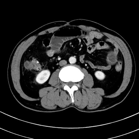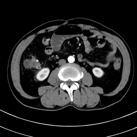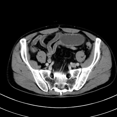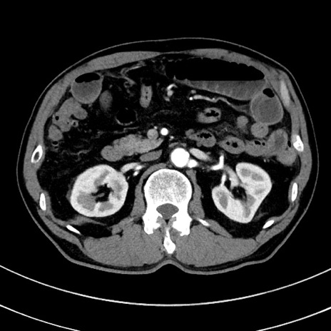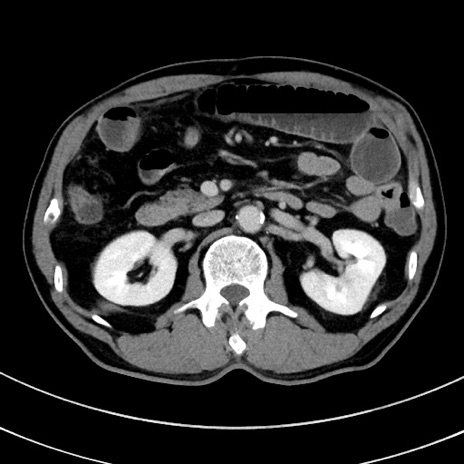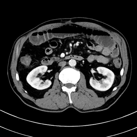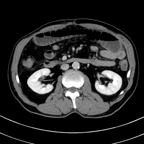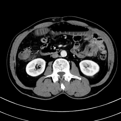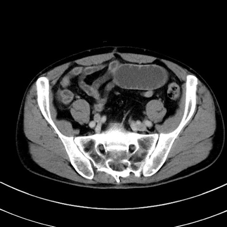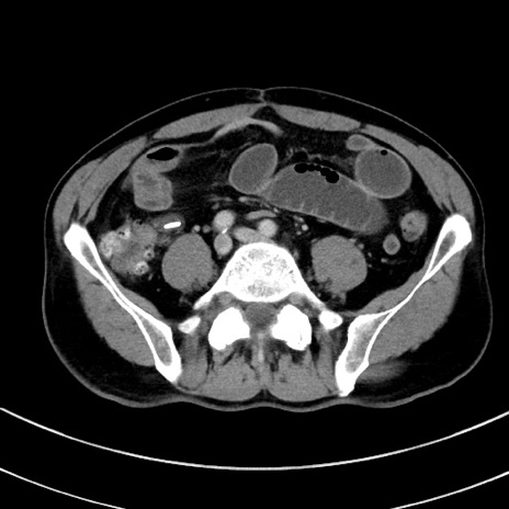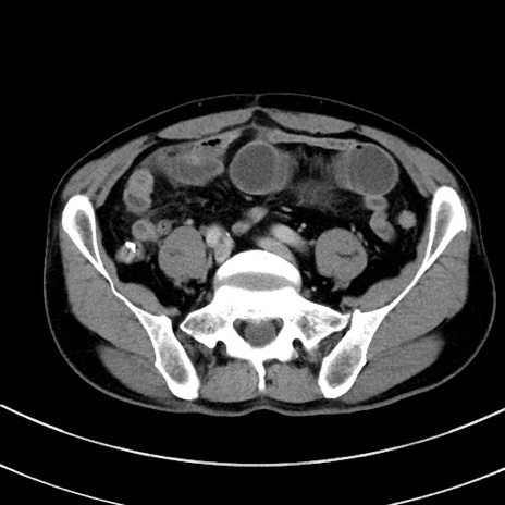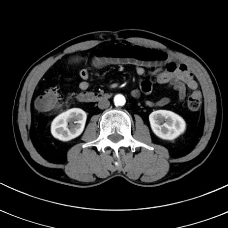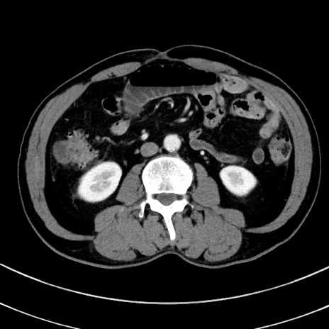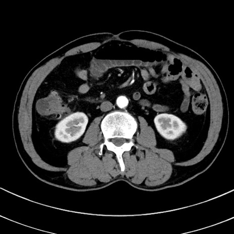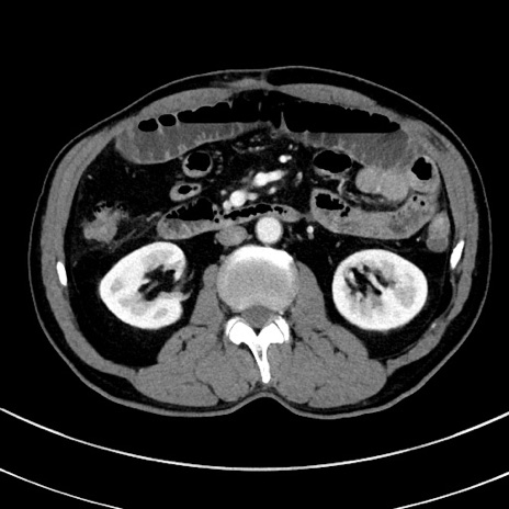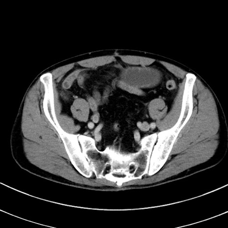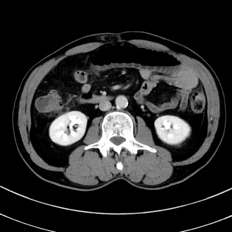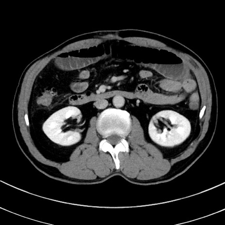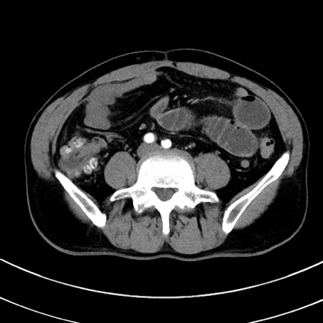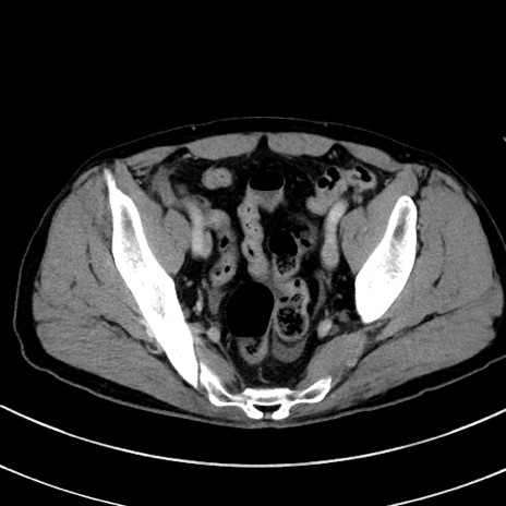 【症例】 60歳代男性 【主訴】 黒色吐物 【現病歴】 4日前から嘔気自覚、2日前の朝食後にも嘔気あり、自分で手で嘔吐反射起こし嘔吐したところ血が混ざっていたため受診。 【既往歴】 5年前汎発性腹膜炎を伴う急性虫垂炎で手術、高血圧、前立腺肥大症、高脂血症 【身体所見】 腹部正中に手術癩痕あり 腹部平坦・軟圧痛なし膨満感あり 【データ】WBC 8400、CRP 4.54
