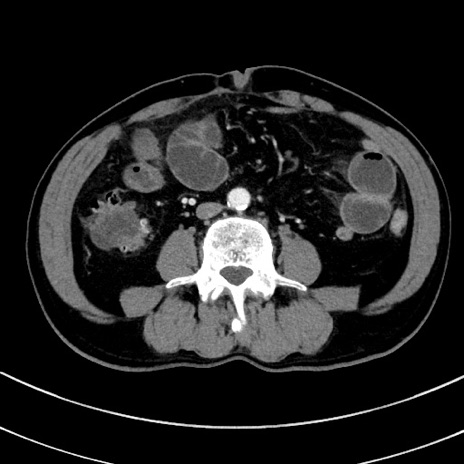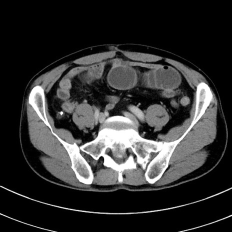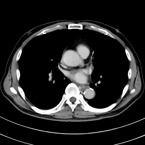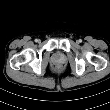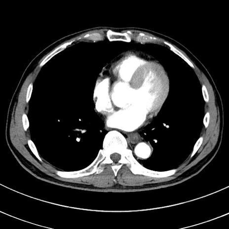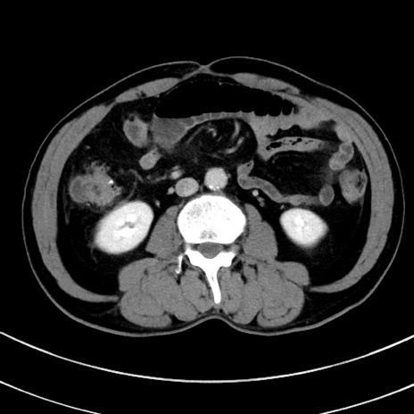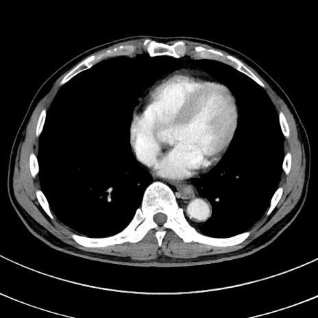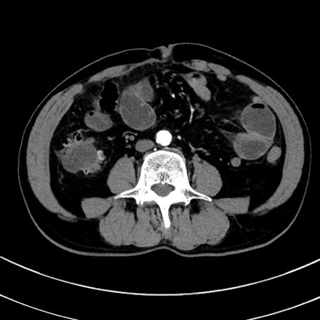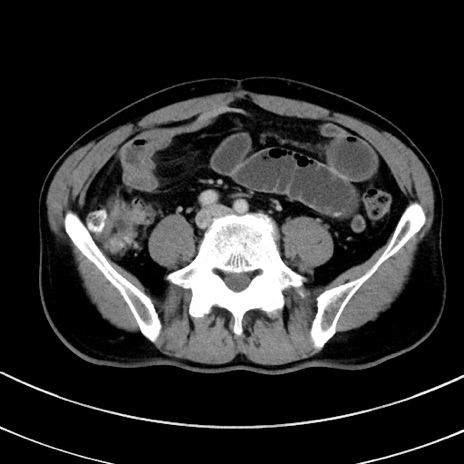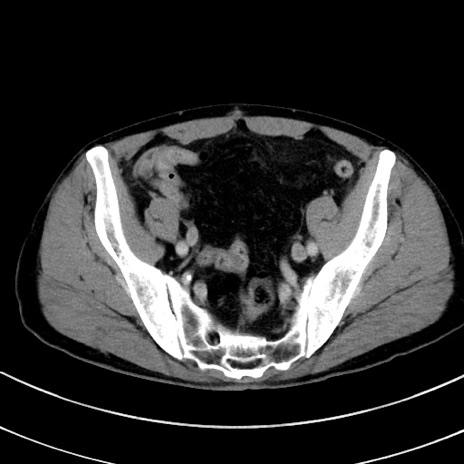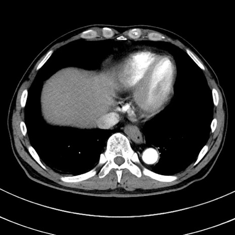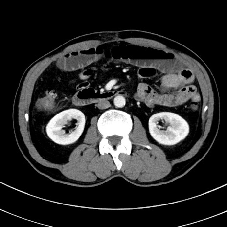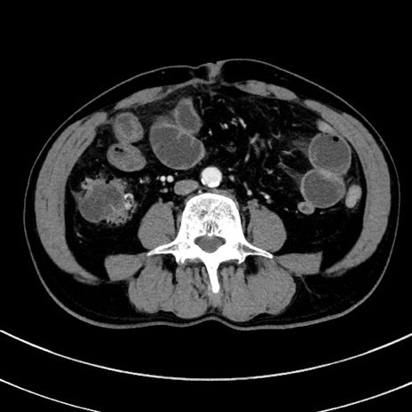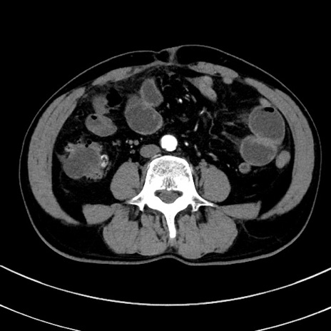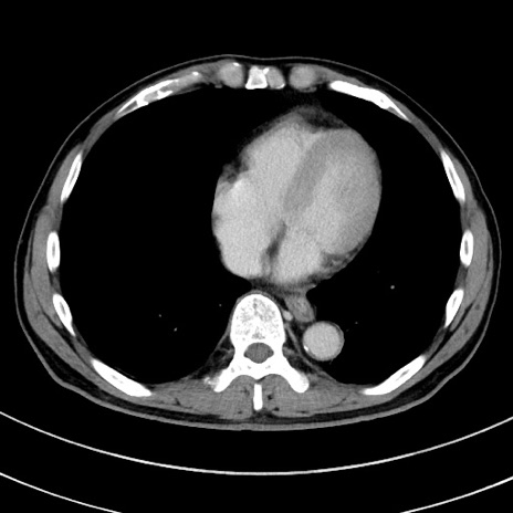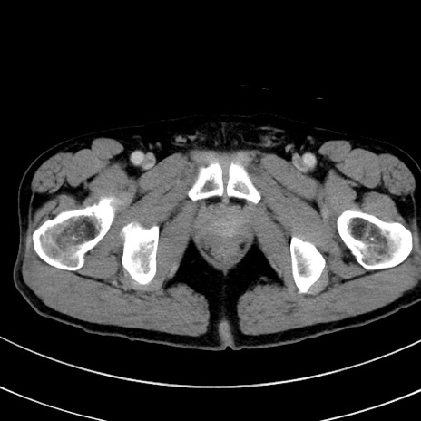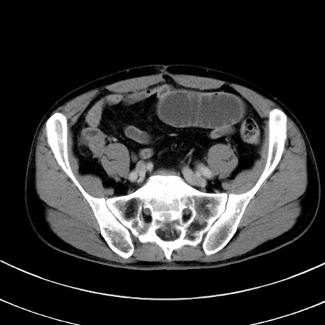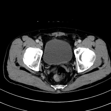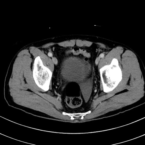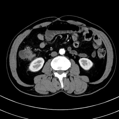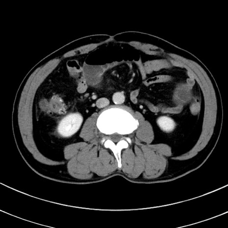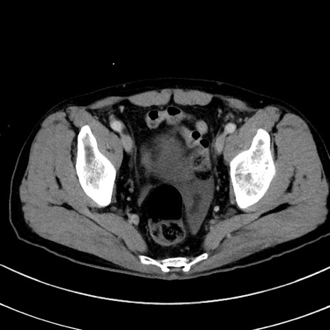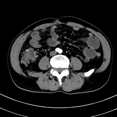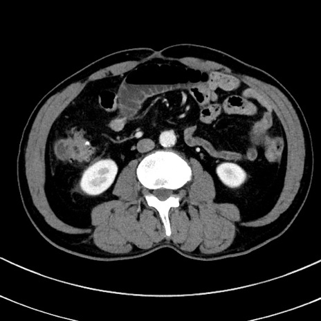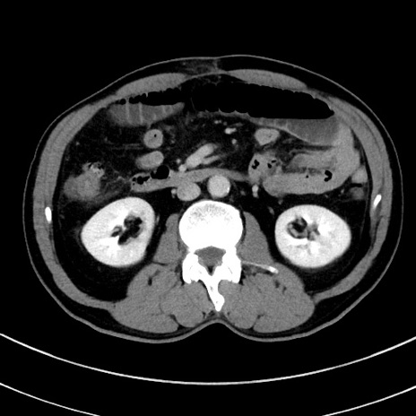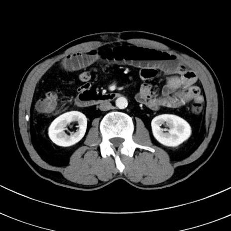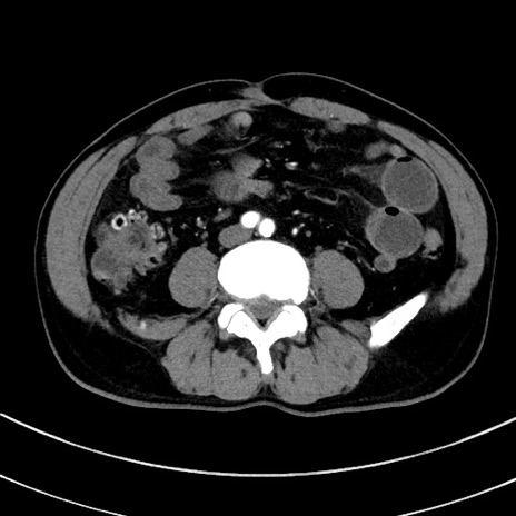 【症例】 60歳代男性 【主訴】 黒色吐物 【現病歴】 4日前から嘔気自覚、2日前の朝食後にも嘔気あり、自分で手で嘔吐反射起こし嘔吐したところ血が混ざっていたため受診。 【既往歴】 5年前汎発性腹膜炎を伴う急性虫垂炎で手術、高血圧、前立腺肥大症、高脂血症 【身体所見】 腹部正中に手術癩痕あり 腹部平坦・軟圧痛なし膨満感あり 【データ】WBC 8400、CRP 4.54