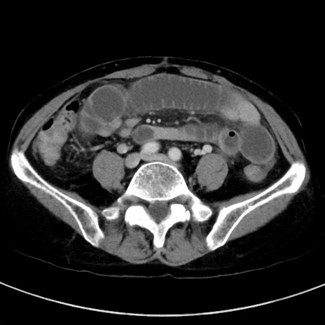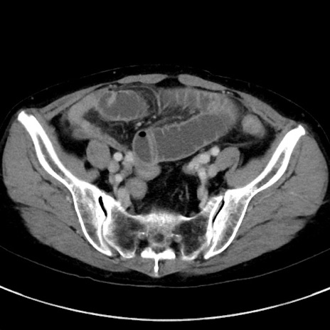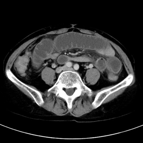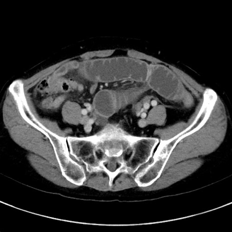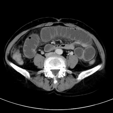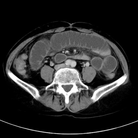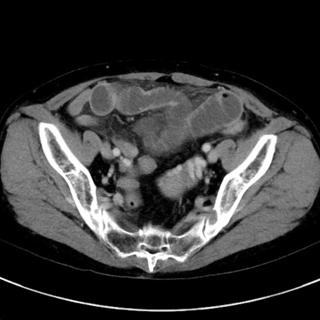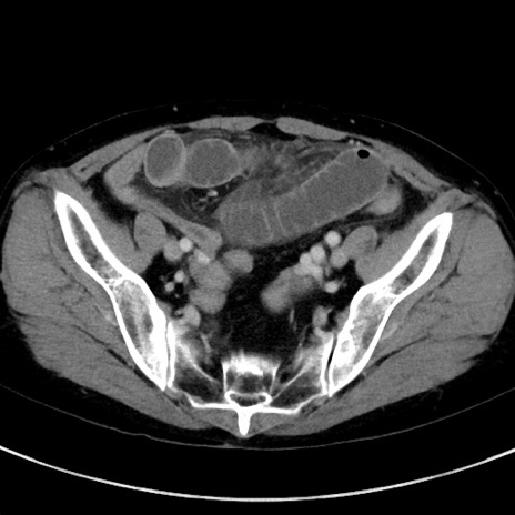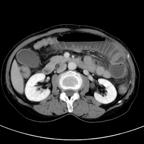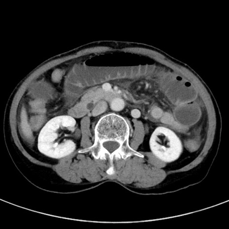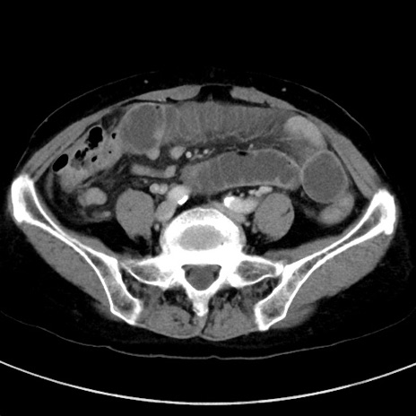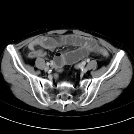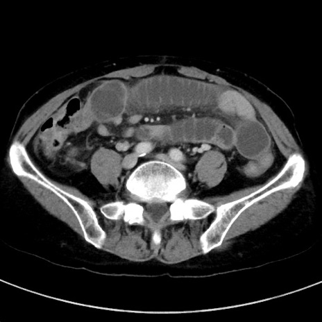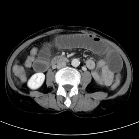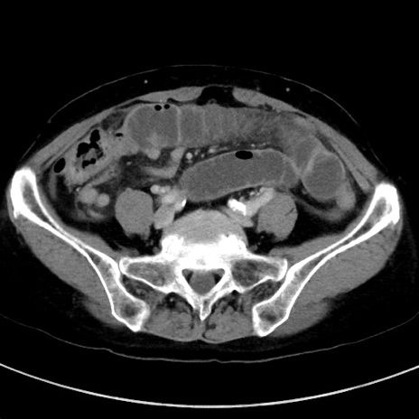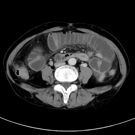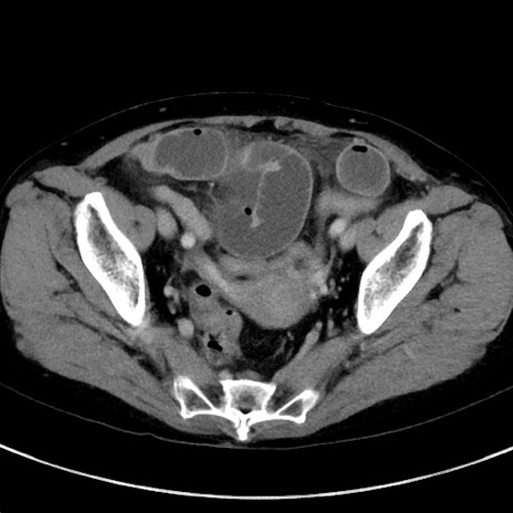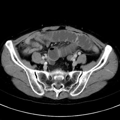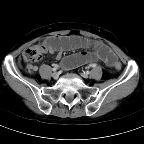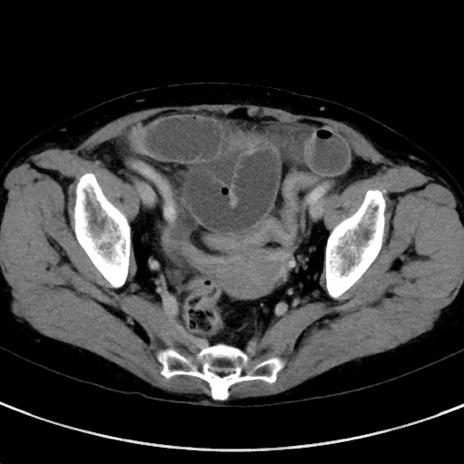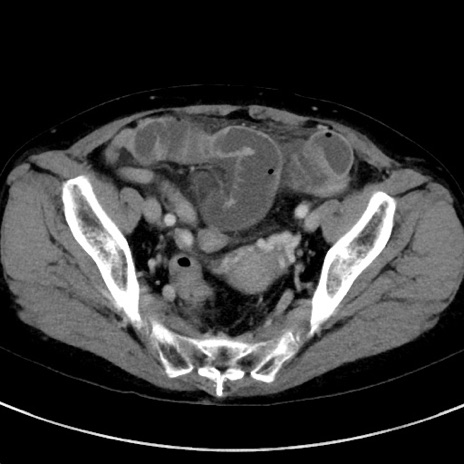 【症例】70歳代女性 【主訴】下腹部痛・嘔吐 【現病歴】2日前より腹痛あり。昨日嘔吐あり。症状改善しないため来院。 【既往歴】胃GISTに対して胃部分切除後。 【身体所見】BT 37.1℃、BP 128/77mmHg、腹部:平坦・軟、下腹部に圧痛あり。 【データ】WBC 10200、CRP 0.31