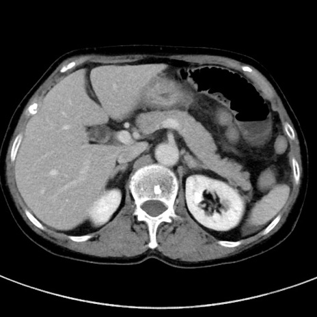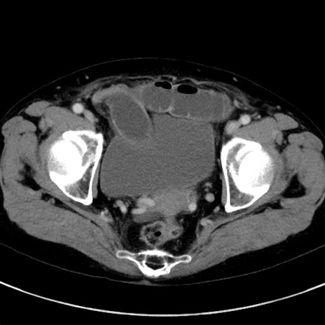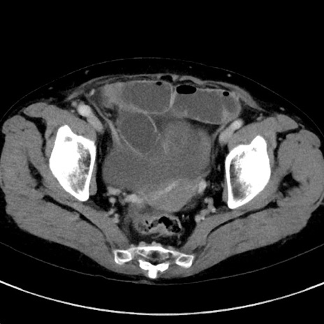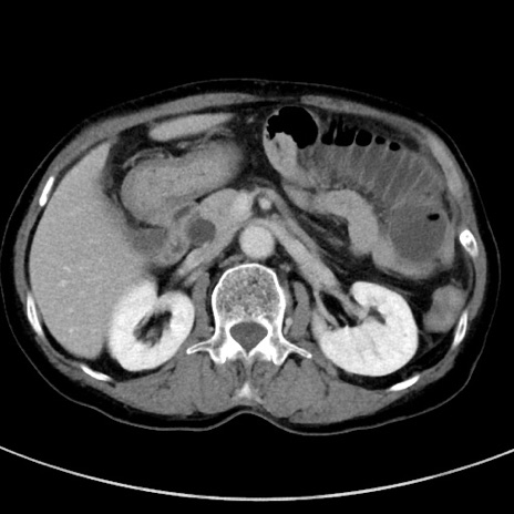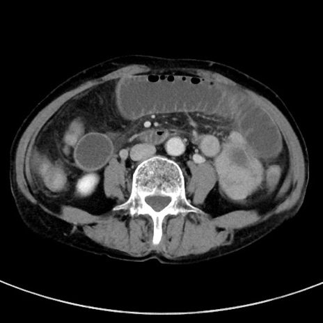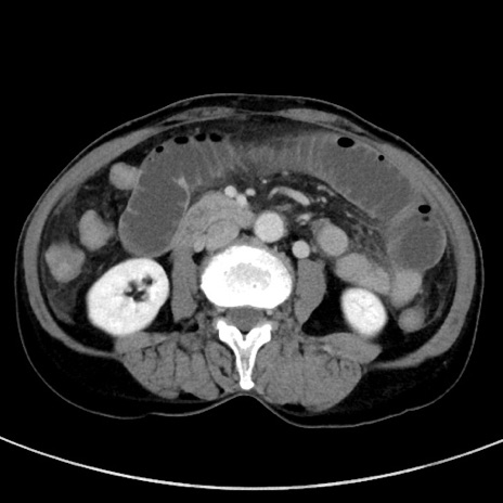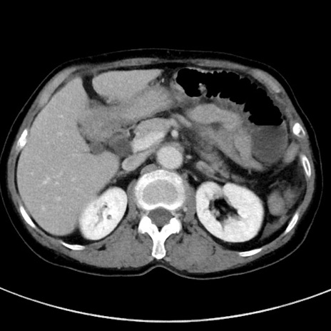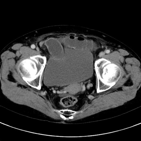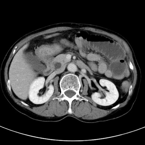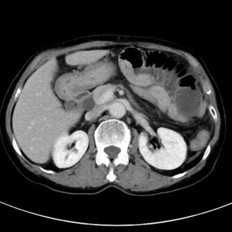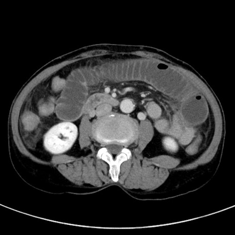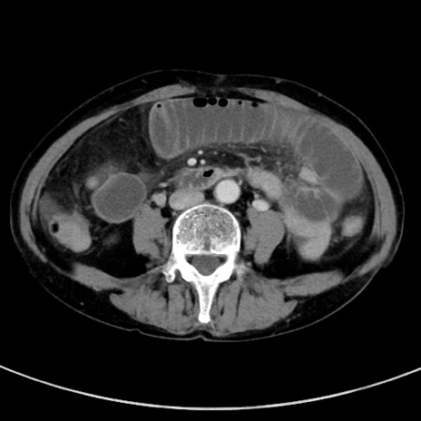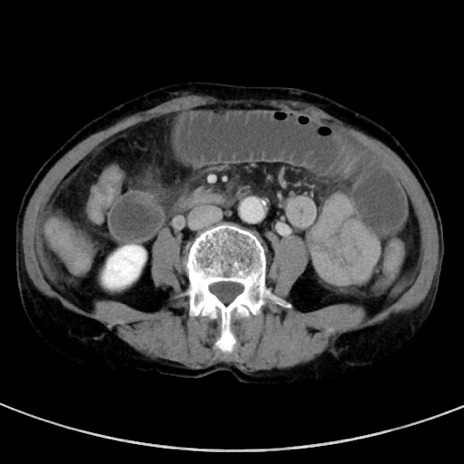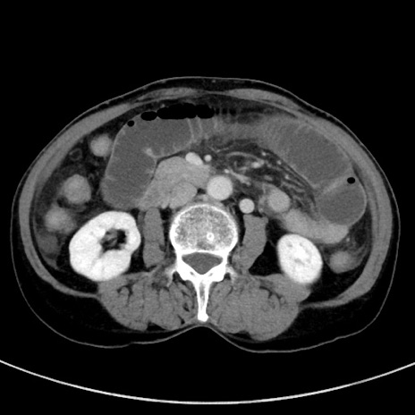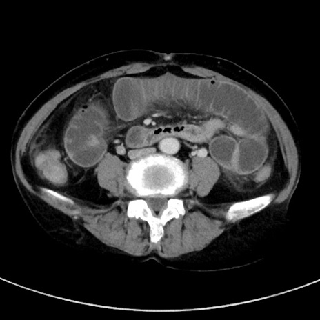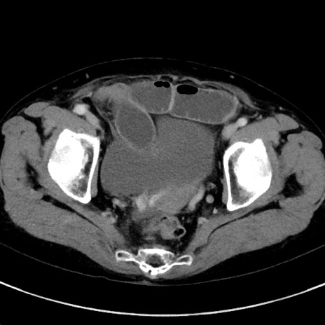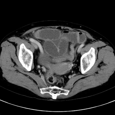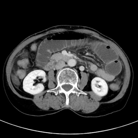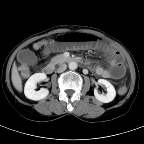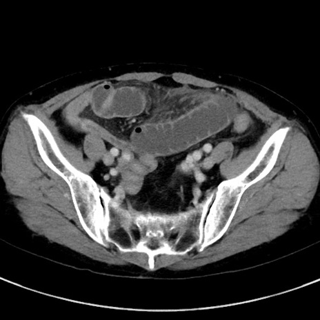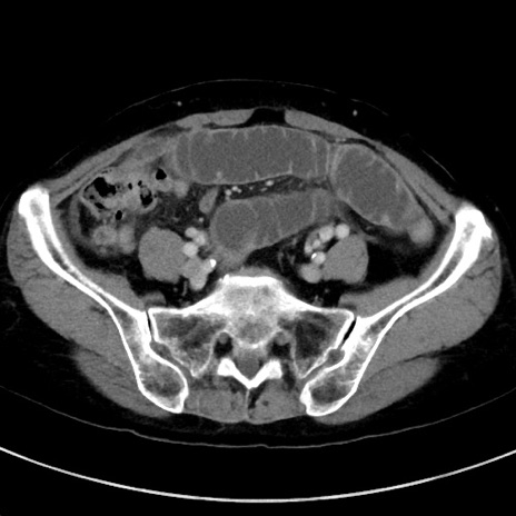 【症例】70歳代女性 【主訴】下腹部痛・嘔吐 【現病歴】2日前より腹痛あり。昨日嘔吐あり。症状改善しないため来院。 【既往歴】胃GISTに対して胃部分切除後。 【身体所見】BT 37.1℃、BP 128/77mmHg、腹部:平坦・軟、下腹部に圧痛あり。 【データ】WBC 10200、CRP 0.31