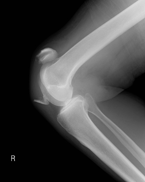 【症例】60歳代女性 【主訴】右膝痛 【現病歴】本日椅子より転落し受傷。右膝痛及び歩行困難となり来院。 【身体所見】右膝腫脹++、右足関節の運動は良好、感覚障害なし。