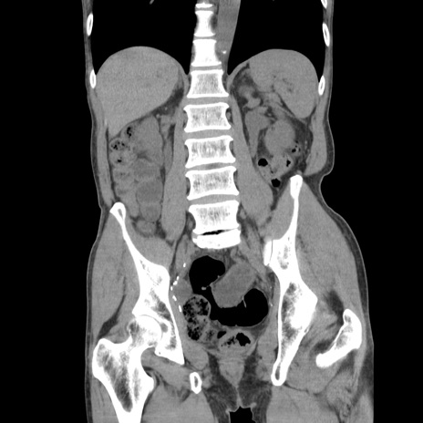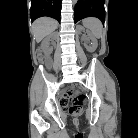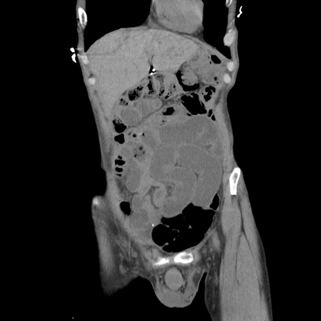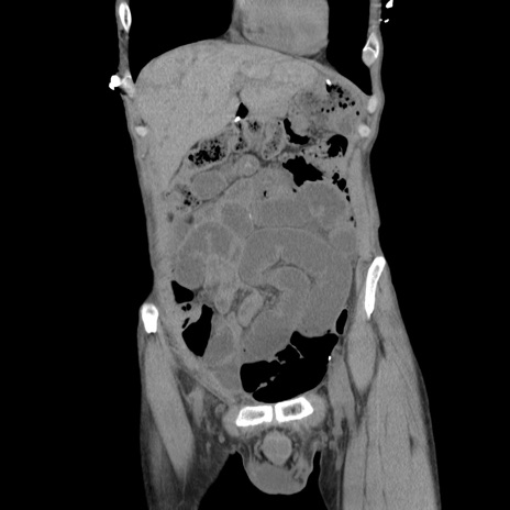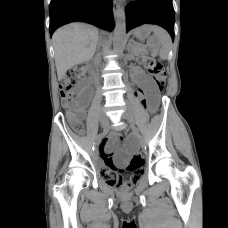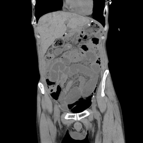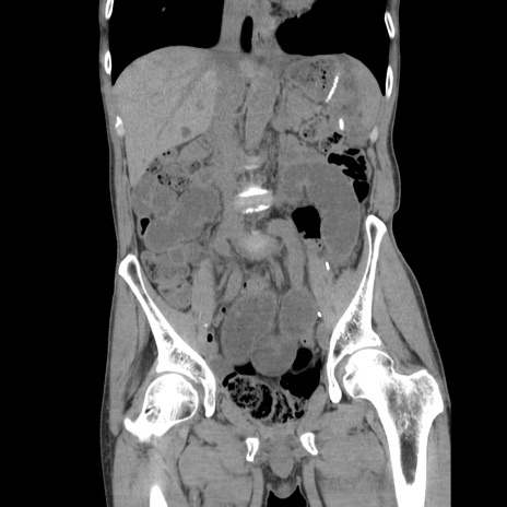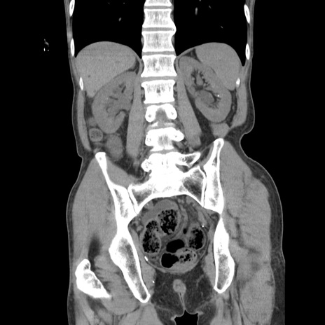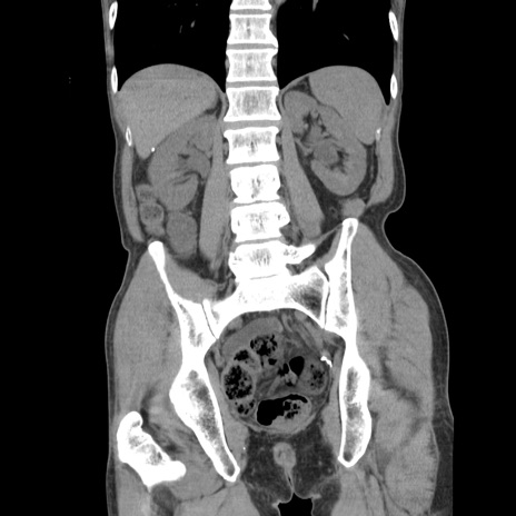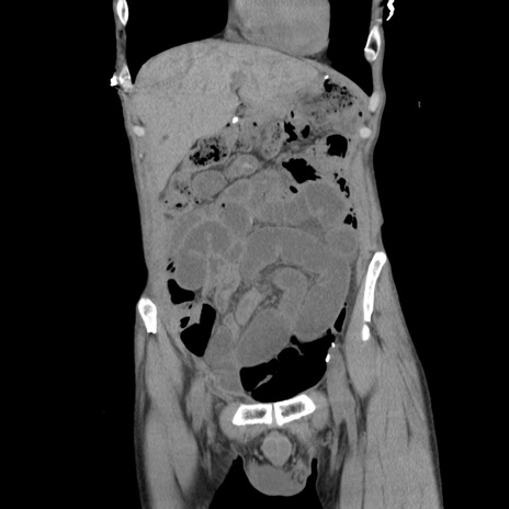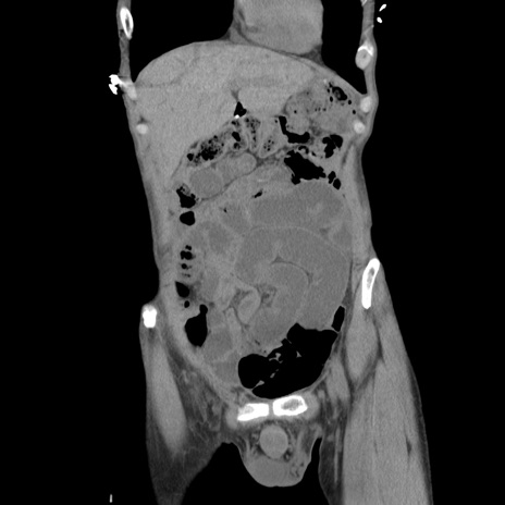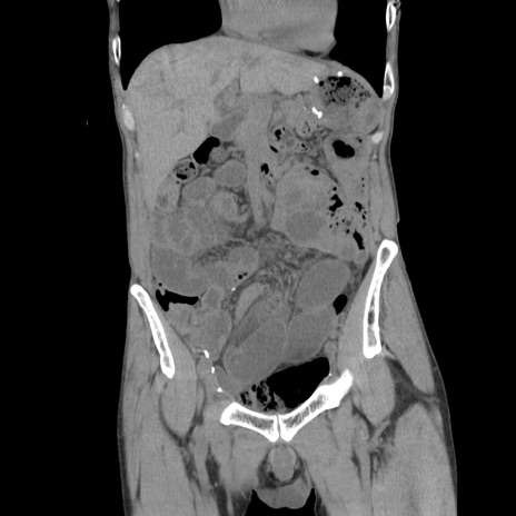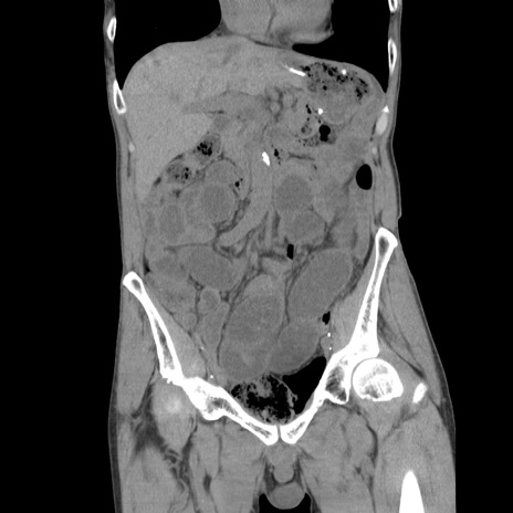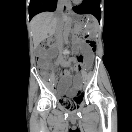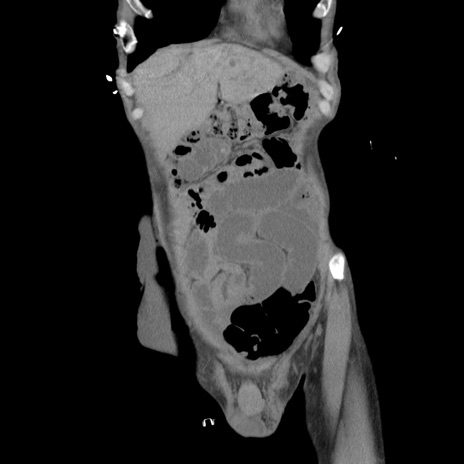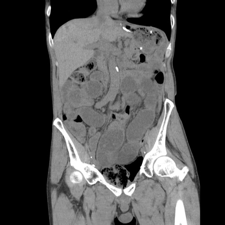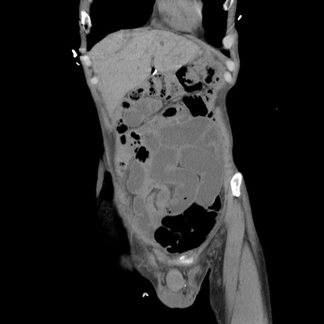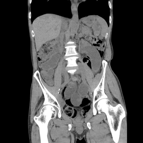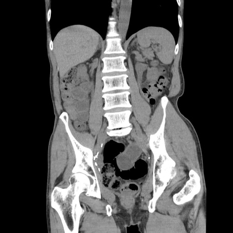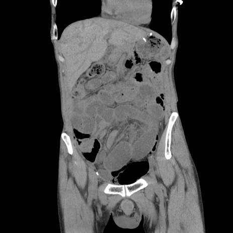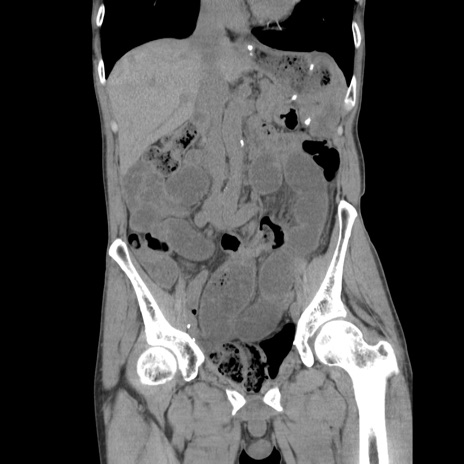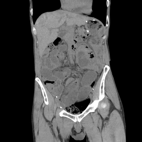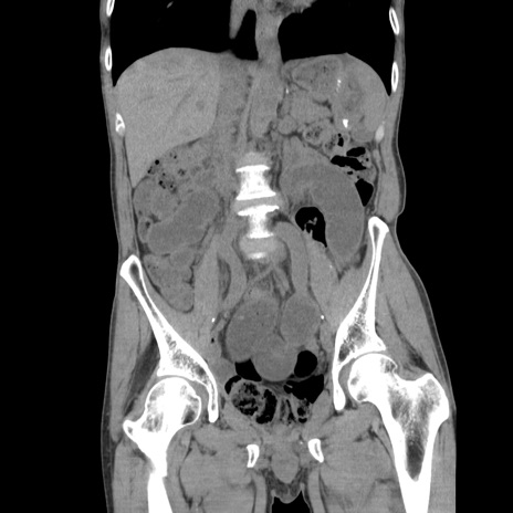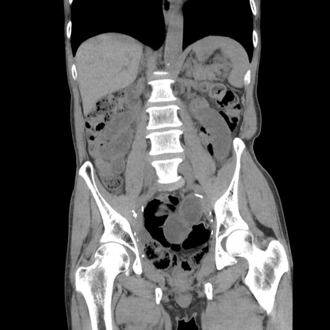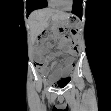 【症例】 60歳代男性 【主訴】 下腹部痛 【現病歴】 本日夜中より下腹部痛の症状認め、受診。 【既往歴】 膀胱癌(膀胱全摘+尿管皮膚瘻術) 、胃癌術後 【身体所見】 BT 35.3℃、PR 58/min、BP 136/98mHg、腹部平坦、軟、腸蠕動音±、ストマ留置あり、左上腹部~正中部に圧痛あり、反跳痛なし。 【データ】WBC 5100、CRP0.01
