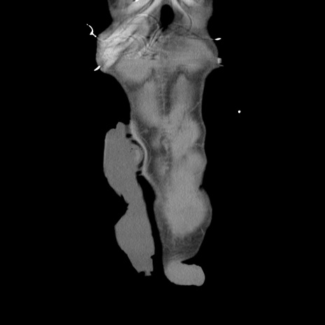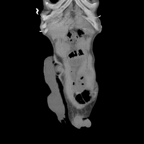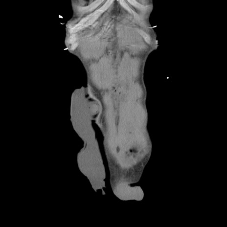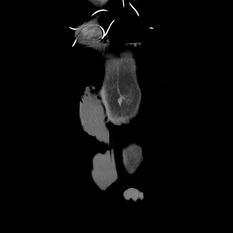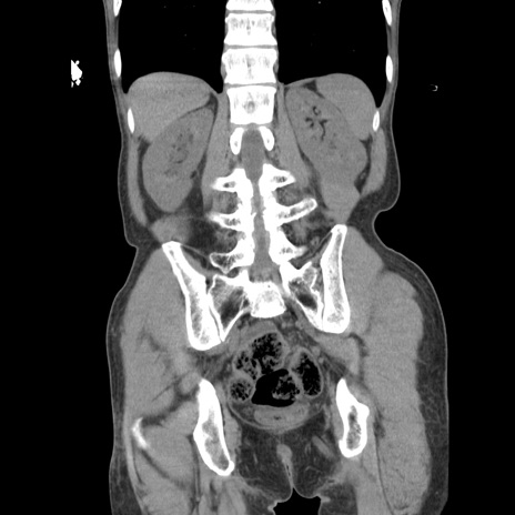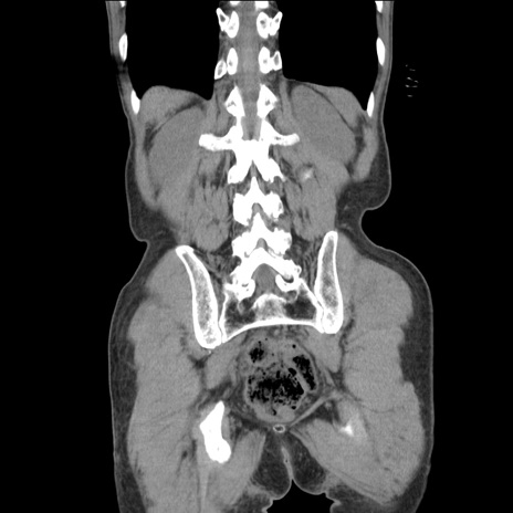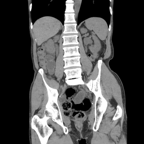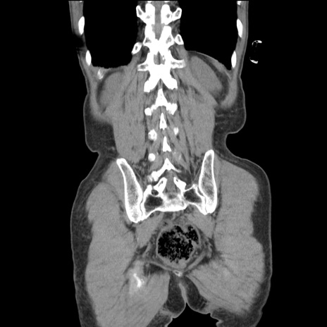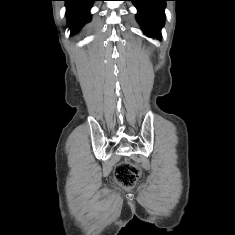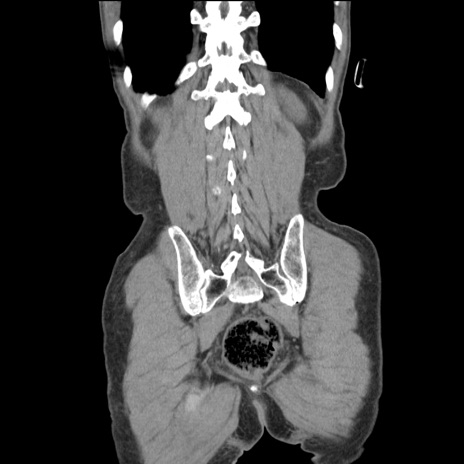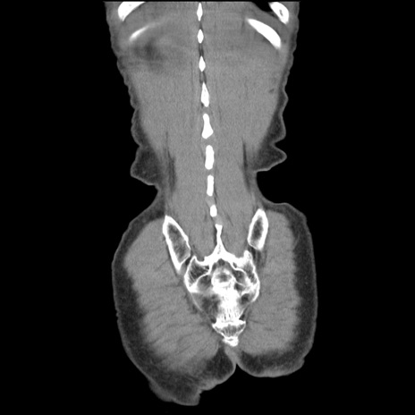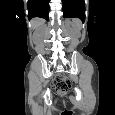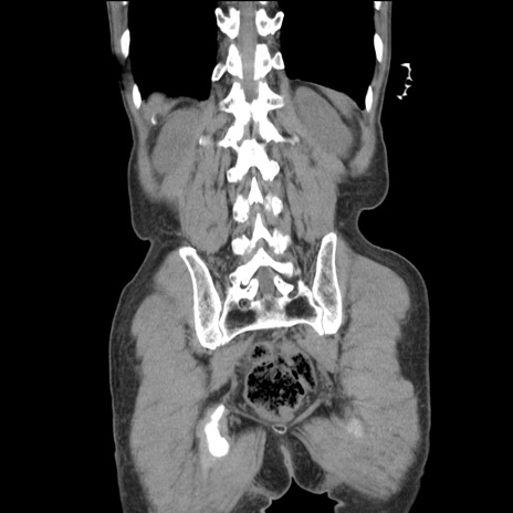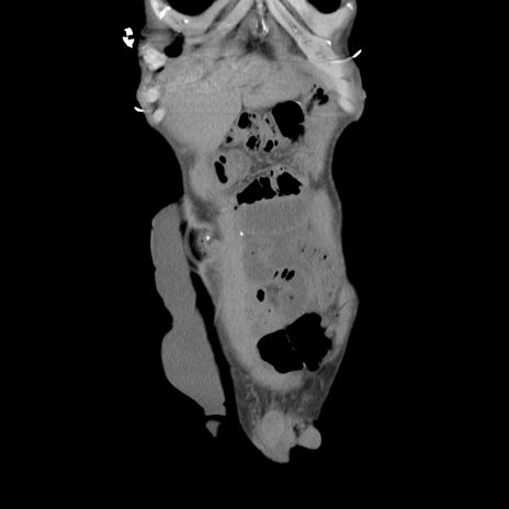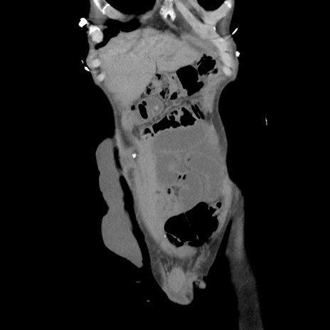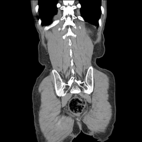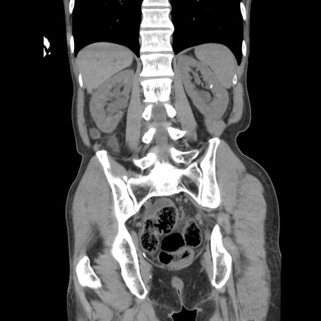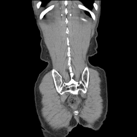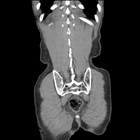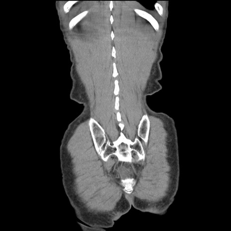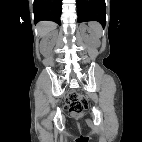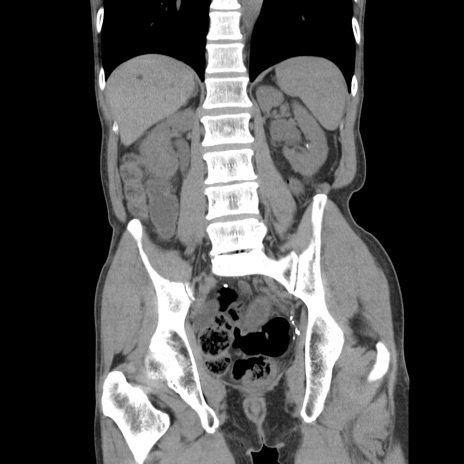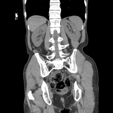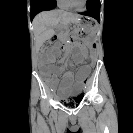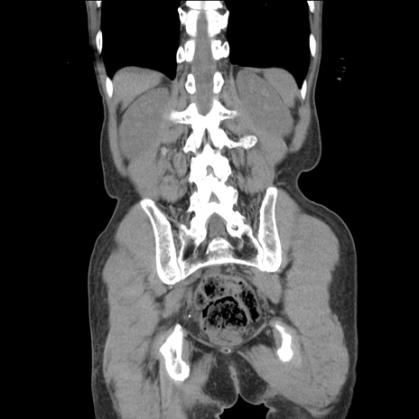 【症例】 60歳代男性 【主訴】 下腹部痛 【現病歴】 本日夜中より下腹部痛の症状認め、受診。 【既往歴】 膀胱癌(膀胱全摘+尿管皮膚瘻術) 、胃癌術後 【身体所見】 BT 35.3℃、PR 58/min、BP 136/98mHg、腹部平坦、軟、腸蠕動音±、ストマ留置あり、左上腹部~正中部に圧痛あり、反跳痛なし。 【データ】WBC 5100、CRP0.01