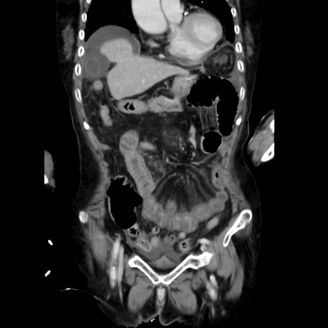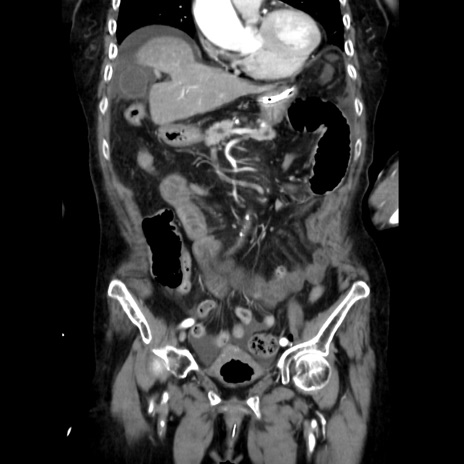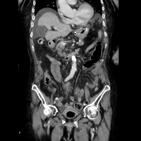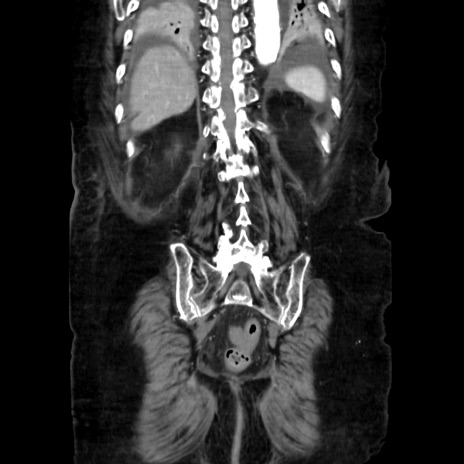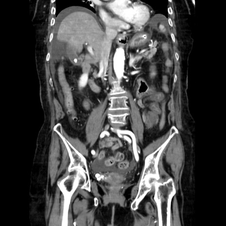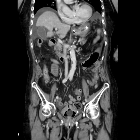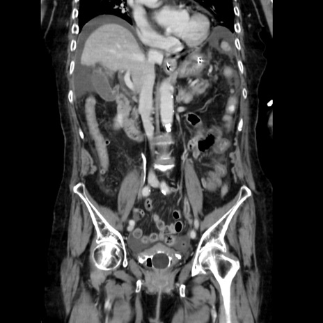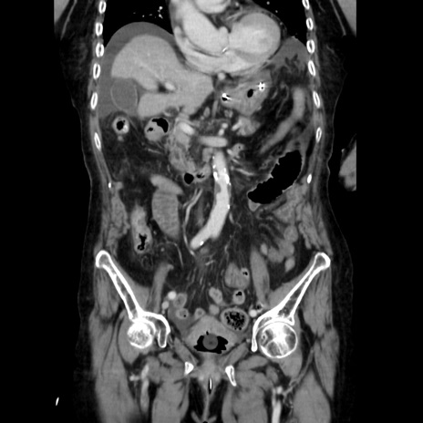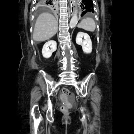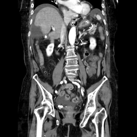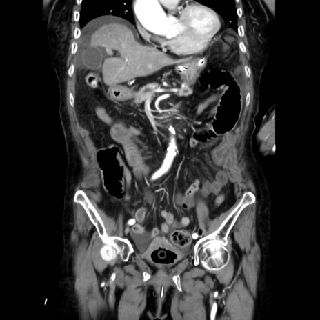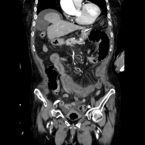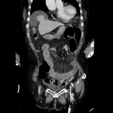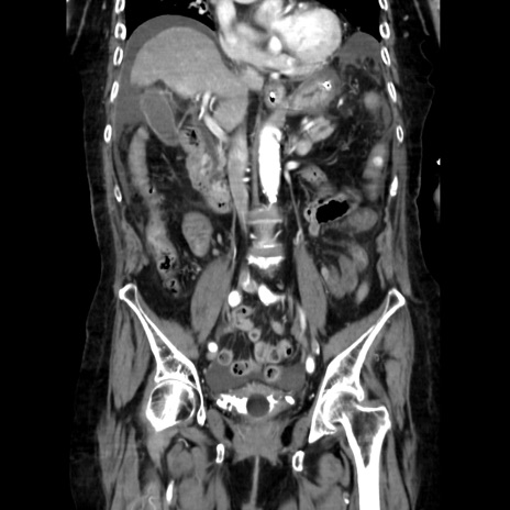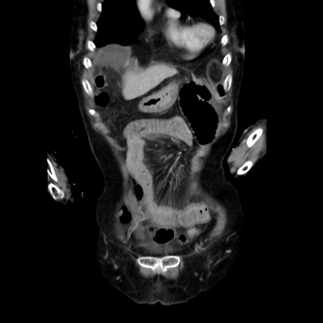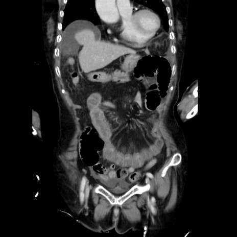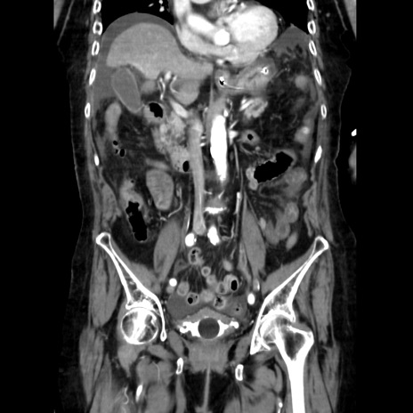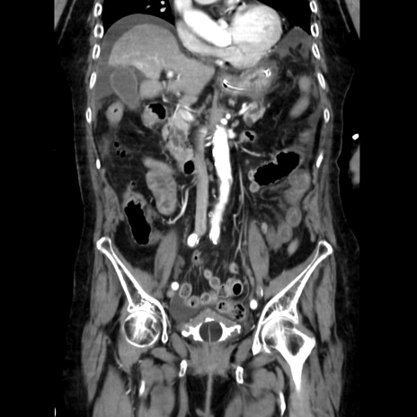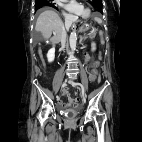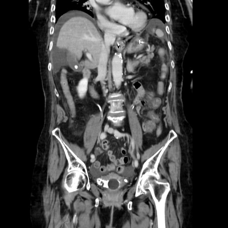 【症例】90歳代女性 【主訴】腹痛・嘔吐 【現病歴】 食欲低下、嘔吐があり昨日他院受診。肺炎と診断され入院となる。入院後より腹部全体に圧痛あり。胃管留置され経過みていたが、症状持続するため、当院転院となる。 【既往歴】胸椎圧迫骨折、胆石症 【身体所見】腹部:中央に激痛あり、圧痛あり、反跳痛不明 【データ】WBC 17100、CRP 18.82