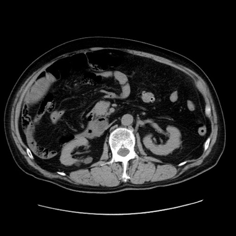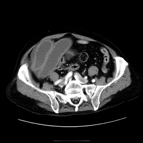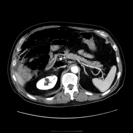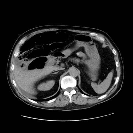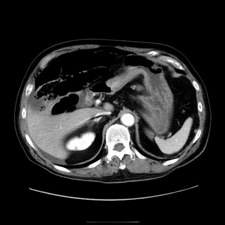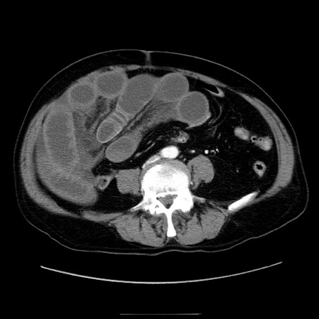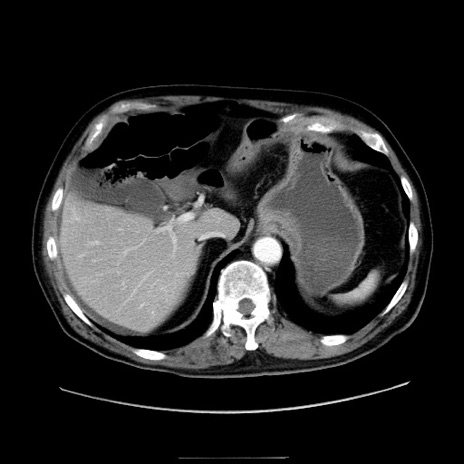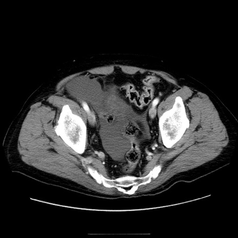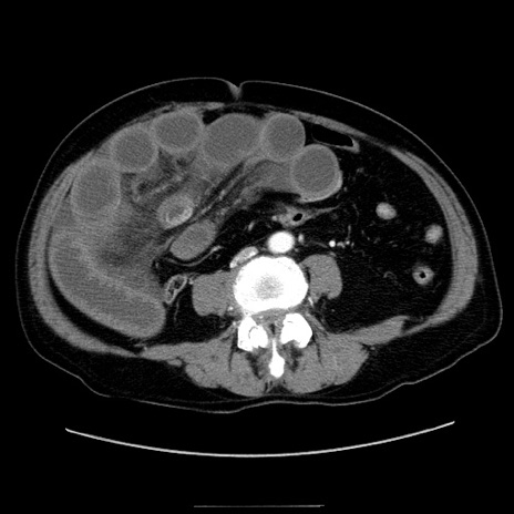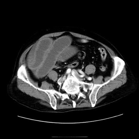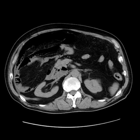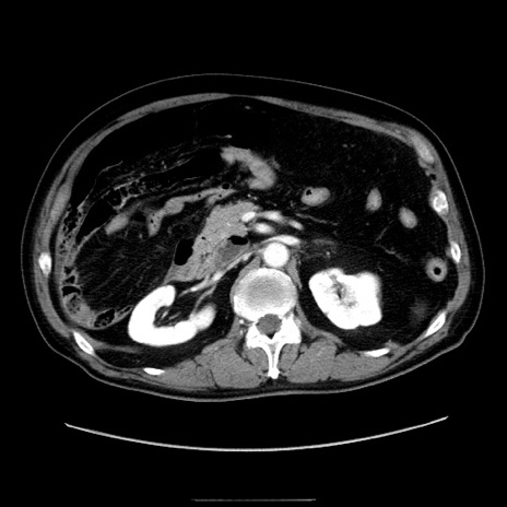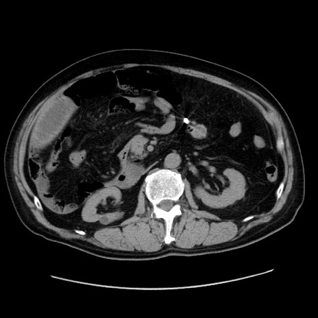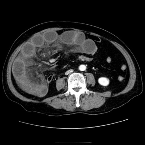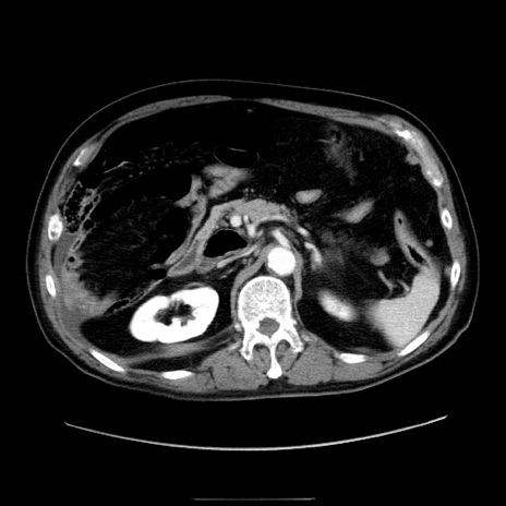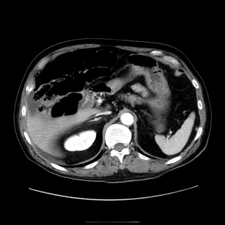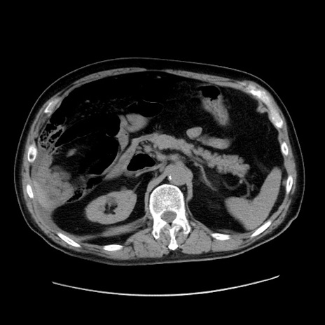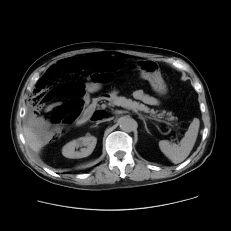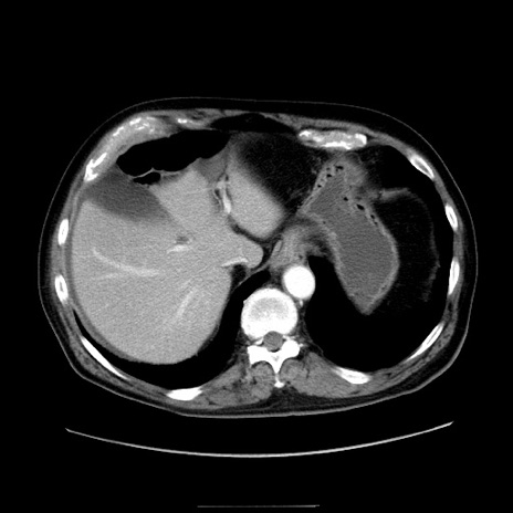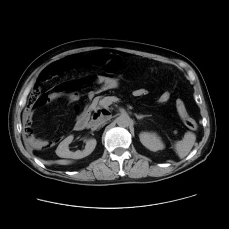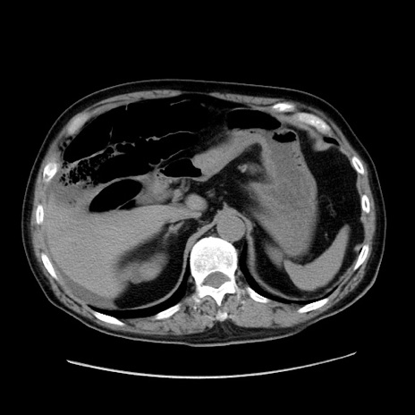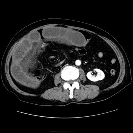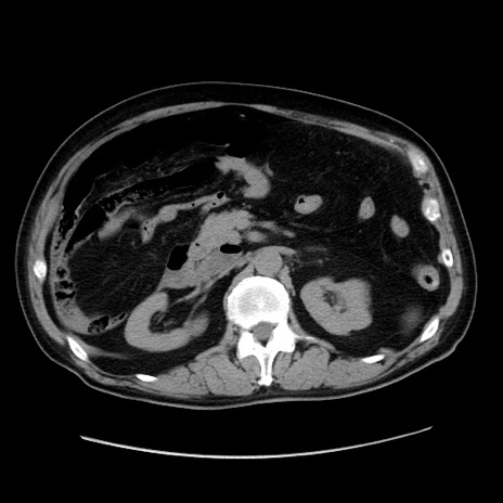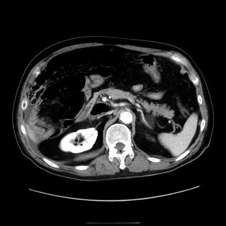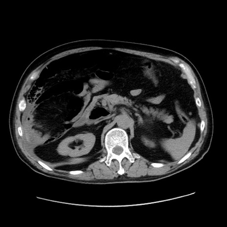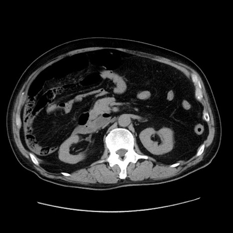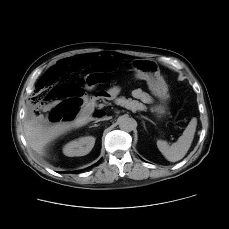 【症例】80歳代男性 【主訴】臍周囲痛 【現病歴】約6時間前から臍下部痛が出現。次第に腹部膨隆・背部痛も生じてきたため来院。背部痛の場所は変化しない。 【既往歴】腎盂腎炎 【身体所見】意識清明、BT 36.3℃、BP 131/87mmHg、P 87bpm、SpO2 100%(RA)、臍周囲自発痛・圧痛あり、反跳痛なし、自発痛部位に一致して板状硬あり、腹部膨隆、腸雑音減弱、CVA tenderness両側陰性。 【データ】WBC 19600、CRP 0.33